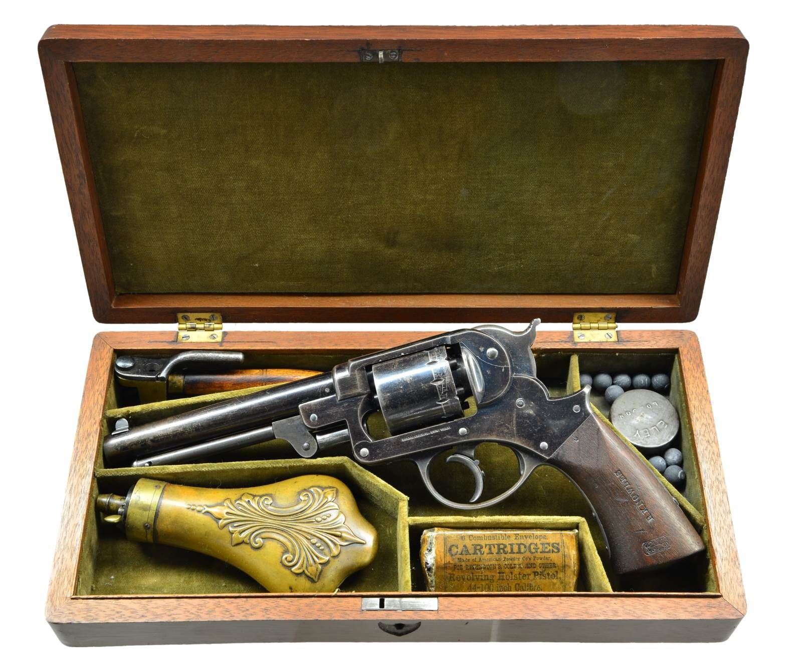 Cal. 44. S#18301. Standard configuration of popular Civil War army revolver, 6” round proofed barrel, hinged frame, maker & patent marked on either side. About 20,000 of these revolvers were purchased by U.S. Army & most saw service. This is a fine survivor, retaining most of its original finish, cased and stamped by owner “R. Knowles”. There are 20 Union soldiers that fit that initial & name and several cavalrymen among those. Casing, green baize lined, and compartmented with single cavity brass Starr bullet mold, pack of .44 cartridges, decorated brass powder flask, cap tin, and some loose 44 caliber round balls. CONDITION: fine overall, retaining about 60% blue finish, balance mottled plum/gray. Markings are crisp. Grips are well-fit w/ bright, crisp inspector cartouches. Mechanically fine w/ bright shiny bore. Casing is very good as refinished, high luster varnish, missing lock escutcheon. Cartridge pack is poor, bulging from probably being wet, but label is good. The mold has same small inspection initial “B” as found on revolver. (01-22881/JS). $3,000-4,000.
