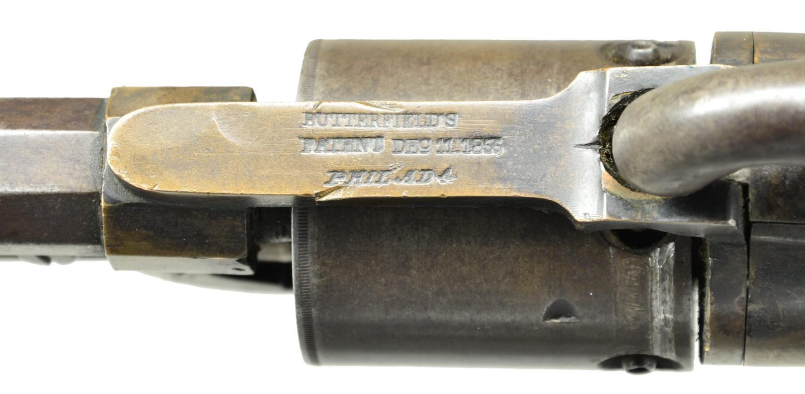 PHILADELPHIA. Cal. 41. S# 193. Bbl. 6 7/8”. This rarely seen revolver was manufactured by Jesse Butterfield of Philadelphia, Pennsylvania and is commonly called the Army model revolver. Only about 640 of these revolvers were produced from 1861 to 1862. The top of the frame is marked “BUTTERFIELD’S PATENT DEC 11. 1855 PHILADA”. This gun was originally made under a government contract for 2,280 pieces. After production of approx. 640 examples, the contract was abruptly canceled. The serial number is stamped on the barrel, butt & at the base of both grips. CONDITION: the revolver has a pleasing, though well-worn, finish. The brass has a fine mellow patina. Grips show expected wear. The loading lever, front sight & small brass nut near the trigger are replacements. The action does function, but needs adjustment. Fair bore. (01-23150/BF). $2,000-3,000.