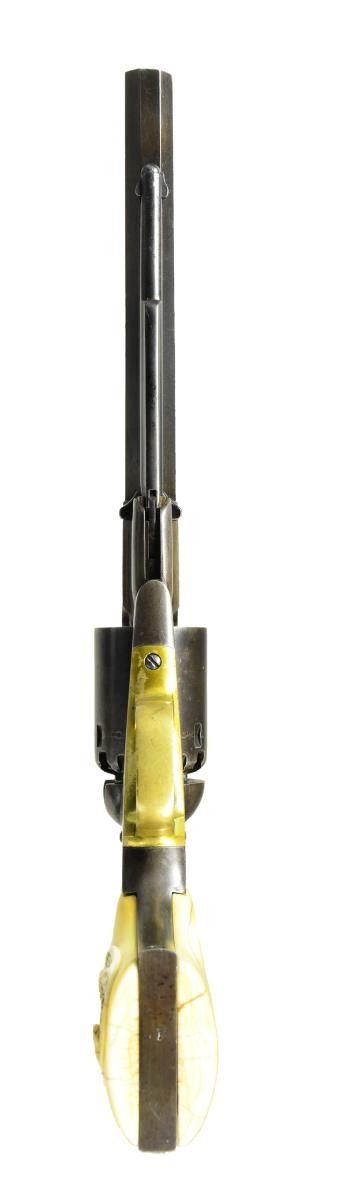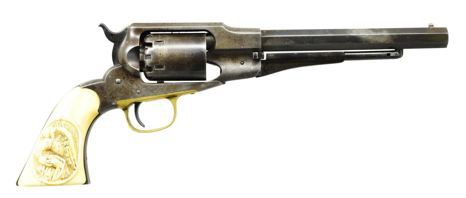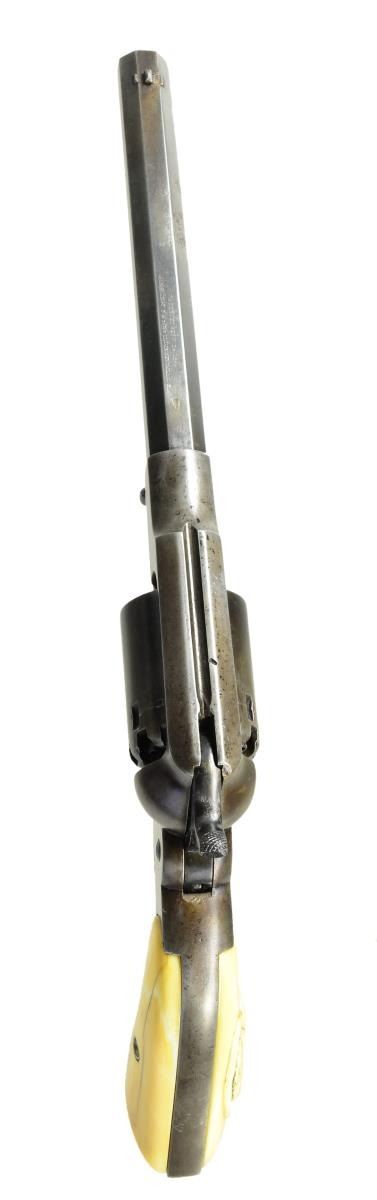 CARVED GRIPS. Cal. 36. S# 23095. Bbl. 7 1/2” octagon w/ blade sight. Six shot round cyl. Blue finish w/ brass trigger guard. 2 piece white grips. Right panel has deep relief eagle & shield carving. Total of approx. 28,000 mfg. 1863-1878. UNATTACHED ACCESSORIES: period style case. Red cloth fitted interior shows fading & wear. Ornate brass powder flask w/ viginettes of turkeys & a dog. Case also contains cap tin, case key & one wrapped six round package of combustible cartridges. CONDITION: very good. Metal finish is fading to a brown patina showing small spots of freckling & pitting. Grips show grain checks & wear having acquired a mottled yellow appearance. Sound mechanics. Lightly pitted bore retains sound rifling. (01-22882/JB). ANTIQUE. $3,000-4,000.