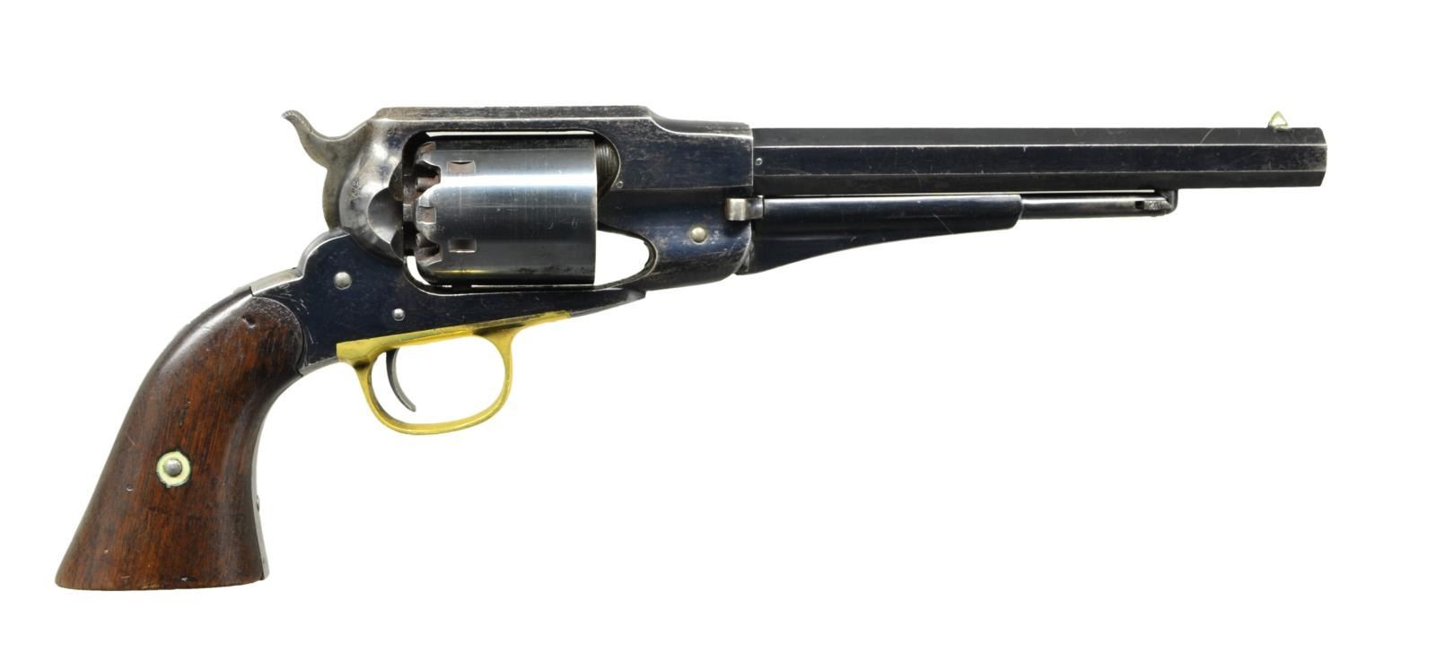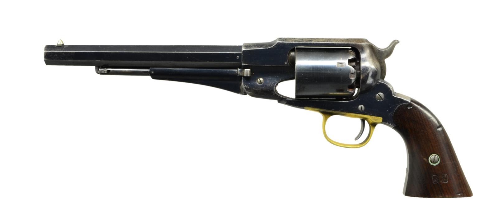 Cal. 44. S# 46479. Bbl. 8" octagon w/ cone front sight & 3 line New York address. Round six shot cyl. & blue finish w/ case colored hammer & brass trigger guard. 2 piece walnut grips w/ clear cartouche on left panel. Major parts have “C” or “H” inspection marks. Estimated 122,000 mfg. 1863-1875. CONDITION: very fine retaining over 70% bright original blue. Bbl. & frame show slight edge wear w/ spots of fading. Grip straps have faded to gray. Cyl. shows corrosion around nipples. Wood shows scattered dents & marks. Crisp action. Bore retains strong rifling showing spots of very light pitting. (01-22979/DS). ANTIQUE. $2,000-3,000.