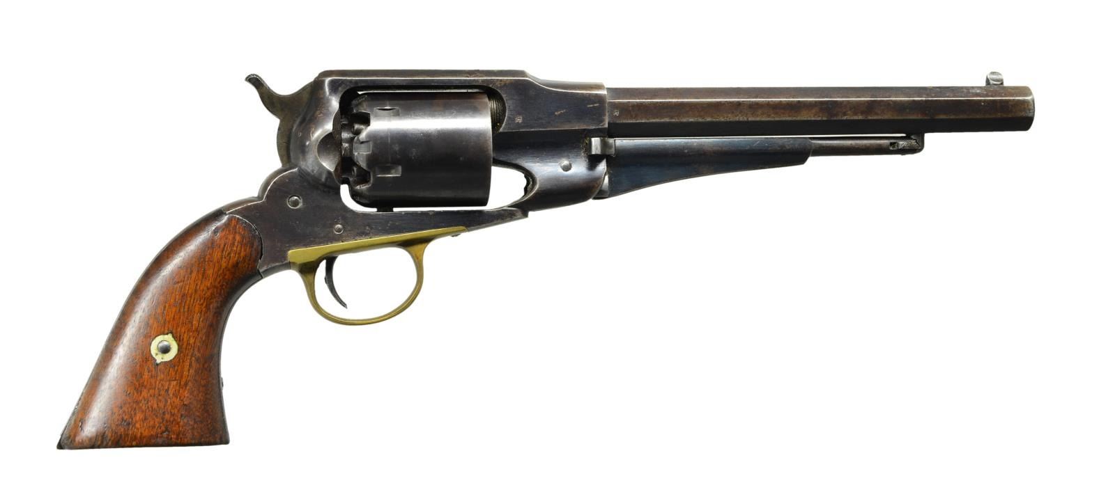 Cal. 44. S# 91776. Bbl. 18” octagon. Round six shot cyl. w/ safety notches on shoulders. Blue finish w/ brass trigger guard. Major parts have inspection marks “C”, “D” or “H”. 2 piece walnut grips, left panel has partially legible cartouche. Estimated quantity of 122,000 mfg. 1863-1875. CONDITION: fine, retaining over 70% lightly faded blue. Brass trigger guard has a pleasing patina. Refinished grips show dents & marks w/ small chips at butt of right panel. Sound action. Bore is generally bright w/ strong rifling. (01-22110/DS). ANTIQUE. $1,800-2,500.