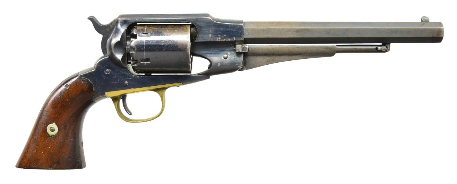 Cal 44. S#64893. Scarce civilian model 1858 Remington NM army, vast majority of these were sold to the military. Standard configuration with 8” octagonal barrel with three line barrel address. Most every part of this gun has a sub inspection letter showing that surplus military parts were used like Colt for civilian sales. The grips also have sub inspection letters on butt, but no final cartouche and varnish finish instead of militarty oiled grips. CONDITION: very good to fine. Revolver retains much of its original blue finish especially on frame and cylinder. Moderate small dents and gouges on right side of frame forward of cylinder and right side bottom of barrel just forward the frame, light dragline on cylinder. Grips are well fit with small chip on right inside toe. Action is fine with bright crisp rifled bore. (01-21846/JS) ANTIQUE $1500-2000.