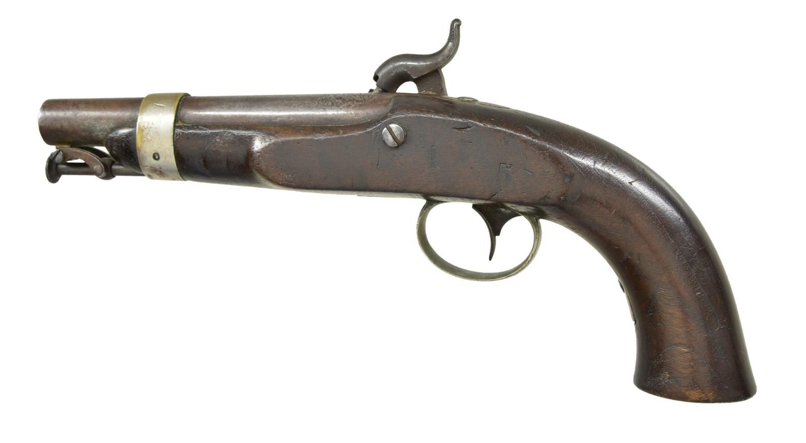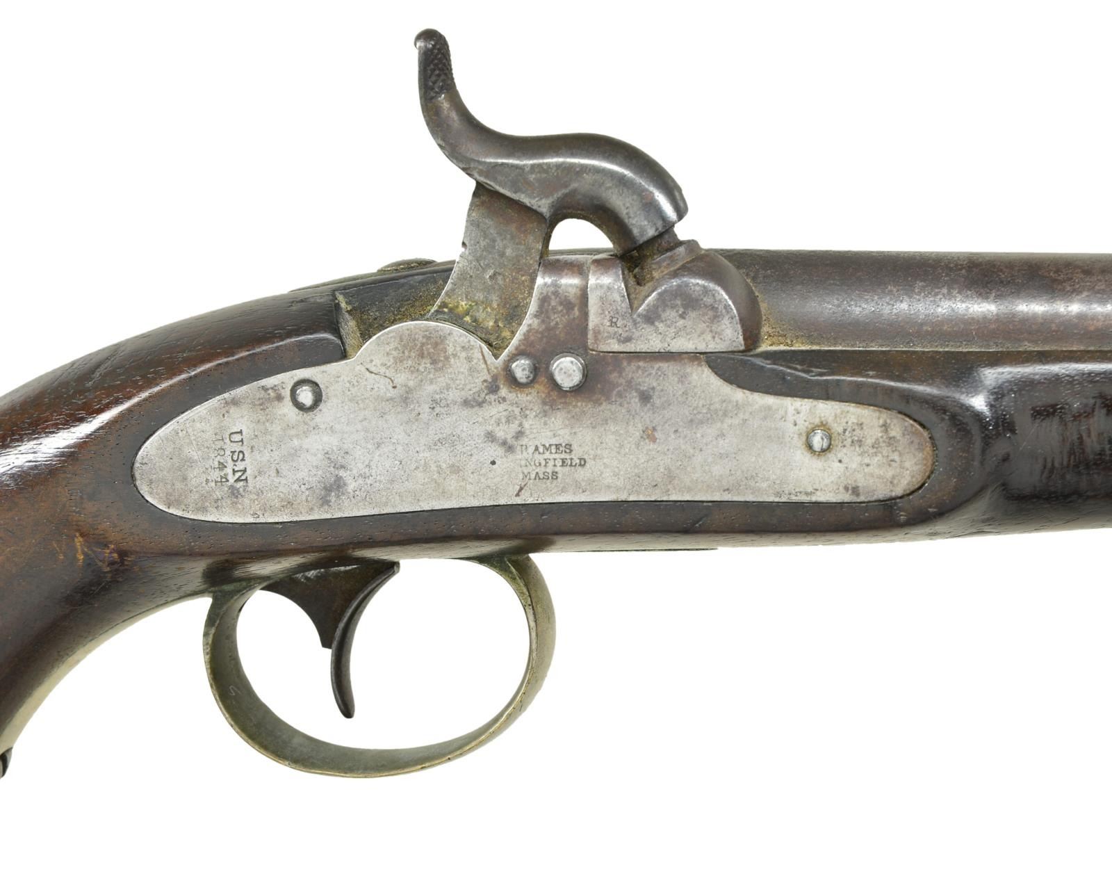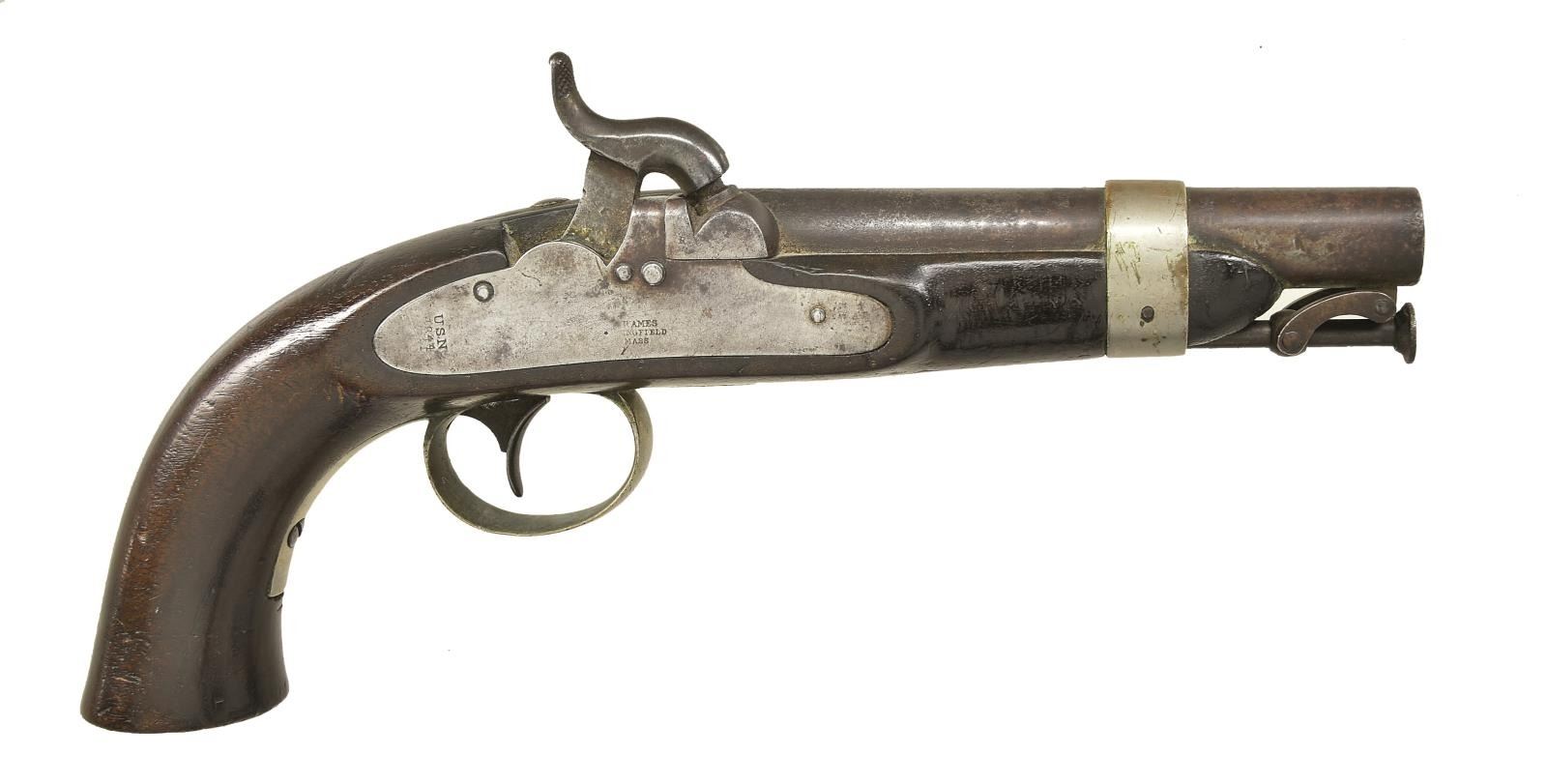PERCUSSION PISTOL. 54 Cal. NSN. Standard configuration, 12” overall, 6” round barrel proofed “USN / 1845 / RC / P” at breech, nickel plated brass furniture, lock under hammer “N. P. AMES / SPRINGFIELD / MASS” & “USN / 1844” at tail, captured swivel loading assembly. 2000 of this 1st American percussion pistol contracted by Ames, plating was later done by navy department and not contractor. CONDITION: very good overall, original & complete, stock sound with scattered cosmetic bruises, heavy edge wear, mechanics fine, smooth clear bore. (01-21476/JS). ANTIQUE. $1,500-2,500.