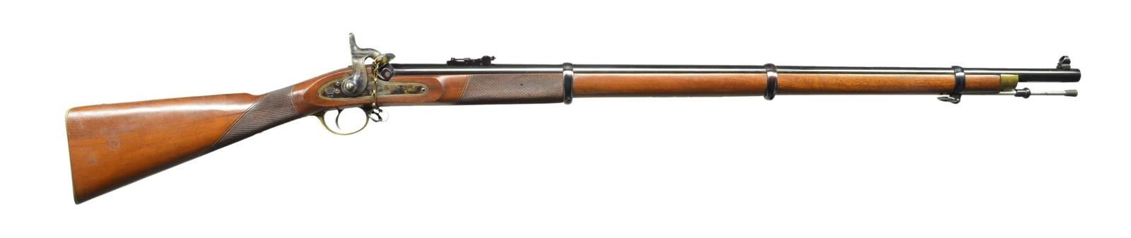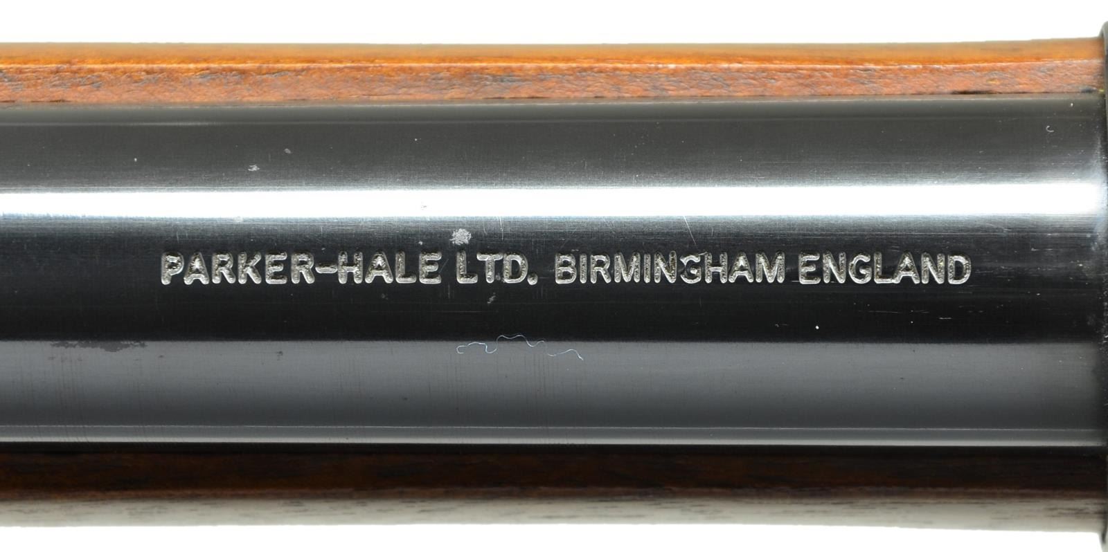 Cal. 451. S# 743. Bbl. 36”. This rifle appears new and unfired, dates from 1970s, made in Birmingham, England, not the more recent Italian made copies. Breech “Sir Joseph Whitworth Patent Rifling-451 Cal”, top of barrel “PARKER HALE LIMITED. BIRMINGHAM ENGLAND” , proofed “crown / BP”, checked stock, 3 blued steel clamping bands, brass furniture just like the Civil War era version, long range ladder rear sight & hooded pin front sight. CONDITION: Excellent, barrel retains virtually all original bright blue, lock retains most all it case hardened colors, appears unfired, crisp action, bright mirror like hexagonal bore. (01-22912/JS). ANTIQUE. $1,500-2,000.