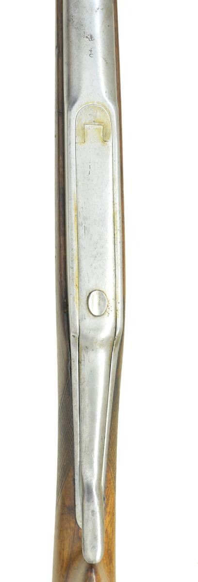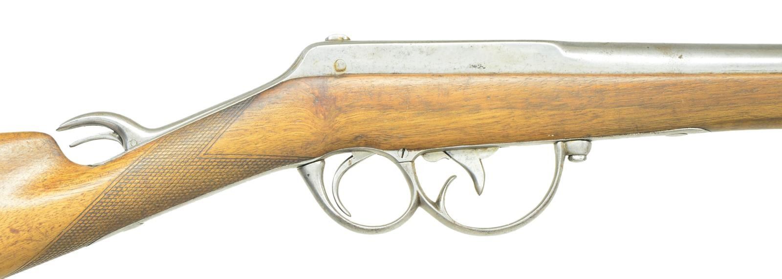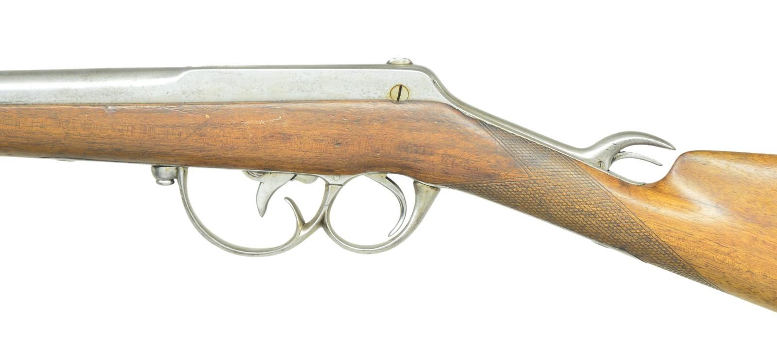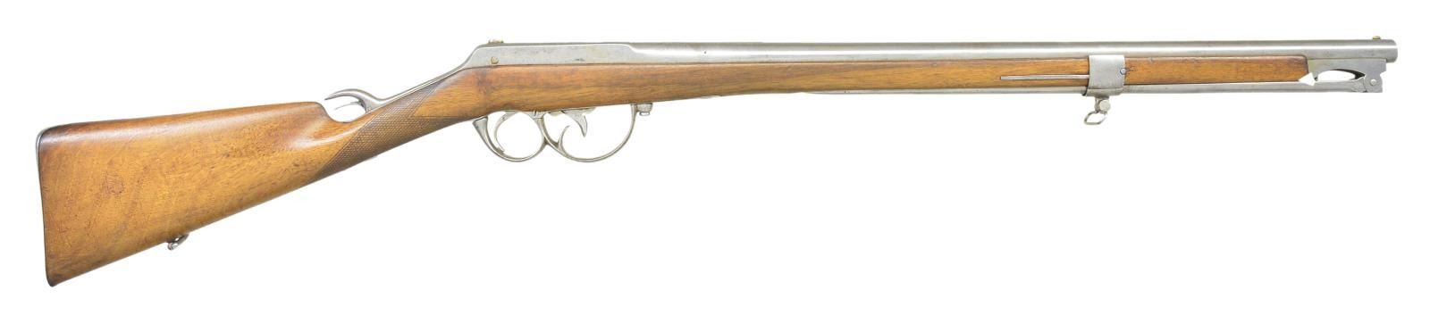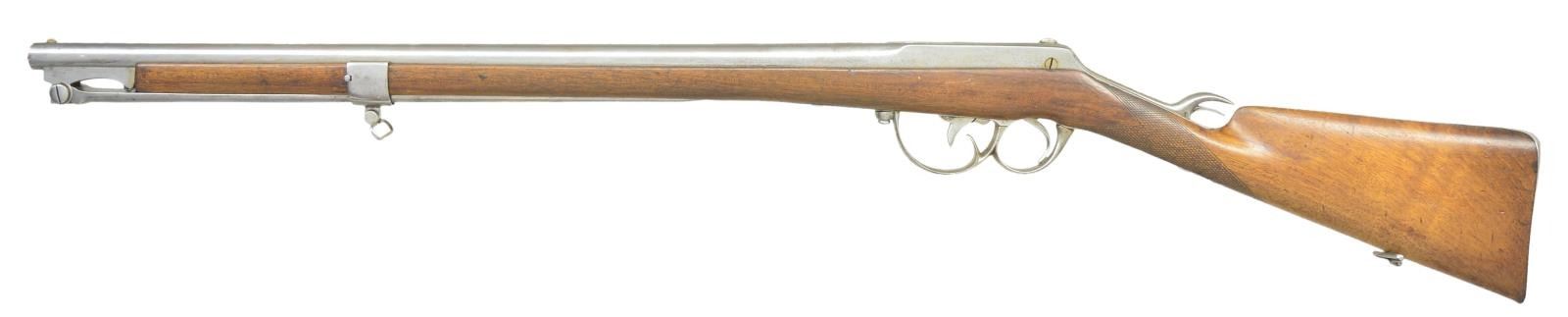 CARBINE. Cal. 67. S# 40. Bbl. 24 1/2" smooth bore. Fixed open rear sight. Brass blade front sight. Bbl. marked on top w/ S# & what appears to be a partial Belgian proof mark. This self-cocking "Needle Fire" carbine is operated by lifting a lever which retracts the breech mechanism & is commonly referred to as a "Monkey Tail" action. Brass breech face. Hammer is mounted underneath action & is rotated forward to cock. Receiver & bbl. are made in one piece. Carbine is equipped w/ integral 18 3/4" blade folding bayonet which is extended by retracting the bbl. band & swinging the bayonet down & forward. European walnut stock w/ checkered grip. Bbl. band has military type swivel. Buttstock equipped w/ sporting swivel. Steel buttplate w/ sporting type tang. Boxed "Musee de L'artia" museum property mark. CONDITION: stock has worn original finish w/ staining & scattered handling marks throughout. Metal finish in the white turning gray w/ wear & spots of peppery oxidation throughout. Needle is missing forward portion of tip. Bore is dark w/ light pitting. PROVENANCE: From the Raymond Darida Estate. (01-2225/RW). ANTIQUE. $2,000-3,000.