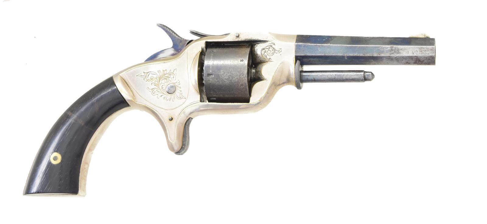 9" overall, solid silverplated brass frame, blued tapered octagonal barrel with British proofs, no maker marks other than "G*W" & "0" on grip frame. Silver plated heavy solid German silver frame, shrouded spur trigger, unique design spring loaded hand on top strap that holds cylinder when cocked, ebony grips, sparse scroll engraved. Mahogany casing, with blue baize lined compartments, large paper label inside lid: "GEO WEBB / Gun, Rifle, and Pistol Maker / No. 19 / High Street / Oxford". Case retains steel cleaning rod, added pack of Winchester cartridges with illustrated label.