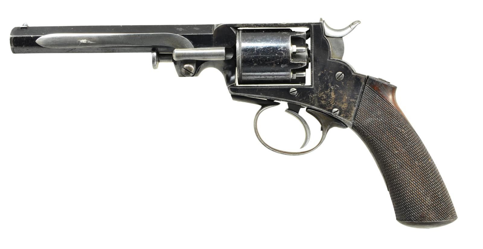 PERCUSSION ARMY REVOLVER. Cal. 54bore (.46 cal.). S# NSN. Bbl. 6.25”. 12.5” overall, 6.25” unmarked barrel. These large bore army revolvers were popular among military officers worldwide. There are several with known Confederate associations. This example is in very fine condition retaining most of its original blue finish. The revolver has engraved frame lines and no other maker’s markings observed. There are British viewing proofs on each cylinder chamber and on barrel. CONDITION: Fine overall, retains virtually all its original blue on barrel & cylinder, and majority of its blue on frame. Small gap between frame and grips due to top screw not binding. Double action mechanism functions well, bright shiny bore. (01-22981/JS). ANTIQUE. $2,000-3,000.