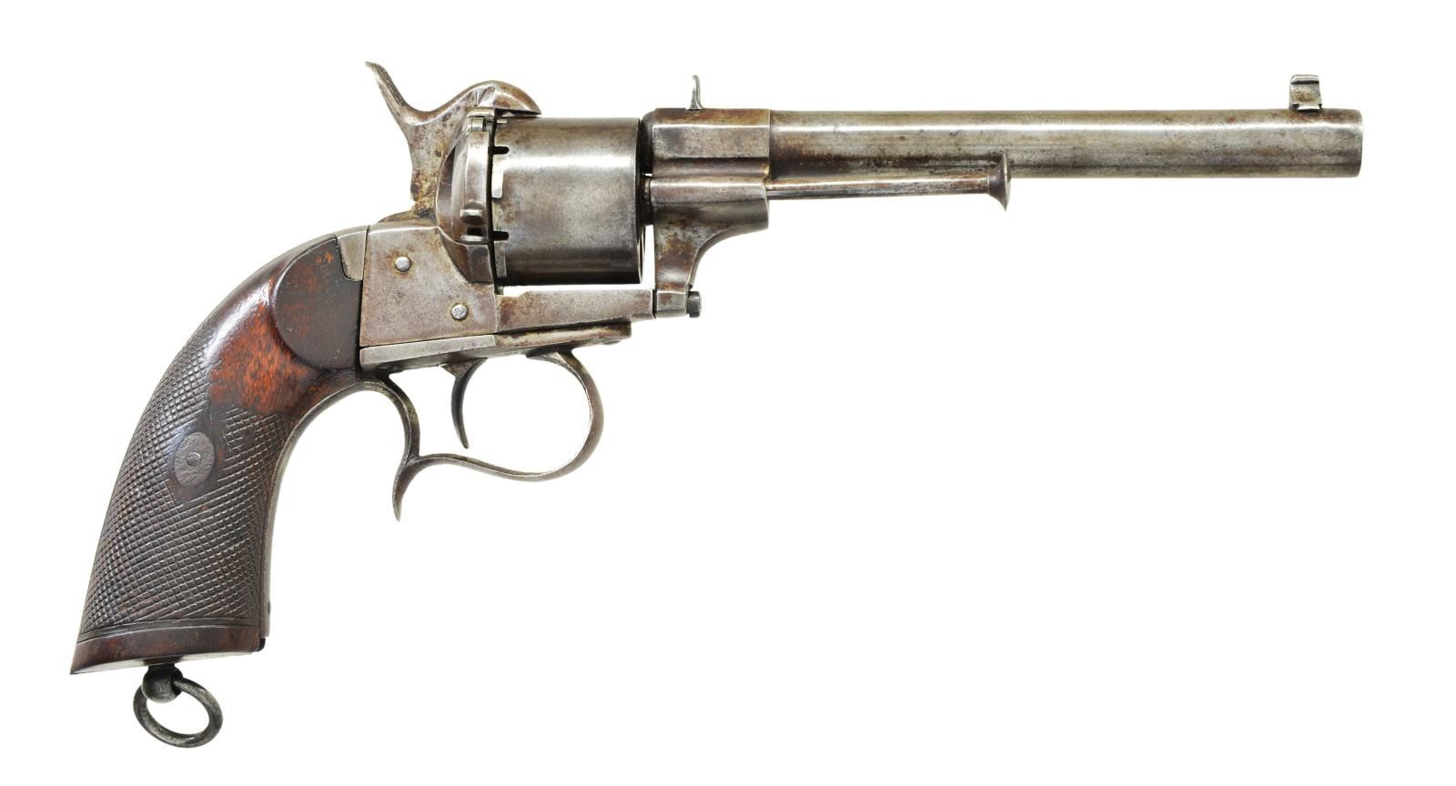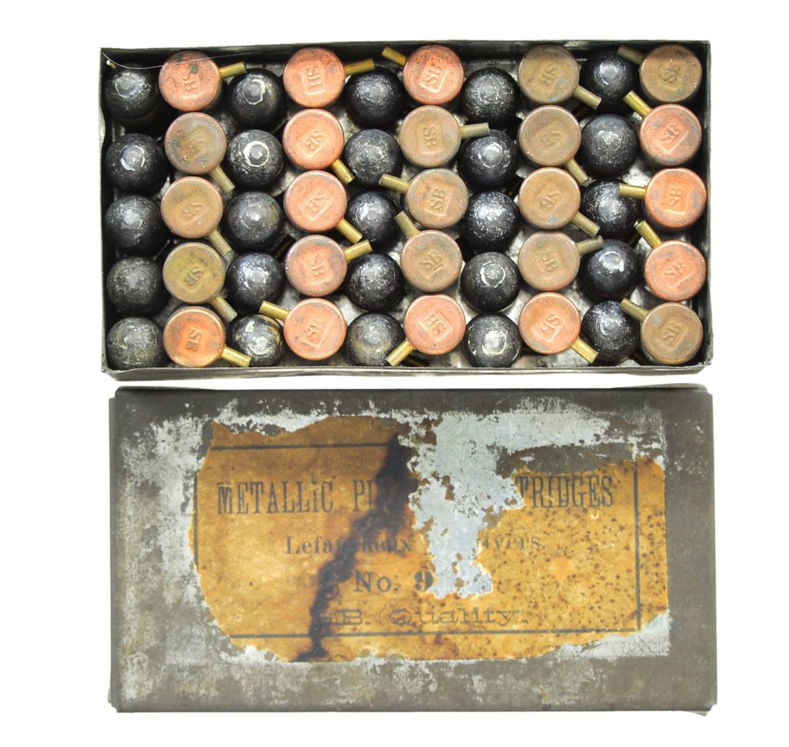 CARTRIDGES. Cal. 9mm. S# NSN. Bbl. 6.25”. Standard configuration of Civil War era Liege made pinfire revolver, 10.75” overall, 6.25” round barrel stamped “E. LEFAUCHEUX / INVr BREVETE”, high fixed rear sight, checkered grips, spur trigger guard. “C.H. WILCOX” stamped in butt. There are 11 soldiers found in Civil War database with that name. However, there is documentation included stating this revolver belonged to Charles H. Wilcox of the 57th Massachusetts. Cartridge tin is full of 50 “SB” head stamped cartridges, “Sellier & Bellot” cartridges made in Prague for English speaking market, starting in 1870. UNATTACHED ACCESSORIES: full 50 round tin of 9mm cartridges with damaged paper label & later Tennessee ammunition tax stamp. Documentation including 1985 signed affidavit that this revolver belonged to Charles H. Wilcox, 57th Massachusetts. Along with copies of his service records & correspondence concerning the revolver. CONDITION: good to very good overall, no finish, good markings, chip in backstrap, traces of original varnish, mechanics fine, discernible rifled bore. (01-22359/JS). $1,500-2,500.