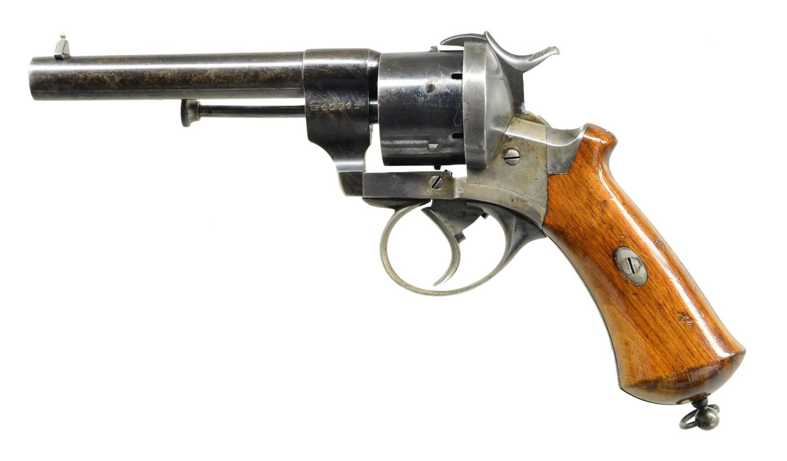 Cal. 12mm. S# 13712. Bbl. 5 1/8”. Eugene LeFaucheux was selling many revolvers to both US & CS agents in 1862, when he patented this triple action mechanism that he hoped would increase military sales. It was popular in smaller bore 7mm & 9mm but turned out too fragile for military use in field. In addition to being able function as single action (SA) & double action (DA). A third action was when trigger pulled halfway cocking revolver, a notch held locking hammer & allowing free movement of cylinder to reload, or just have gun ready to continue fire in either SA or DA with shorter pull. These military models are not often seen and this is a fine survivor retaining most of its original finish. CONDITION: Fine, revolver retains most of its original blue on cylinder & barrel, and muted case colors on frame faded to silver/gray. Barrel address is crisp. Grips retain almost all their factory varnish. Mechanics crisp in SA, DA, and triple action. Bright shiny rifled bore. 01-22357/JS). ANTIQUE. $2,000-3,000.