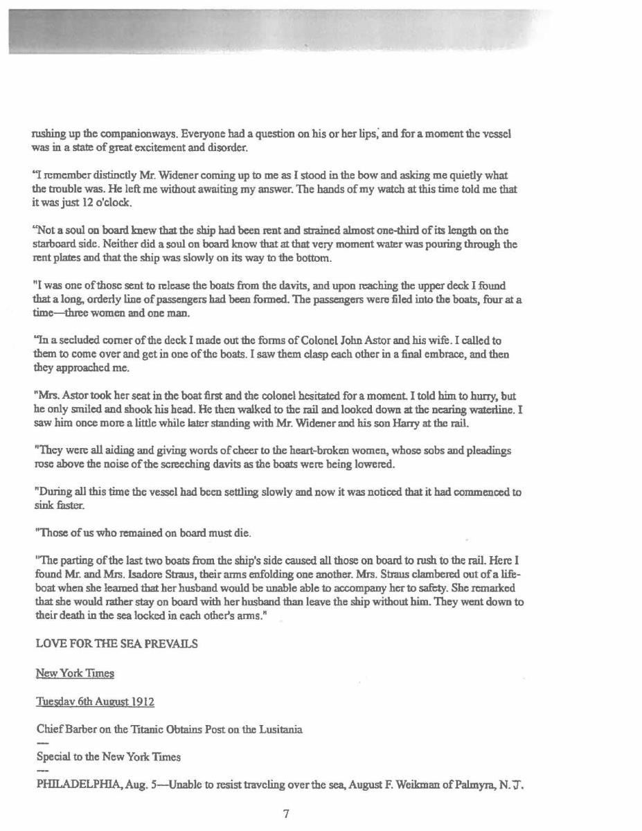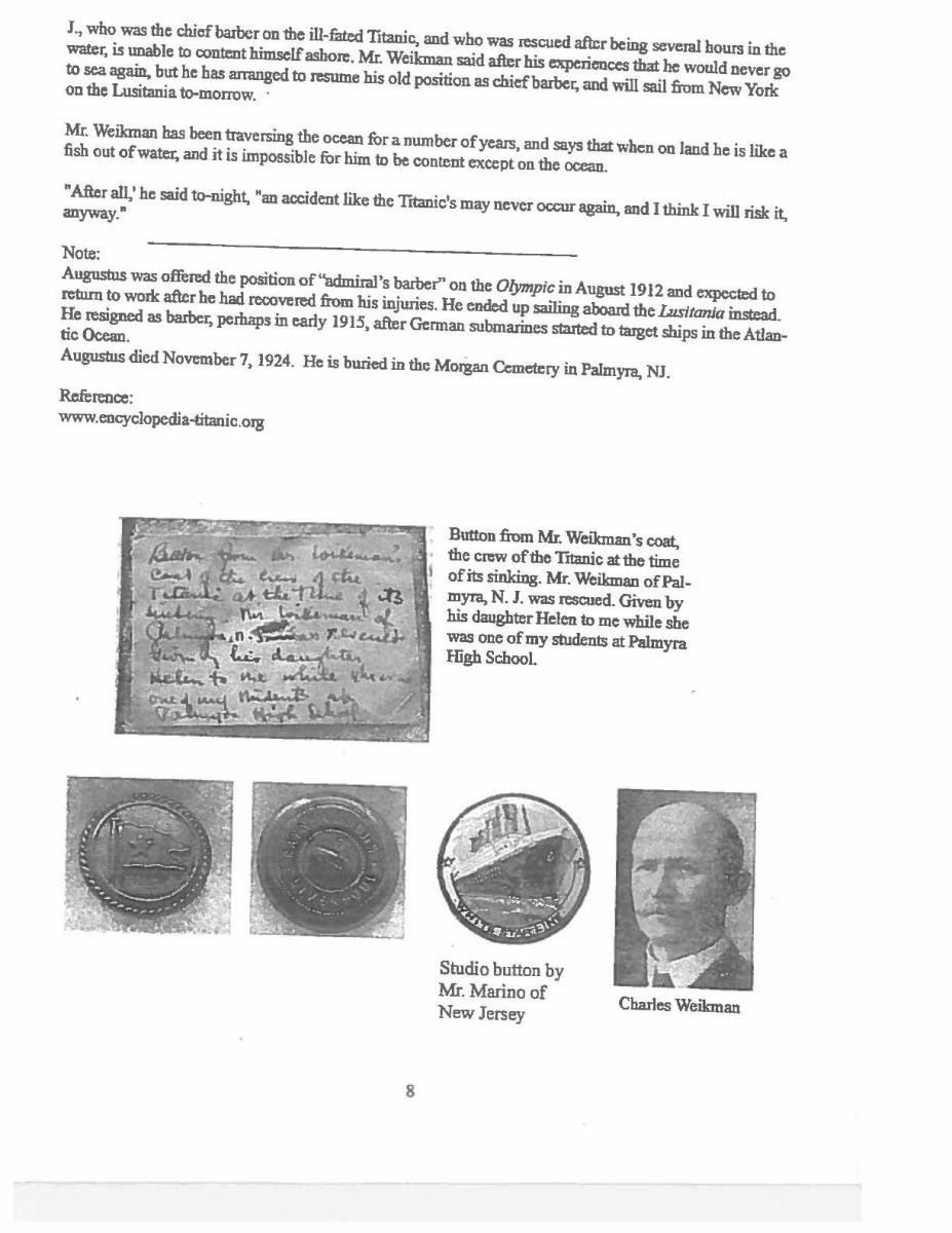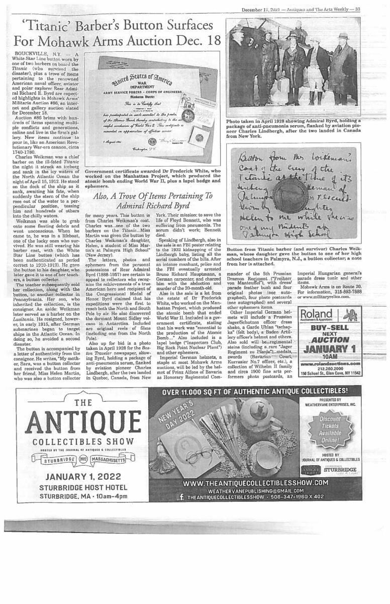 BUTTON FROM A SURVIVOR OF THE TITANIC. This button represents an incident infamous in the annals of maritime history, the sinking of the RMS Titanic. This button was worn by the chief barber onboard named Charles Weikman from Palmyra, NJ. On the night of April 12, 1912, the Titanic struck an iceberg and proceeded to sink in Arctic waters. Charles Weikman was ordered to prepare the lifeboats for passenger evacuation. Subsequent to the entire compliment of lifeboats leaving the ship the remaining crew gathered on the top deck. Weikman reports hearing terrible cries as the stern of the ship slowly sunk toward oblivion. During the final death throes of the great ship the stern rose out of the water to a nearly perpendicular position. At this point, Weikman was thrown into the water clear of the sinking. He attempted to make his way toward floating debris as the boiler exploded during the ship’s sinking. The ensuing wave cast him up on a small floating island of wreckage. Shortly thereafter he lost consciousness and awoke to being rescued by one of the many lifeboats. A button worn by Weikman on his uniform during his ordeal is offered here. The button depicts a White Star Line company flag with a rope border. The reverse is marked “RAYNER & SONS . LIVERPOOL . “, which is correct for the 1910 to 1912 period when Titanic was outfitted. The button also has a letter D next to the shank. It is attached to an original card, inscribed with a dip pen, that reads “Button from Mr. Weikman’s coat of the crew of the Titanic at the time of its sinking. Mr. Weikman of Palmyra, N.J. was rescued. Given by his daughter Helen to me while she was one of my students at Palmyra High School.” UNATTACHED ACCESSORIES: several pages of provenance and news stories about the button. There is a notarized letter from a previous owner of the button as well as documentation from a previous sale of the button. CONDITION: the button has a pleasing patina with traces of gilt remaining. The shank is straight and the back mark is clear. The attached note is quite yellowed attesting to its age, but the inscription remains clear. (02-18118/BF). $2,000-3,000.