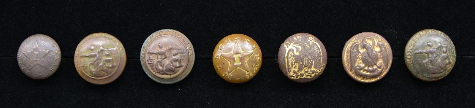 This fine group includes 1 AB-3-type dug at Bermuda Hundred, VA. / 1 TX-10-A. / 1 MP-4-A. / 1 LA-8-type dug at Dinwiddie Courthouse, VA. / 1 NC-8-D. / 1 NC-8-B with no shank. / 1 NC-8-A. CONDITION: all buttons are excavated and show dark patinas. Many have traces of gold remaining on the buttons, please refer to photos. All buttons have shanks, except as noted. (02-18117-2/BF). $2,200-2,600.