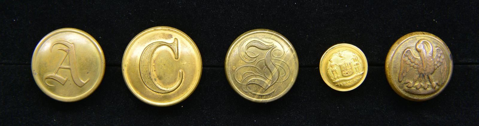This group of non-excavated buttons includes 1 CS-107-A1. / 1 CS-126-A. / 1 CS-175-A2. / 1 LA-8-D with traces of cloth attached to the shank. / 1 MD-11-Bv. This is a transitional button used during the war and in the early years of reconstruction. CONDITION: all buttons are in non excavated condition with pleasing patinas and some have traces of gold gilding. All buttons have straight shanks. (02-18117-3/BF). $1,700-2,100.