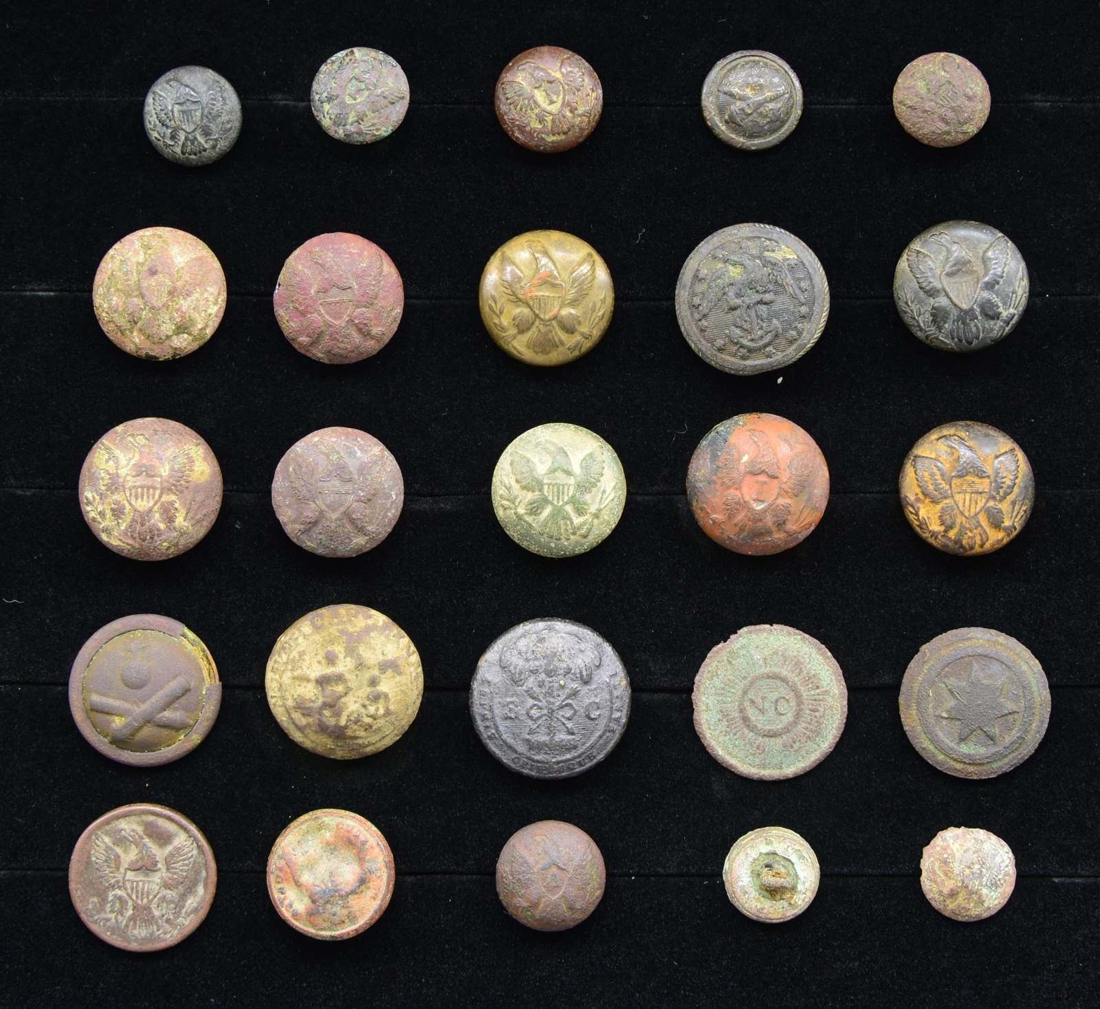 2) ANTEBELLUM THROUGH MID-20TH CENTURY. This interesting group contains 2-CS-86 type buttons. In our opinion the more legible button is original and the well worn example is an early reproduction. / 1 Small Naval interlocking buckle (tongue only) possibly for a Naval dirk. / 5 Large Civil War Navy buttons. / 4 Large MS-26-A1 buttons with resoldered shanks. / 1 Large RI-7 button with an Evans back mark. / 1 MS-35-type button. / 1 Yankee staff. / 8 Cuff sized Yankee buttons. / 1 Cuff sized transitional VA-13-type button. / Approximately 83 post Civil War uniform buttons of various types. Most are American with a couple foreign examples and most are not excavated with a few dug examples. CONDITION: all buttons generally show light wear except as noted above. (02-18188-1 & 02-18188-2/BF). $1,000-1,450.