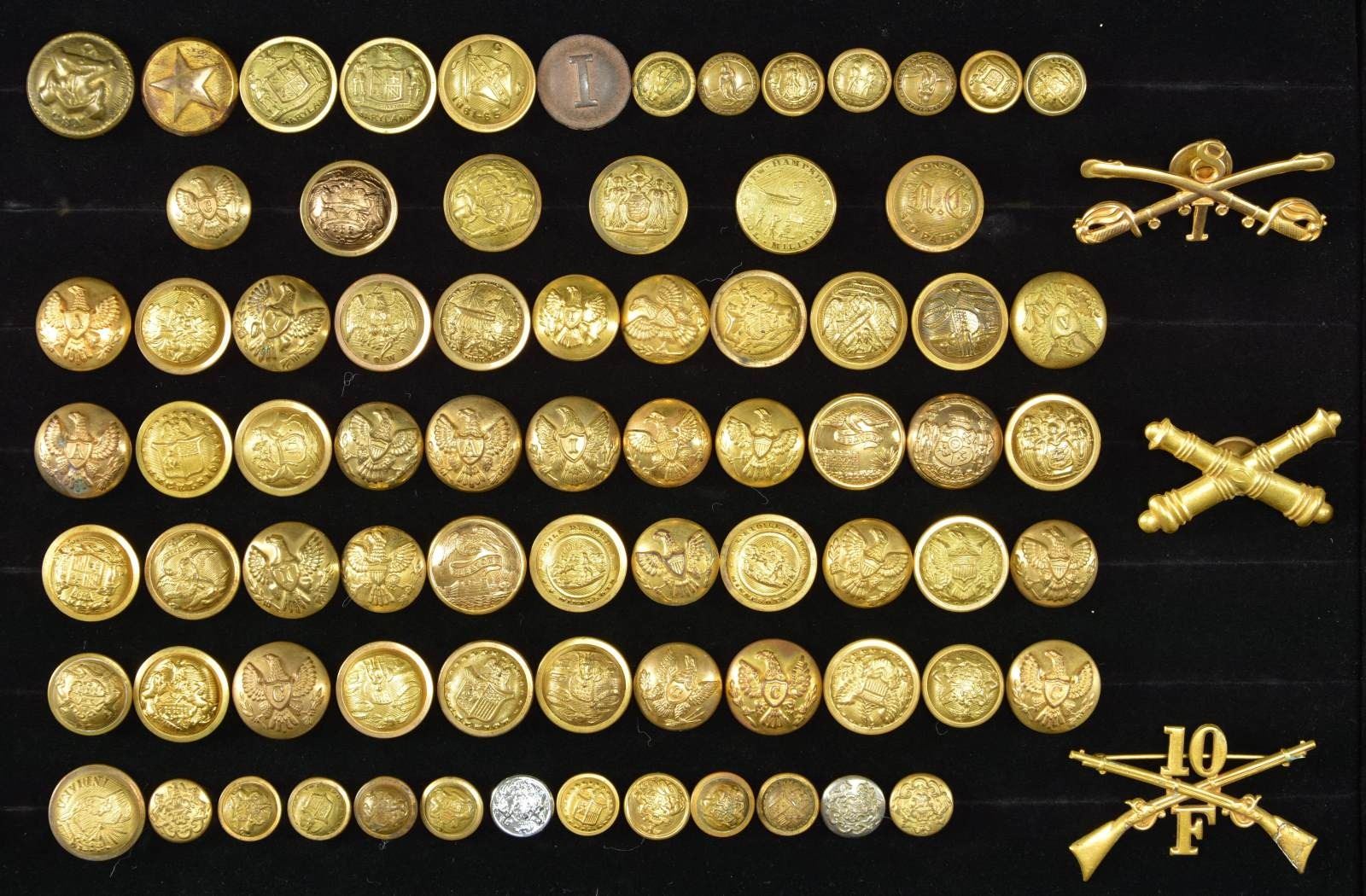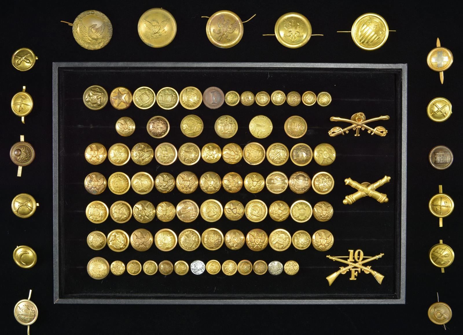 3)This varied group of buttons includes 2 post war Maryland coat buttons. / 1 UCV staff coat button. / 1 Post war Texas militia button. / 1 Reproduction Confederate “I” button. / 1 Reproduction Confederate Navy button. / 4 Post war Virginia cuff buttons. / 1 Post war Maryland cuff button. / 1 Post war Kentucky cuff button. / 1 Post war Tennessee cuff button. CONDTION: all buttons show light wear. (02-18117-5/BF). $300-500.