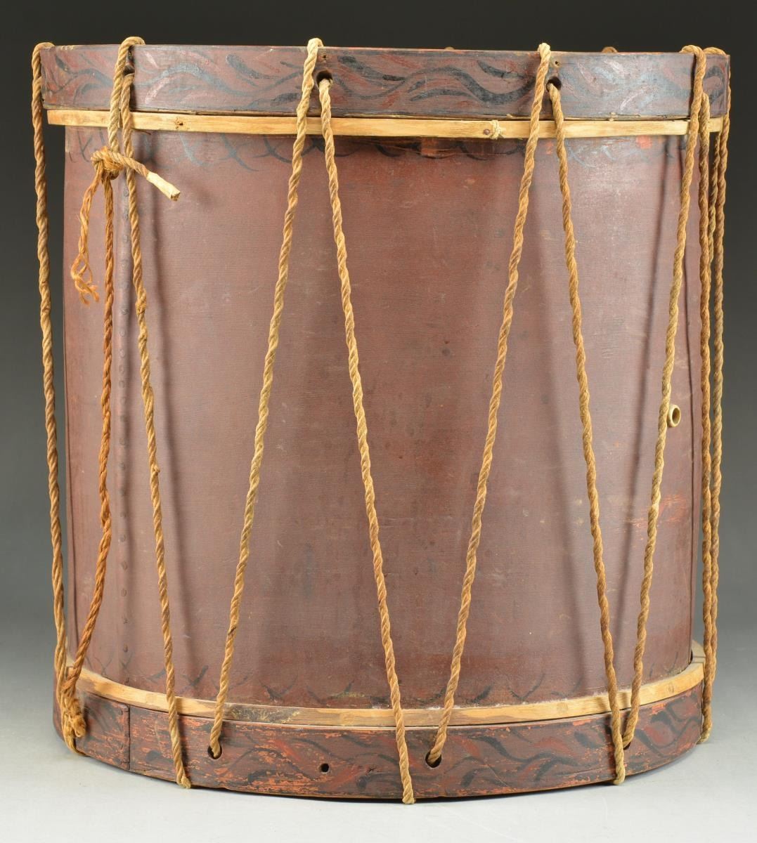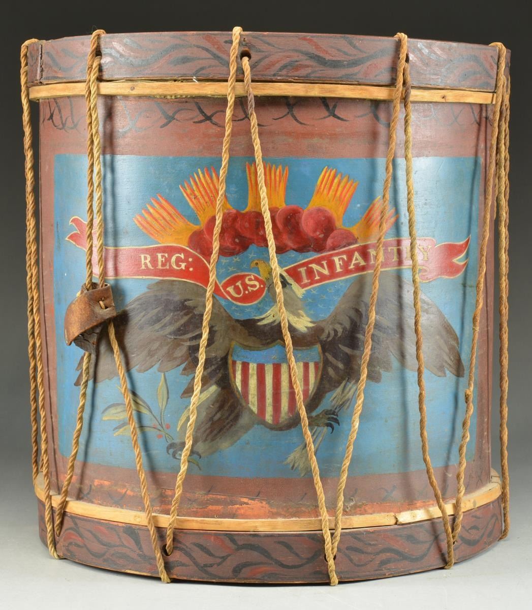 This drum measures approx. 17 1/4" high with a diameter of 17". The drum is signed with a dip pen on the inside “S. Osgood Raymond, NH”. It is quite likely this drum was made before the Civil War and pressed into service by a New Hampshire or possibly Maine infantry regiment before they left the state. The rims and top of the drum have black flourished decoration and the center of the drum has a painted eagle holding a ribbon that reads “REG: U.S. INFANTRY”. The painted section measures approx. 18" x 10 1/2". The ropes show great age and are possibly original to the drum. There is only one tightener remaining on the ropes. The top skin appears original but has warped out of shape and needs to be steamed and reset. The bottom skin is a reasonably modern replacement. A fine large drum with a visually impactful appearance and a wonderful centerpiece for any collection of American militaria or Americana. CONDITION: painted colors remain sharp but show some wear. Ropes are mostly intact with some broken strands. Top skin is warped but complete. A very solid drum. (02-18998/BF). $2,500-4,000.
