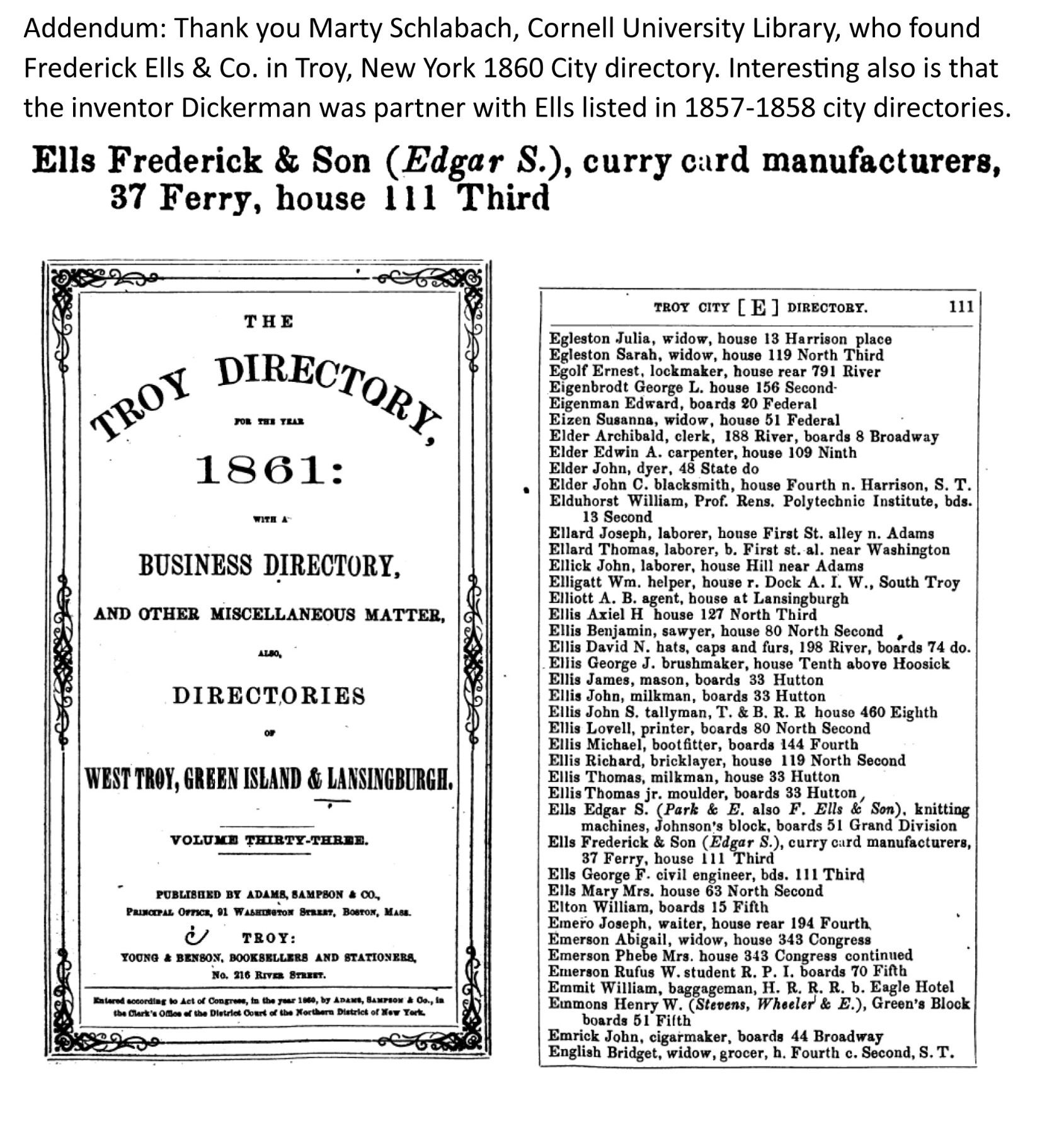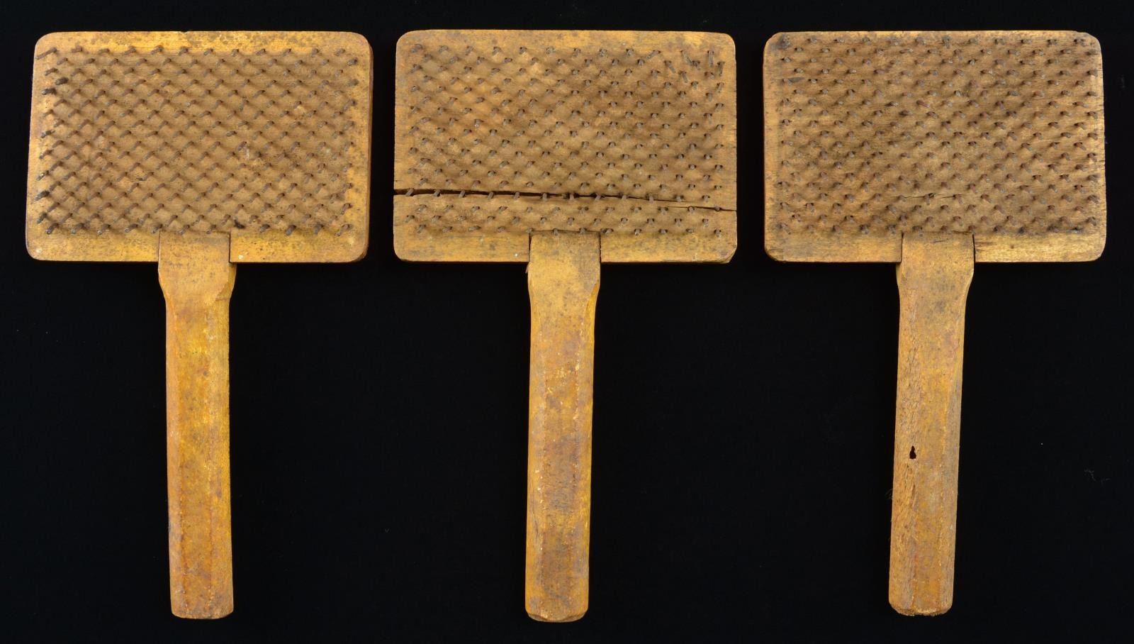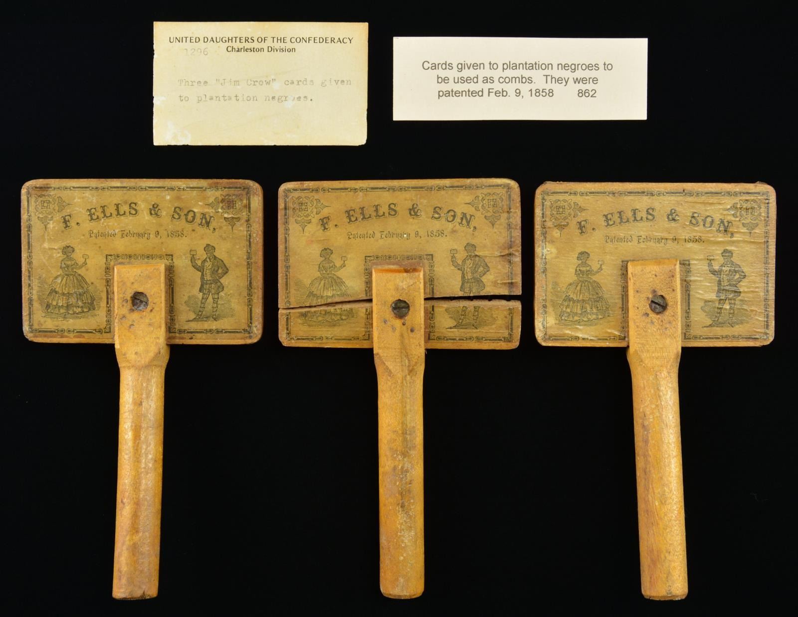 HAIR COMBS. Each 6.5” long with attached handle, card 3.8 x 2.6” with about 350 iron pins. Illustrated paper label has elegantly dressed African American lady & gentleman each holding one of these combs. We could not find “F. ELLS & SONS” but did find the Feb. 9 1858 patent by C. Sumner Dickerman of Lansingburgh, NY. Patent for Improved hand-card for currying horses, cattle and other purposes. The display cards from museum read “Three “Jim Crow” cards given to plantation negroes to be used as combs” We can not find reference to another of these very rare African American cultural items. Deaccessed from Charleston Confederate Museum for restoration fund. CONDITION: very good overall, one of the three combs is cracked through where screw attaches handle. The manuscript descriptive note is cracked with losses. Soiling and light staining. PROVENANCE: Deaccessed from Charleston Confederate Museum for restoration fund. (02-19464/JS). $1,000-3,000.