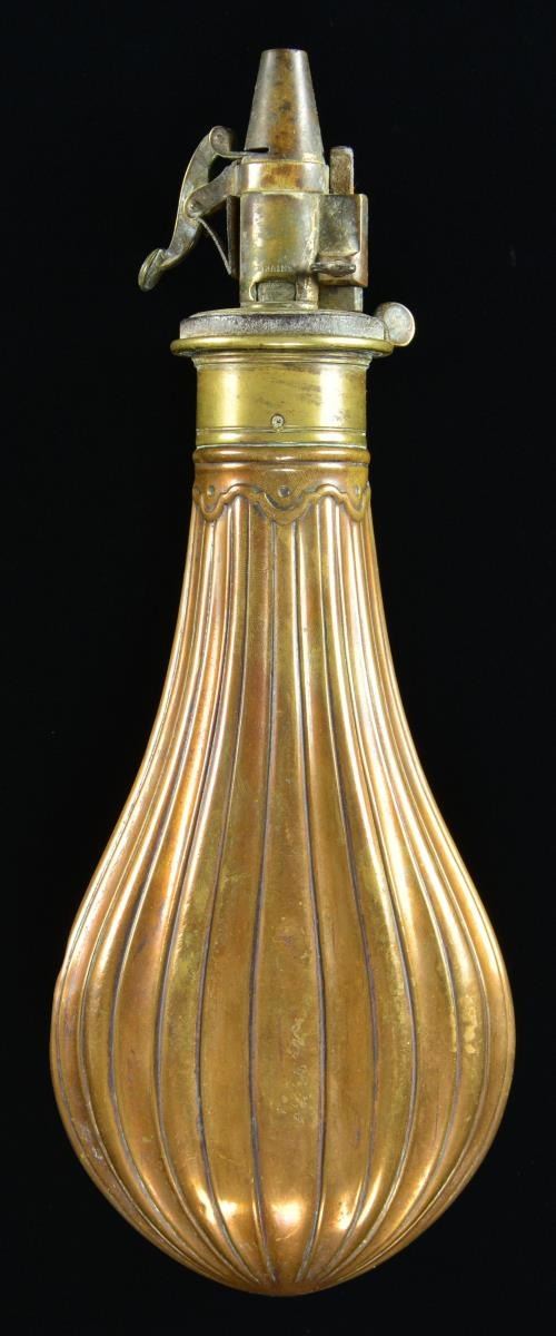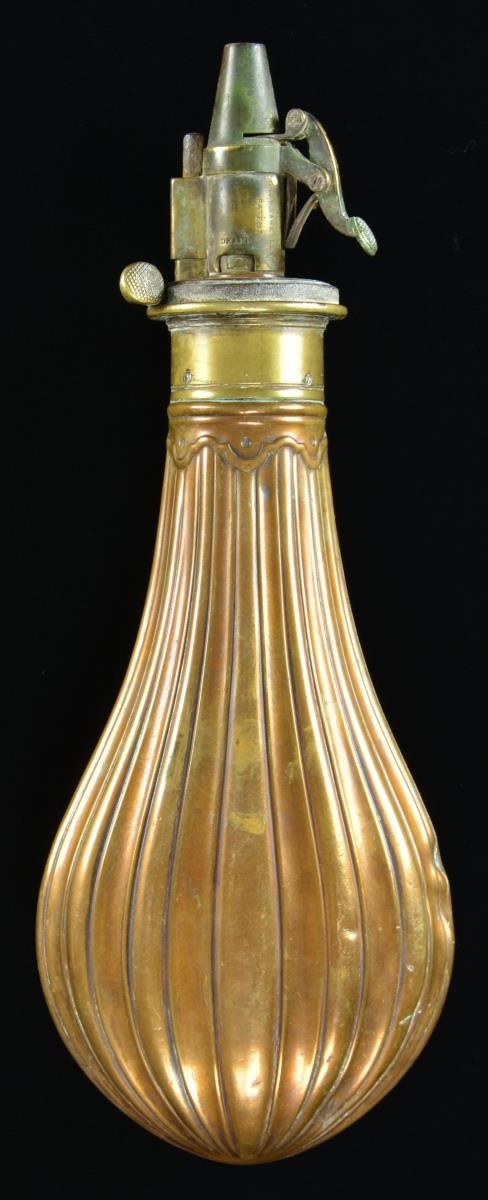 Civil War Era powder flask. Flask is Marked on top w/ "G & J W HAWKSLEY". Flask has brass head w/ fluted copper body & adjustable powder measure; graduated in both grains & drams. Grams extend to 4 3/4 max. Grains extend to 110. Measure terminates in tapered spout. Measure portion is marked "G. & J.W. HAWKSLEY PATENT". CONDITION: body of flask has cleaned patina w/ light wear, staining & scattered sm. dents w/ 1 notable dent along the seam. Brass flask head & measure have partially cleaned dark patina w/ areas of oxidation. Springs are intact & measure appears to function correctly. (02-19526/RW). $350-550.
