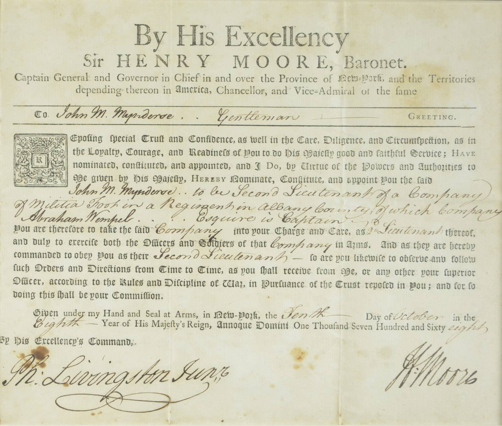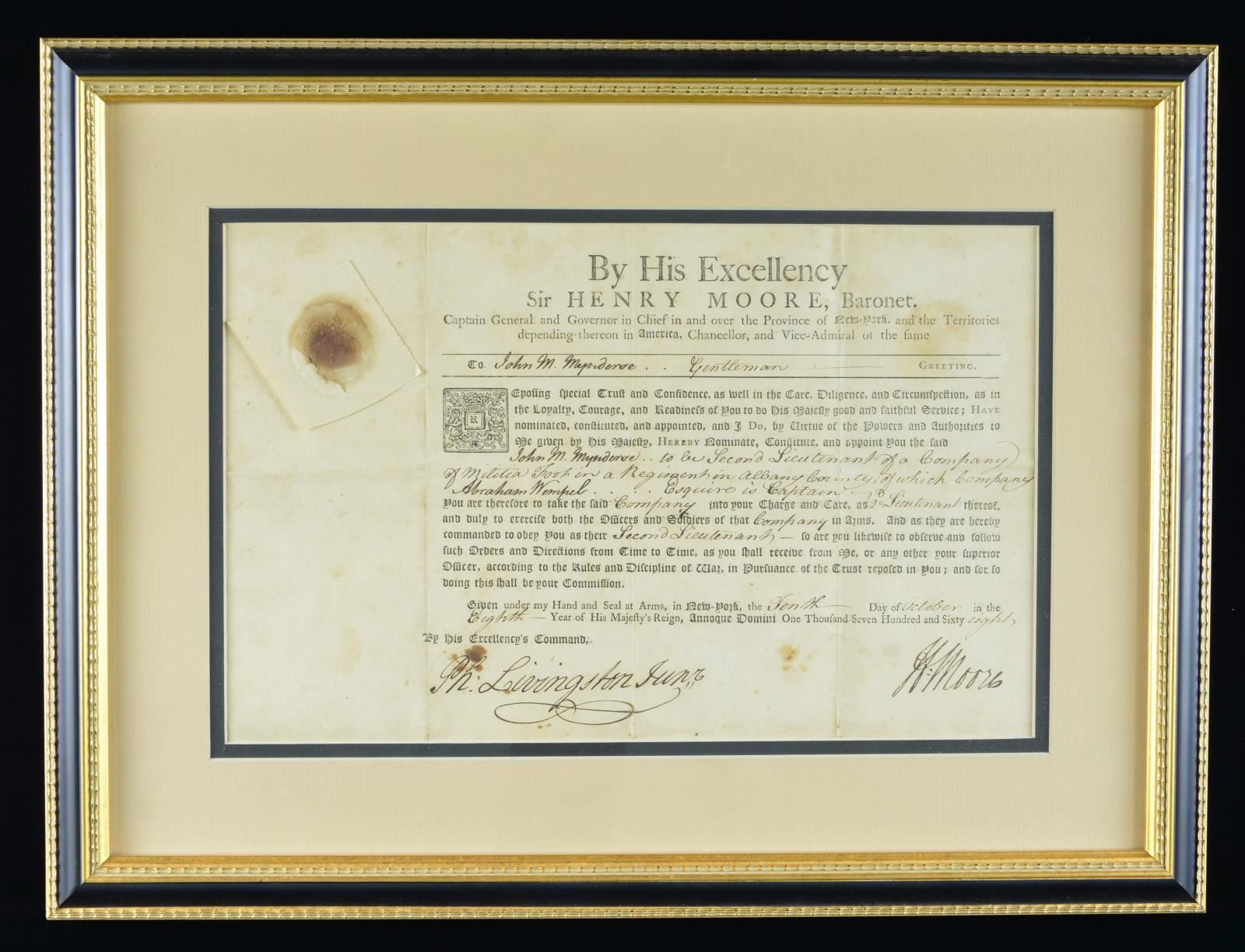 FROM 1768. This framed commission from Sir Henry Moore, Governor in Chief of New York, is to John Mynderse as a 2nd Lieutenant of a company of Militia Foot in a regiment based in Albany County, New York. The date of the commission is October 10, 1768. The commission is signed by Sir Henry Moore and Ph. Livingston Junr. The frame measures 18 1/2" x 14” and the commission measures approx. 14” x 9”. CONDITION: document has some foxing but is not faded and is quite easy to read. The handwriting is quite legible for the period. (02-19577/BF). $600-1,000.
