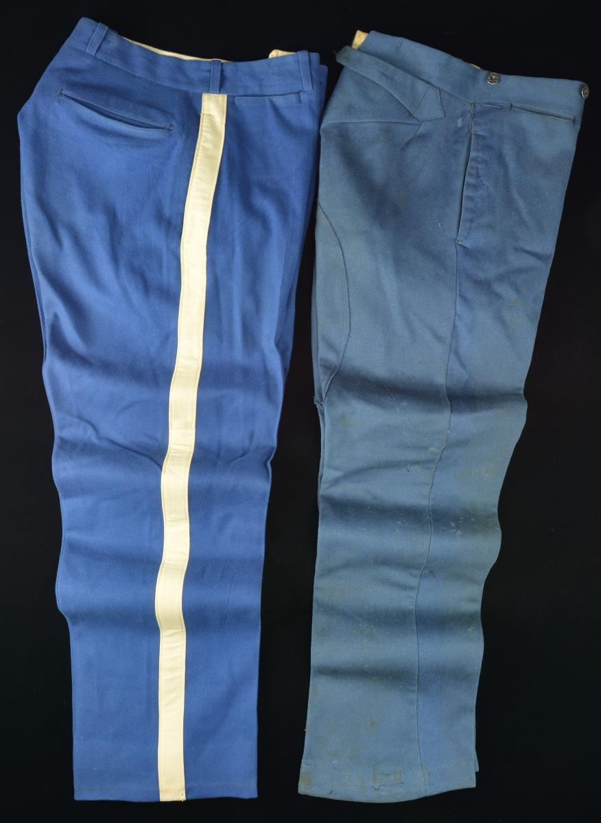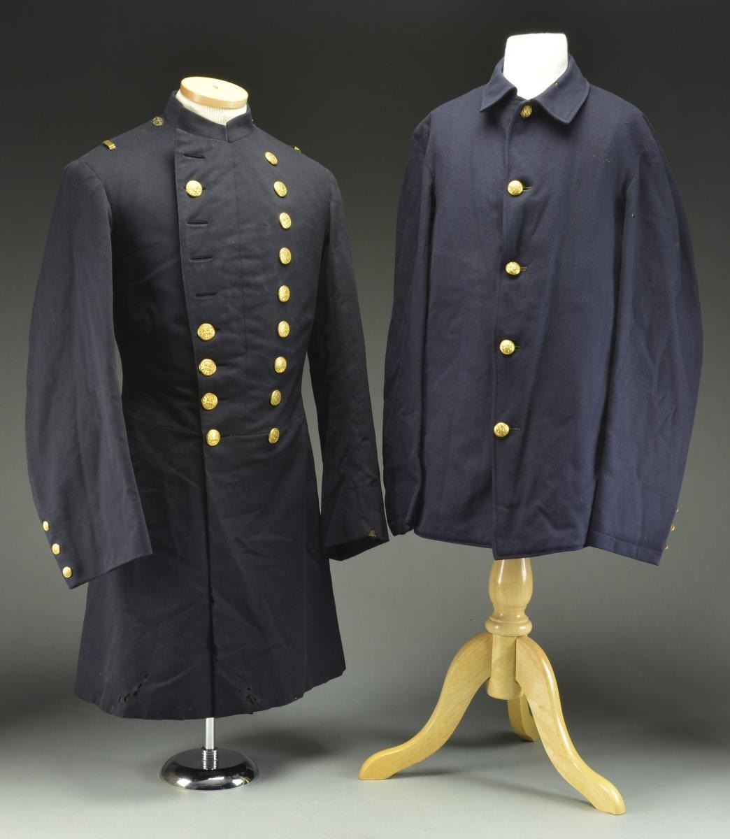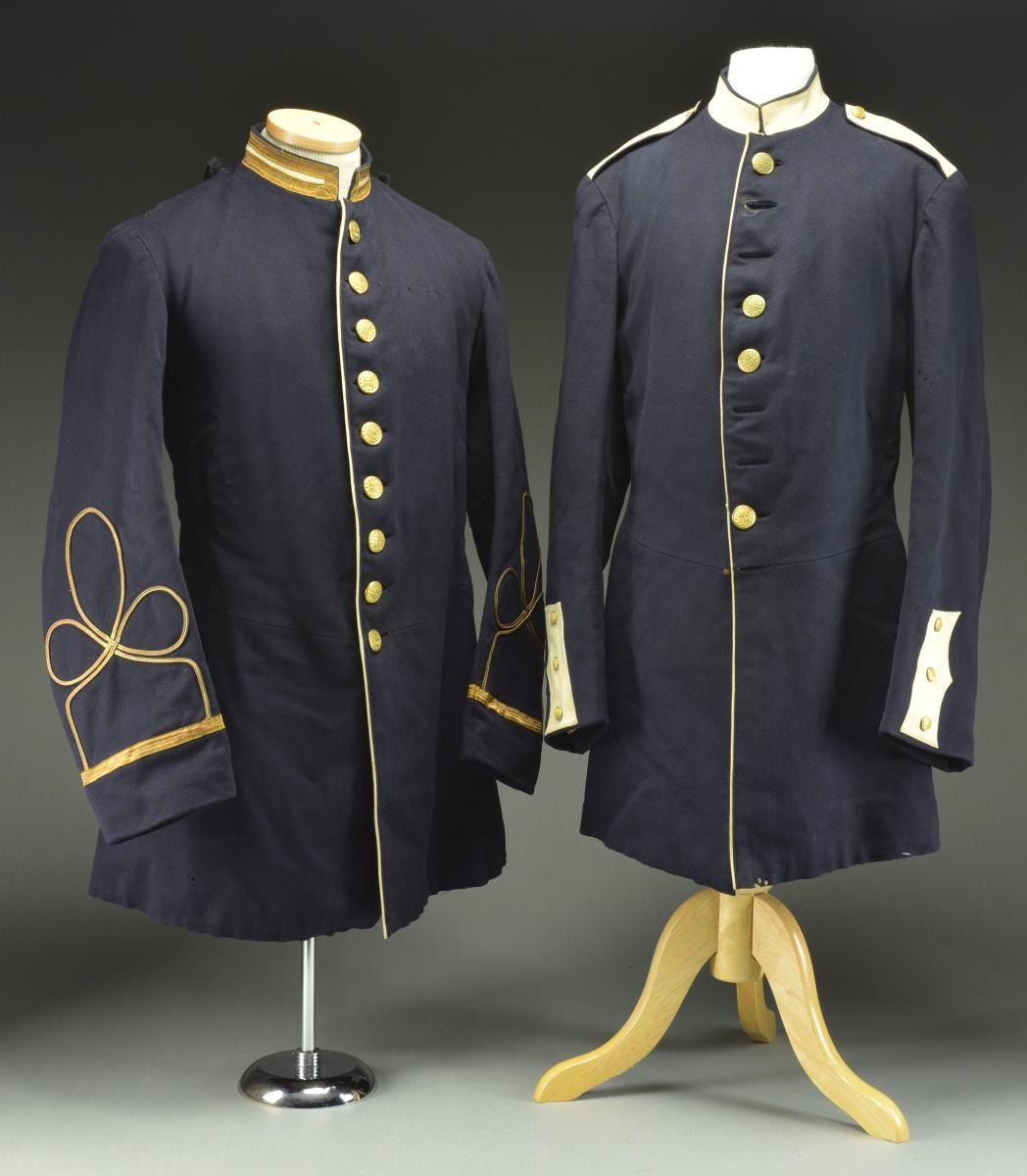ASSOCIATED WITH THE KENTISH GUARD OF RHODE ISLAND. This group of uniforms appears to date from the 1880’s to just past the turn of the century. Most of the uniforms seem to have an association with the Kentish Guards, a well known Militia organization from East Greenwich, RI. The group includes 1 Officer’s frock coat with white & gold bullion collar trim. There is one row of bullion adorning the sleeves. There are 9 Kentish Guard buttons down the front and 6 on the tail. The interior is lined with white cotton. / 1 Private’s frock coat with white shoulder tabs, white cuff trim, and white piping. The 9 button coat is missing 5 buttons but 3 loose buttons are attached to the coat. The cuff buttons and shoulder tab buttons are small Kentish Guard types. There are also 6 coat sized Kentish Guard buttons on the tails. The coat is lined with white polished cotton and is quilted. / 1 Enlisted sack coat with 5 1872-1902 buttons down the front and 3 incorrect staff buttons on each sleeve. Coat has a sewn hem and a dark blue wool lining. / 1 Dark blue officers double breasted frock coat with 18 buttons down the front (4 missing). Each cuff has 3 small Kentish Guard buttons and the tail has 4 coat sized buttons. The shoulders have sewn on attachments for epaulets. Black polished cotton lining with some quilting. / 1 Pair of blue wool pants with 1" wide white wool stripes down the outside of each leg. Pants have a 5 button fly and provisions for a belt. / 2 Pair of blue wool trousers with an adjustment strap at the rear waistband. 5 Button fly on one and 4 button with a snap on the other. / 1 Officers belt & buckle dating from 1880-1902 complete with sword straps and M1851 style buckle made by Henry V. Allien. CONDITION: all uniforms show some degree of wear and most have some moth damage. Several buttons appear to have been resewn or replaced. One of the blue wool pants has severe moth damage. (02-18135-2/BF). $600-900.