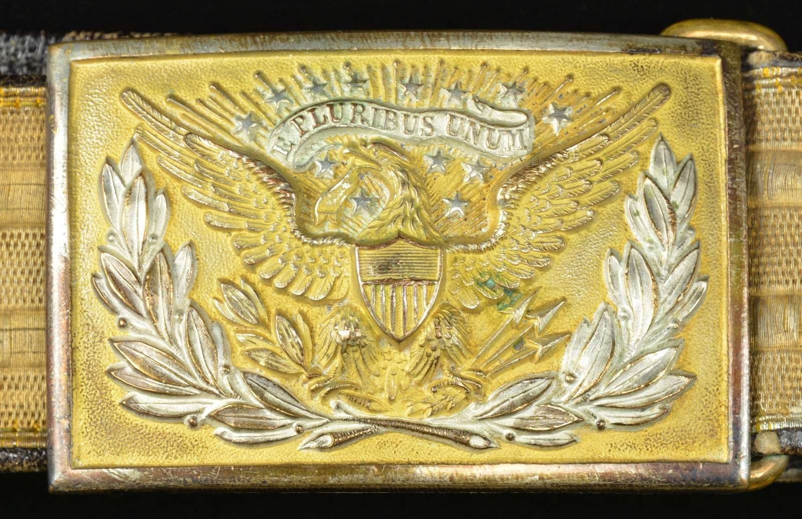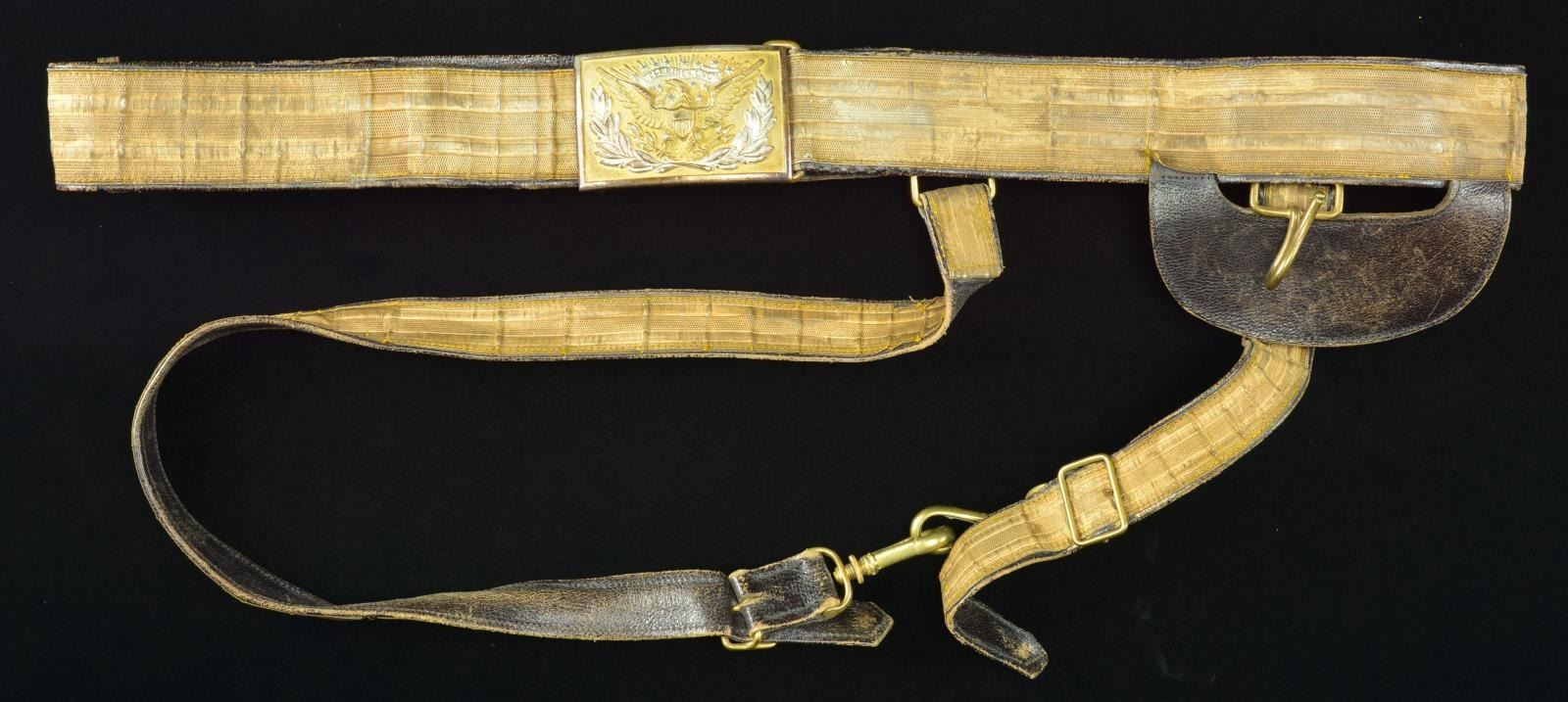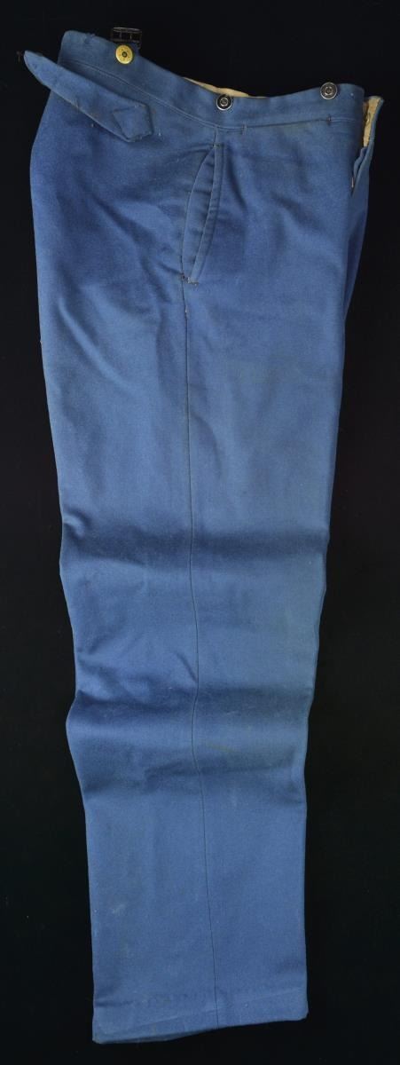 ASSOCIATED WITH THE KENTISH GUARD OF RHODE ISLAND. This group of uniforms appears to date from the 1880’s to just past the turn of the century. Most of the uniforms seem to have an association with the Kentish Guards, a well known Militia organization from East Greenwich, RI. The group includes 1 Officer’s frock coat with white & gold bullion collar trim. There is one row of bullion adorning the sleeves. There are 9 Kentish Guard buttons down the front and 6 on the tail. The interior is lined with white cotton. / 1 Private’s frock coat with white shoulder tabs, white cuff trim, and white piping. The 9 button coat is missing 5 buttons but 3 loose buttons are attached to the coat. The cuff buttons and shoulder tab buttons are small Kentish Guard types. There are also 6 coat sized Kentish Guard buttons on the tails. The coat is lined with white polished cotton and is quilted. / 1 Enlisted sack coat with 5 1872-1902 buttons down the front and 3 incorrect staff buttons on each sleeve. Coat has a sewn hem and a dark blue wool lining. / 1 Dark blue officers double breasted frock coat with 18 buttons down the front (4 missing). Each cuff has 3 small Kentish Guard buttons and the tail has 4 coat sized buttons. The shoulders have sewn on attachments for epaulets. Black polished cotton lining with some quilting. / 1 Pair of blue wool pants with 1" wide white wool stripes down the outside of each leg. Pants have a 5 button fly and provisions for a belt. / 2 Pair of blue wool trousers with an adjustment strap at the rear waistband. 5 Button fly on one and 4 button with a snap on the other. / 1 Officers belt & buckle dating from 1880-1902 complete with sword straps and M1851 style buckle made by Henry V. Allien. CONDITION: all uniforms show some degree of wear and most have some moth damage. Several buttons appear to have been resewn or replaced. One of the blue wool pants has severe moth damage. (02-18135-2/BF). $600-900.