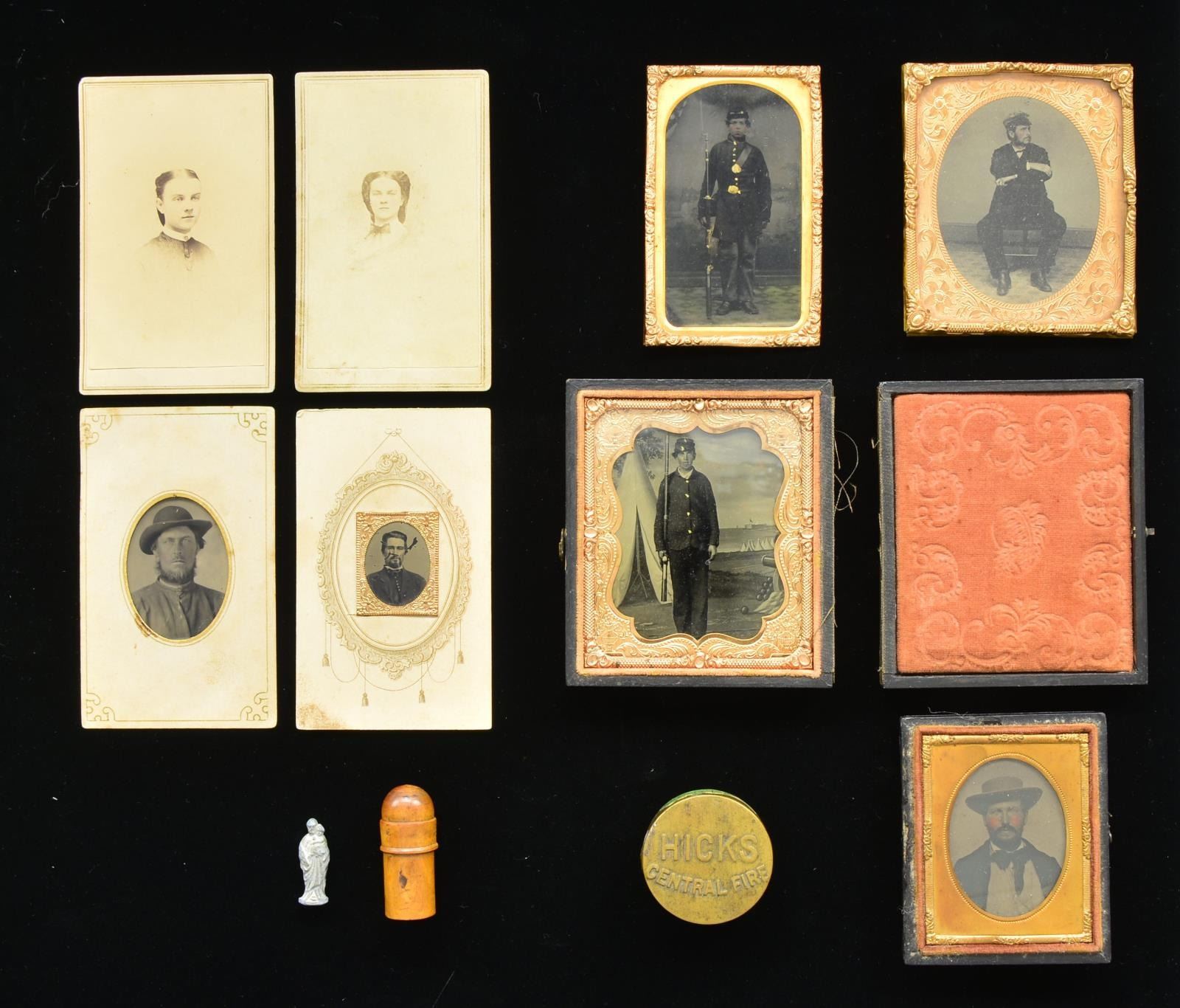 MINIATURE RELIGIOUS STATUE. This lot includes 1 fine 1/6 plate tintype of a full standing Yankee private wearing a 4 button sack coat & bummers cap. He holds a rifle at attention in his right hand. The patriotic backdrop shows a camp scene. Gilded brass mat & frame in press board case. Case is in 2 pieces. / 1 Fine 1/8 plate tintype of a full standing Yankee enlisted soldier wearing a 9 button infantry frock & a kepi. Soldier wears a waist belt & cartridge box with over the shoulder sling. He holds a rifle with bayonet in his right hand. Buckles & buttons have been tinted gold. Background appears to be a country scene & there is a US flag barely visible in the upper right hand corner. The image is contained in the correct mat & frame. / 1 Good 1/6 plate tintype of a seated man wearing an early visored cap. Image has a gilded brass frame & mat. / 1 Interesting 1/9 plate ambrotype showing a chest up view of a gentleman wearing a wide brim light colored hat resembling a gambler of the period. / 1 Gem sized tintype of a gentleman showing a chest up view. Image has a gilded brass mat & has lost some emulsion. / 1 Odd 1/16 plate tintype showing a chest up view of a gentleman in a wide brim, round crown hat. Image is in a paper mat. / 2 CDV’s of Alice H. Leas. One of the images in inscribed on the reverse in ink “Carried through the war by Will Ford in Libby Prison picture of Alice Humphrey Leas.” / 1 Small brass “HICKS CENTRAL FIRE” cap tin. / 1 Small lead religious figure held in a screw top carved fruitwood box. CONDITION: all images show light wear except as noted above. CDV’s have a bit of discoloration but images remain clear. (02-18165BF). $600-900.