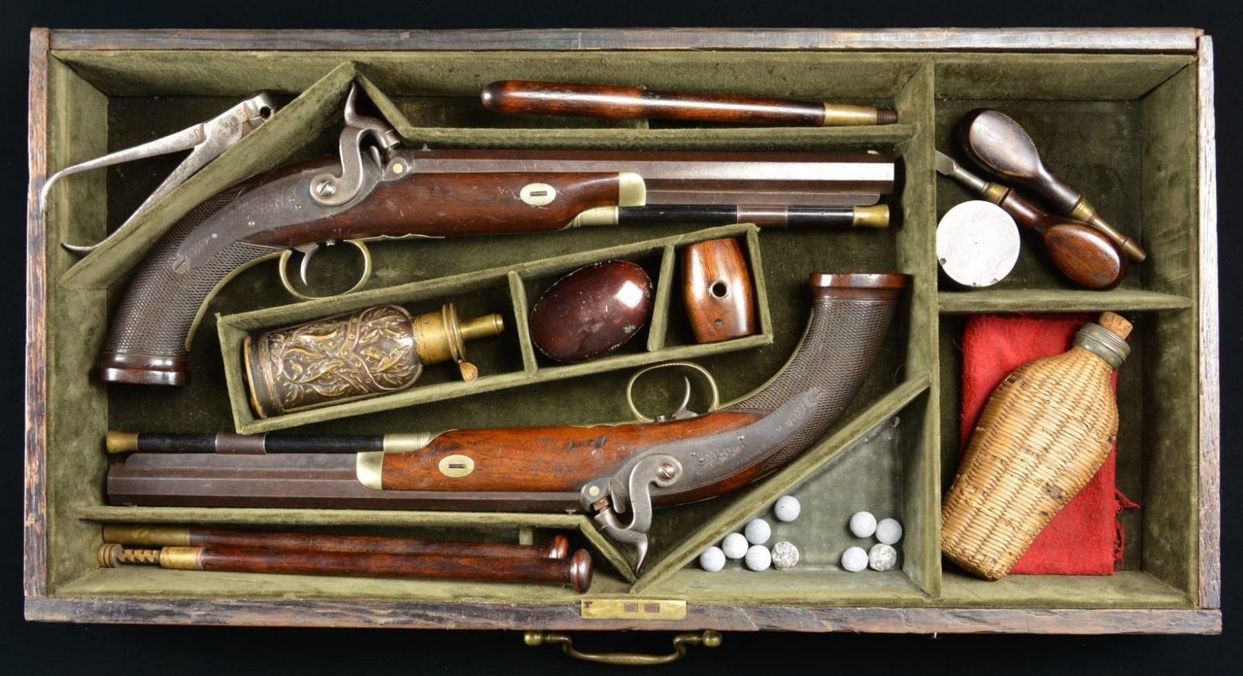 AUGUSTA GA DUELING OR TARGET PISTOLS IN FURNITURE CASING. Cal. 54. NSN. This unique pair of pistols mounted in a small cabinet originated from the late John Montague’s collection of Southern duelers.