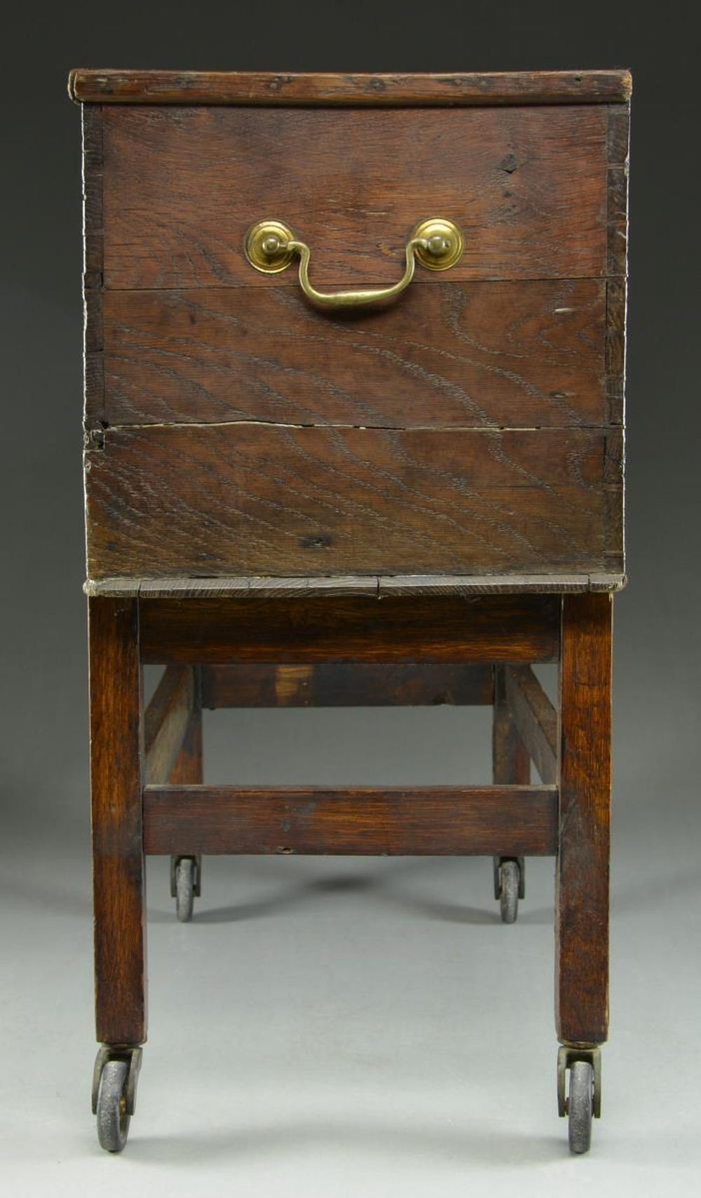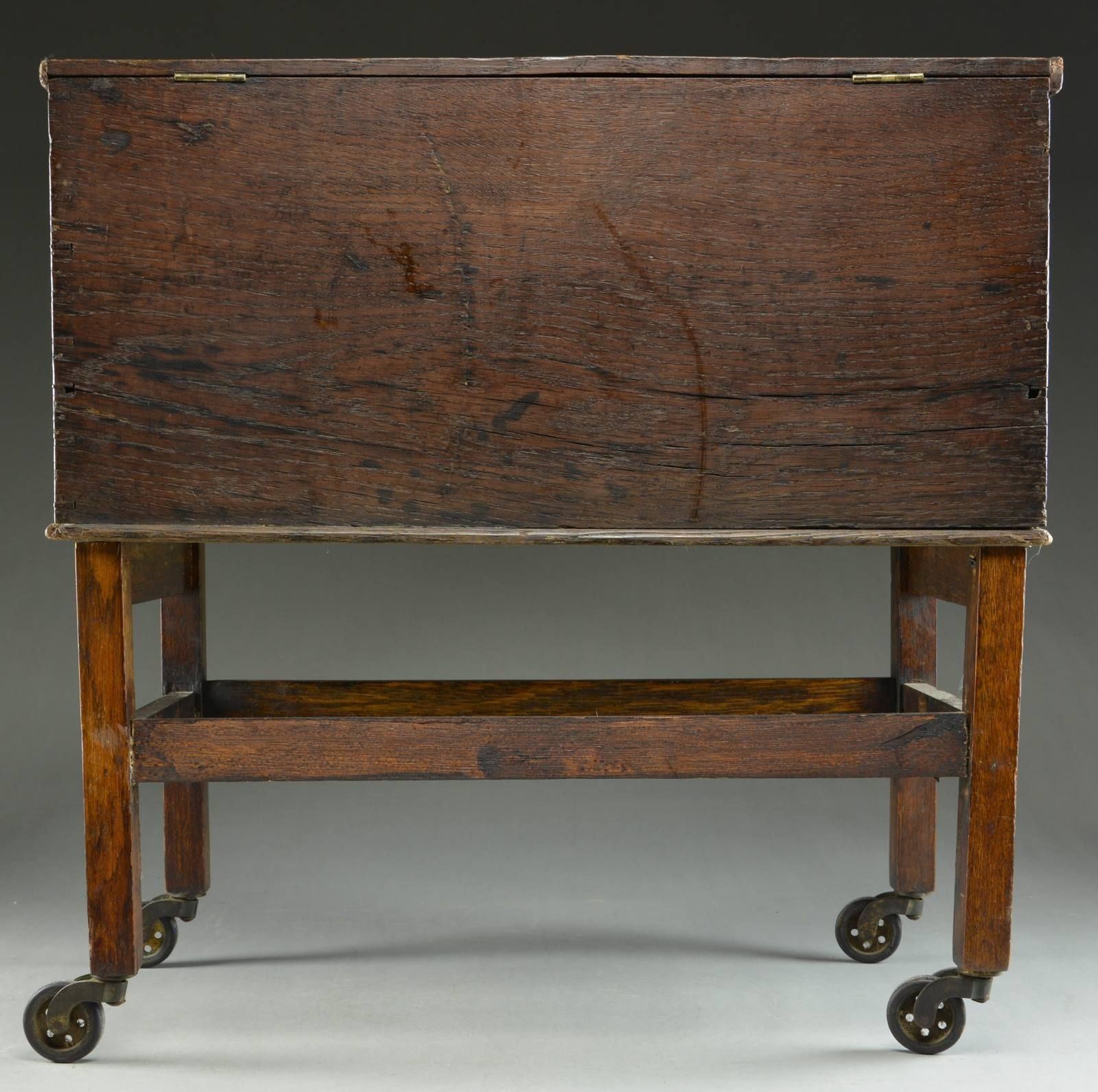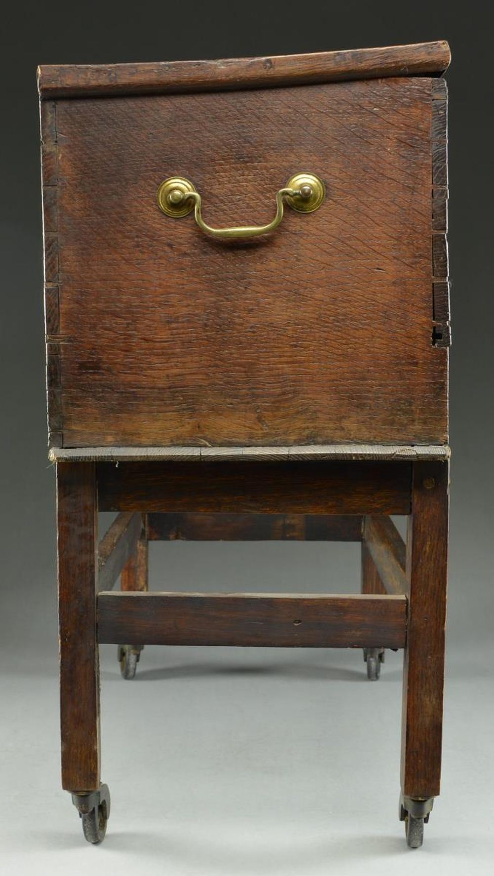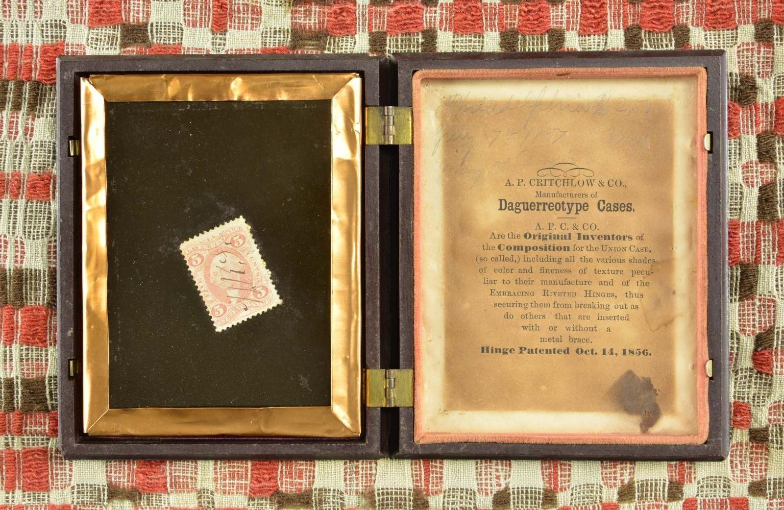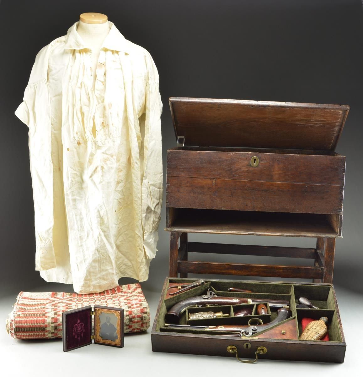16” overall, 10” octagonal barrels engraved on top flat “E H ROGERS AUGUSTA, GEO”. Back action lock engraved “E H ROGERS”. Bottom of barrels are English proofed and stamped “E. Smith”. Locks, hammers, and breeches scroll & edge engraved, German silver mounted, checkered walnut grips, brass tipped ebony ramrods. Not only is this the only pair of Rogers pistols known, they are the only known pair of antebellum Georgia pistols known according to accompanying letter from the late GA firearm authority Dick Kennedy who wrote the earliest monographs on antebellum Georgia gun manufacture. Pistols are housed in bottom drawer of old Southern dovetailed constructed oak & maple chest measuring 24” x 12” x 12”. Pistols are “cased” in 11.5” x 23” x 2.75” drawer compartmentalized, and green baize lined just like any other pistol case of the era. Compartments contain two-piece wood mallet, brass & wood loading tool, brass & wood cleaning tool, screwdriver, nipple wrench, balls, enameled tin of caps, decorated 3 cavity powder flask, cylindrical horn lubricant container, and improvised wicker covered glass flask for powder. The hinged top reveals a fluffy neck white shirt with what appears to be blood stains according to the late well known collector Don Bryan’s letter, the shirt has old ink inscription written in old brown ink “Sam’l Fales No. 8 ’46 of unknown meaning, wrapped in shirt is quarter plate tintype of unknown gentleman wearing similar shirt, along with frayed earthtone coverlet. This is among the most interesting pistol casing you will ever see. UNATTACHED ACCESSORIES: Several letters of provenance. CONDITION: pistols are matching and very good overall, pistol accessories are also very good. The small chest has dark patina, both brass bale handles complete and functionable, back edge of drawer is replaced. There is 12” high stand with wheels apparently added at later date which has been stained to match and has loose joint but easily repaired or removed. PROVENANCE: Bristol Virginia Estate, Don Bryan Collection, Lee Pollock collection, John Montague collection. (01-22820/JS). $8,000-12,000.