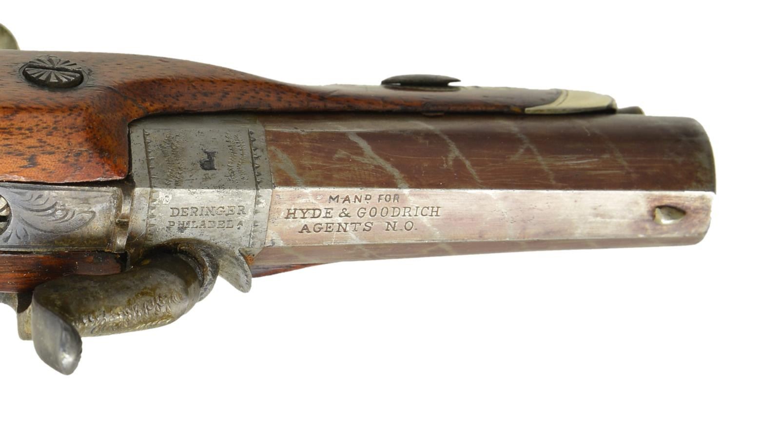 & GOODRICH MARKINGS ON BARREL. Cal. 45. NSN. 7" Overall. 2 1/2" Brown striped bbl. marked on top flat “MANd FOR / HYDE & GOODRICH" in die font not seen on another example & "AGENTS N.O.” Standard configuration Henry Deringer w/ maker’s mark on breech & lock. German silver mounted. CONDITION: very good to fine as refinished. Good markings & engraving. Mechanically fine w/ good, rifled bore. PROVENANCE: Collection of John Montague. (01-20733/JS). ANTIQUE. $1,800-2,400.