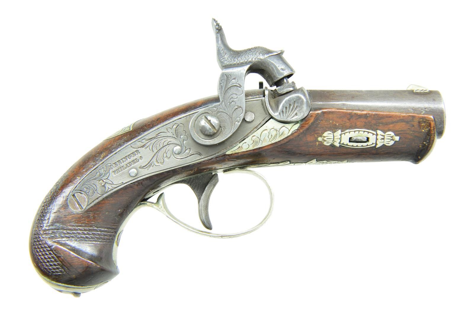 Cal. 38. NSN. 5.25”, 1.75” barrel, breech with 2 silver bands signed “DERINGER / PHILADELA” as is lock; cap trap in butt. CONDITION: very good overall, traces of original brown striping on barrel. action is crisp, dirty rifle bore. (01-21871/JS). ANTIQUE. $1200-1800.