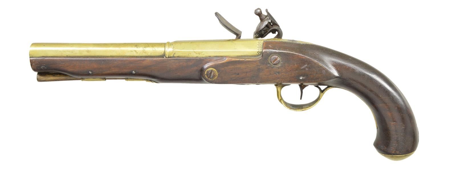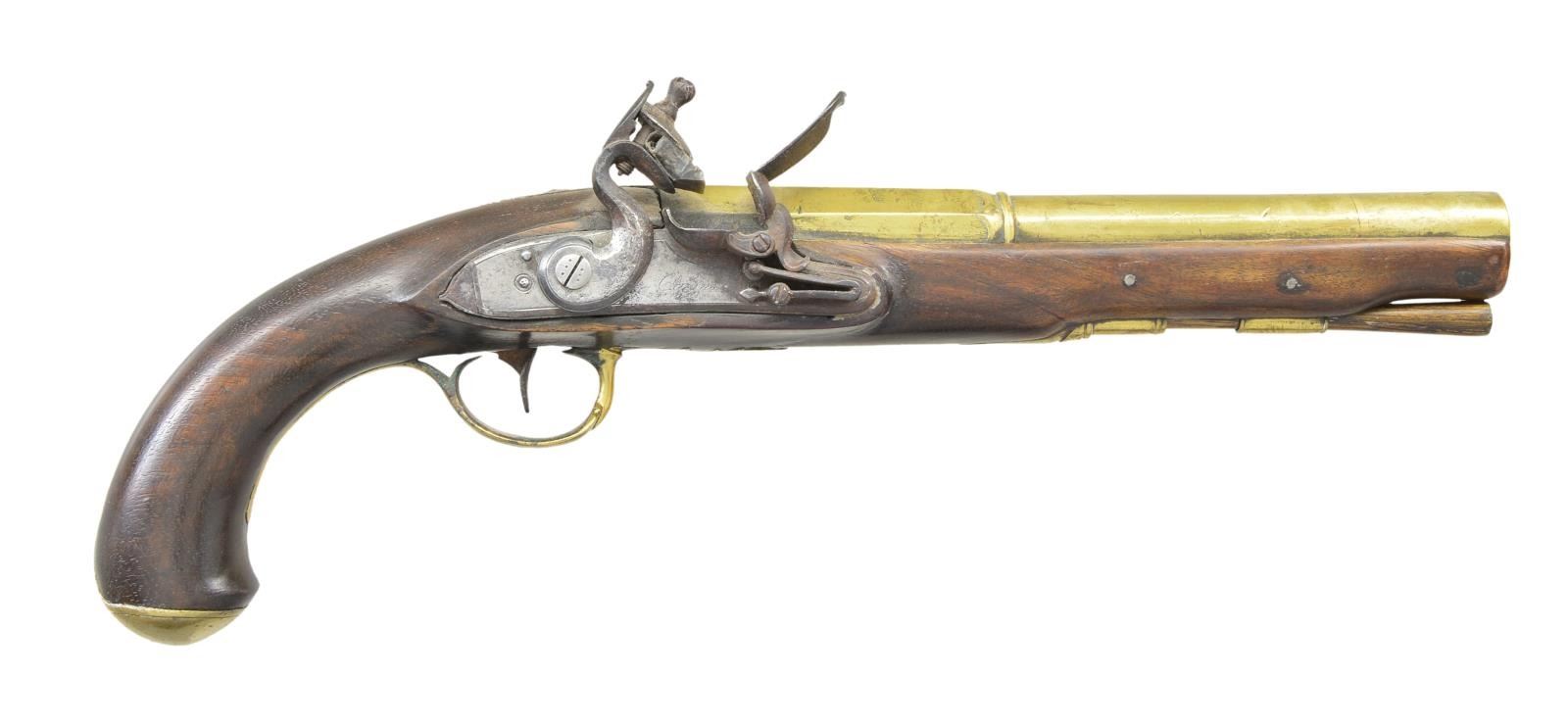 Cal. 56. NSN. Bbl. 8 13/16" of brass w/ smoothbore having a faceted transition to octagon shank. Top flat of bbl. has floral engraving. London made lock marked “W. Cairns”. Pin fastened round butt stock. British style brass butt cap & trigger guard w/ pineapple finial. Hardwood ramrod held by a faceted thimble in single pipe. CONDITION: bbl. has cleaned brass showing handling marks. Right side of bbl. has an added brass repair 1 1/2" from muzzle. Lock & hammer show spots of pitting. Stock shows scratches & handling marks w/ a small amount of wood erosion above hammer. Sound lock. Lightly corroded bore. (01-23045/DS). ANTIQUE. $1,500-2,200.