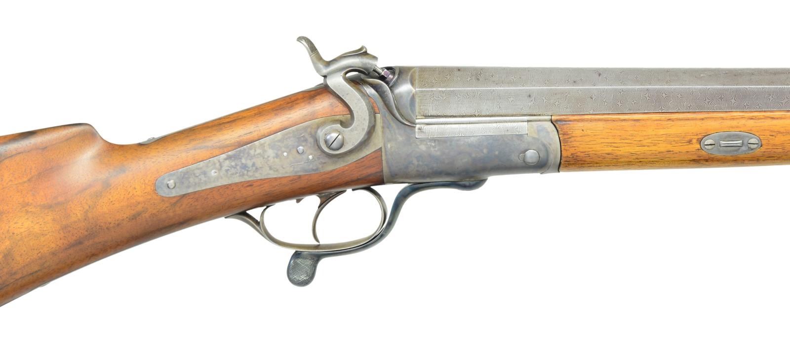 Cal. 10 Ga., 2 1/2". NSN. This gun is completely unmarked except for the names "P. Heuze Fr. & L. Mairlot" on barrel flats. (There are a number of Heuze gunmakers in Liege Belgium but none with the first initial "P.", there are no listings found for Mairlot). Flats are also marked "18.4" and "25" as there no offical proofs, it must be assumed that this gun was made or finished in Germany before 1891. It has 22 1/2" barrel made of very fine etched two stripe Damascus. Octagonal breech section is tapered and transitions to round with two turned rings and flares at muzzle to 2 7/8". Case hardened action with Jones underlever is configured in Germanic fashion with barrels lifting out of captive forend iron. Action is nicely filed and fitted with back spring lock having large chamfered serpentine hammer. Steel trigger guard screws into long trigger plate extending into butt. Straight grip buttstock of well streaked European walnut measures 14 1/4" over blued steel buttplate having long top tang which is also fitted with large trap with space underneath for two cartridges. Forend has horn tip and attaches to barrel with captive sidebolt through oval steel escutcheons. Weight: 9 lb. 9 oz. CONDITION: exceptionally fine. Appears unfired. Metal retaining over 95% original finishes with some high edge wear noted. Charcoal blue of operating lever and buttplate is also exceptionally fine with some minor marks. Finish on barrel is also exceptional showing off dramatic etched Damascus pattern. Buttstock retains nearly all of its original oil finish with a scattering of minor marks. Forend wood appears to be a very well done replacement or possible refinish. Horn tip appears to be original. Stock work is not quite up to the quality of the original, but matches well. Bore is bright and shiny, action is very tight, lock is crisp. One of the neatest guns this cataloger has seen in a long time. (01-22734/MGM). ANTIQUE. $3,000-5,000.