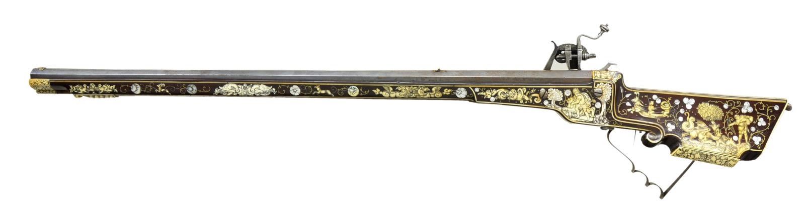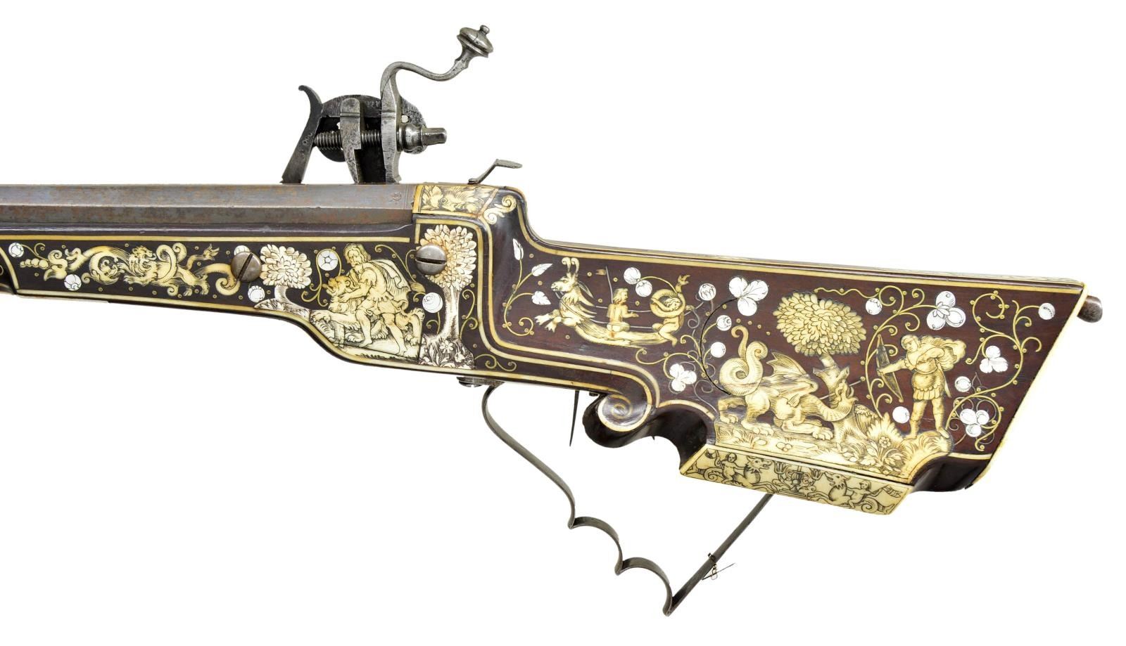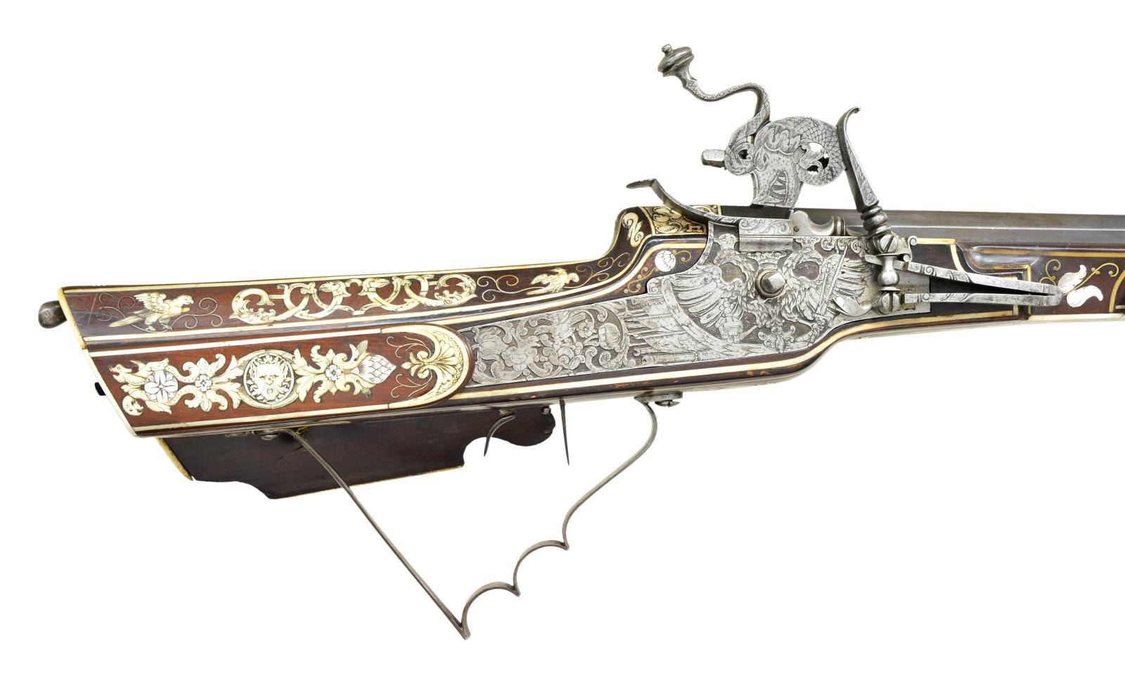 WHEEL-LOCK SPORTING RIFLE DATED 1659. Cal. 80. NSN. A Superb elaborately Inlaid 17th Century Austrian Sporting Rifle Dated 1659. The lock with internal wheel very finely and deeply etched with birds amid foliage, the concealed wheel etched with the Imperial Hapsburg double headed eagle. The hammer superbly engraved in the form of a toothed dragon. The swamped, blued octagonal barrel is engraved “ANNO CHRISTI 1659” and struck with a maker’s mark on the left flat near the breech. The figured walnut full stock is exquisitely and lavishly inlaid throughout its length with tendrils and panels of scrimshawed white stag horn of exceptional quality enhanced with engraved mother of pearl leaves, blossoms and roundels. The cheek-rest features an incredibly detailed standing archer shooting a fierce dragon through the head. The butt-plate depicts a dog biting the head of a wolf in unusually fine detail. The engraved inlays of this work of art wheellock rifle are of such quality and detail that it surpasses most mid-17th century wheellock sporting rifles. CONDITION: the inlays are excellent throughout with little if any loss of detail and only one thin tendril missing. The lock is excellent retaining much of its original polish. The barrel retains considerable thinning period bluing. This lovely Austrian wheellock must have been preserved in a royal or noble gewehrkammer and has been justifiably prized for its beauty for nearly four centuries. (01-21894/MZ). ANTIQUE. $12,000-18,000.