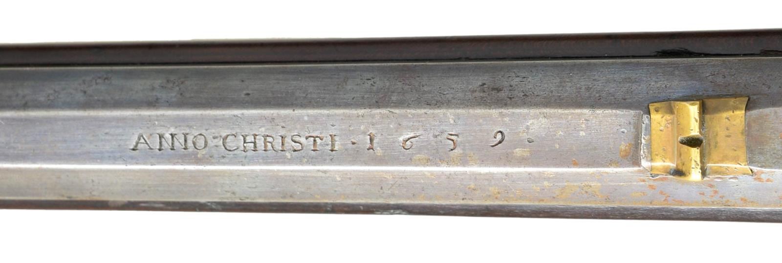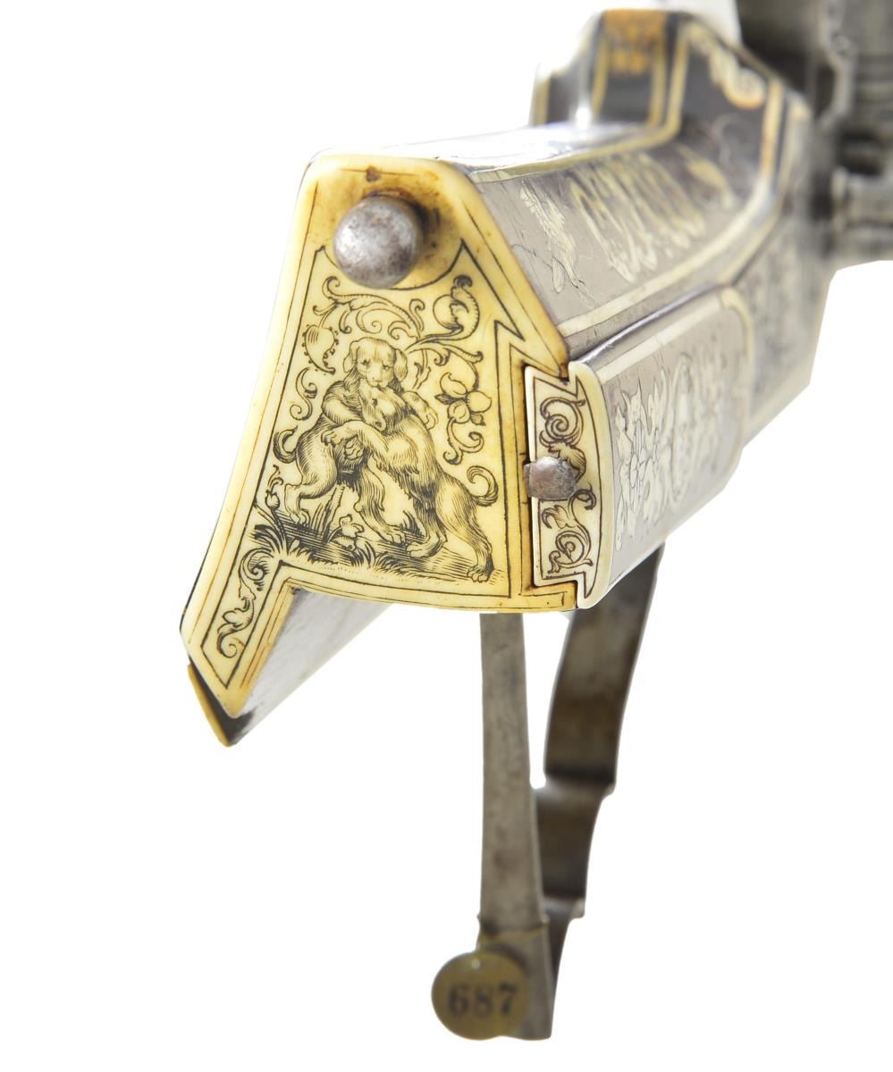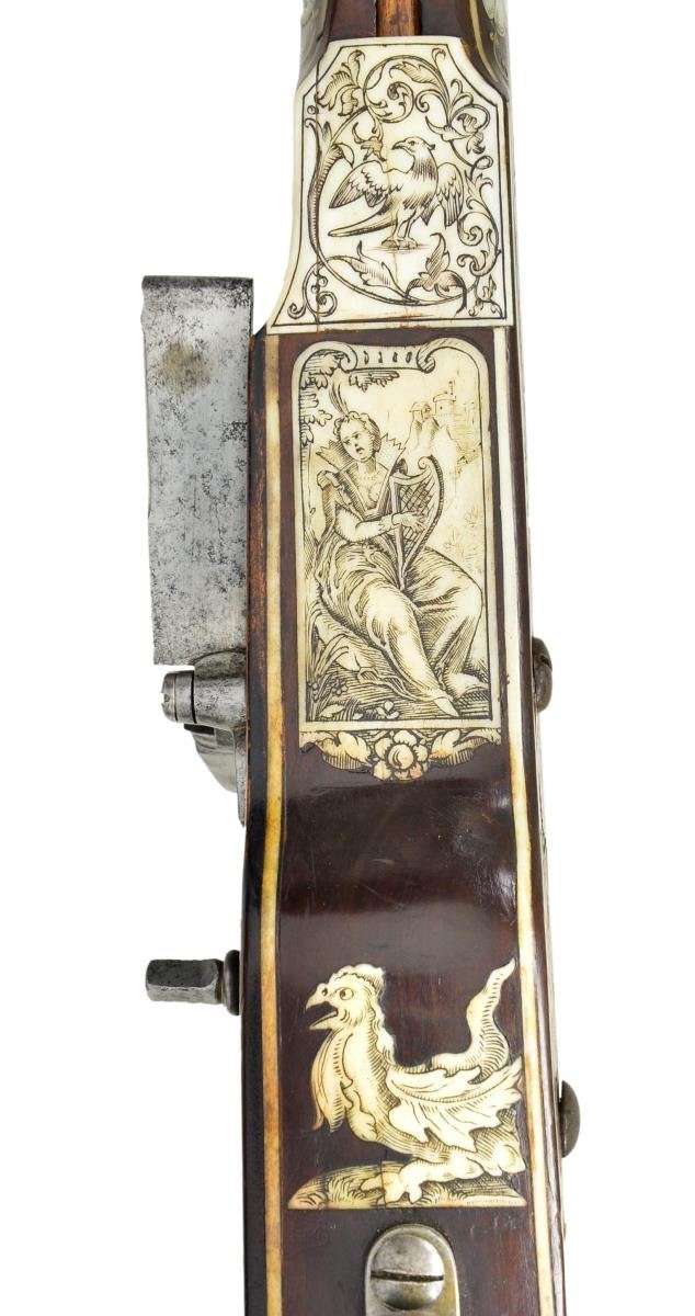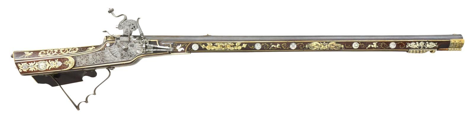 WHEEL-LOCK SPORTING RIFLE DATED 1659. Cal. 80. NSN. A Superb elaborately Inlaid 17th Century Austrian Sporting Rifle Dated 1659. The lock with internal wheel very finely and deeply etched with birds amid foliage, the concealed wheel etched with the Imperial Hapsburg double headed eagle. The hammer superbly engraved in the form of a toothed dragon. The swamped, blued octagonal barrel is engraved “ANNO CHRISTI 1659” and struck with a maker’s mark on the left flat near the breech. The figured walnut full stock is exquisitely and lavishly inlaid throughout its length with tendrils and panels of scrimshawed white stag horn of exceptional quality enhanced with engraved mother of pearl leaves, blossoms and roundels. The cheek-rest features an incredibly detailed standing archer shooting a fierce dragon through the head. The butt-plate depicts a dog biting the head of a wolf in unusually fine detail. The engraved inlays of this work of art wheellock rifle are of such quality and detail that it surpasses most mid-17th century wheellock sporting rifles. CONDITION: the inlays are excellent throughout with little if any loss of detail and only one thin tendril missing. The lock is excellent retaining much of its original polish. The barrel retains considerable thinning period bluing. This lovely Austrian wheellock must have been preserved in a royal or noble gewehrkammer and has been justifiably prized for its beauty for nearly four centuries. (01-21894/MZ). ANTIQUE. $12,000-18,000.