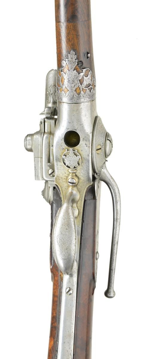 SPORTING GUN BY THE CECCHI BROTHERS (ACQUA FRESCA) OF BARGI. Cal. 52. NSN. The Lorenzoni system for making repeating flintlock guns was developed around 1700. It was fairly efficient and developed quite a following throughout Europe and into Great Britian. It was produced for a relatively long time. The system used a rotating drum set transversely that picked up a charge of powder and a ball from magazines loaded through the butt. Rotating the lever on left side deposited charge and ball into chamber in breech section. Continuing the rotation of the lever cocked the hammer and closed frizzen. Returning the lever to original position exposed powder in the pan making gun ready to fire. Most of these guns have barrels that were easily dismounted with tapered heavy thread. Barrels were usually smooth bored. Bores were generally tapered from breech to muzzle to increase accuracy. This gun has 32 1/4" barrel with octagon rear section which transitions to sixteen sided; then to round through turned band and terminates in a heavy raised band at muzzle with large sight bead. Two piece full length walnut forend is pinned to barrel and a fancy steel tipped ramrod mounts through two fancy turned pipes and matching tail pipe. Iron decoration at rear is pierced in the form of scrolling acanthus and has grotesque face at center. Action has deep sighting "V" on top and brass rotating drum. Back spring flintlock is engraved "Acgua Fresca" "Bargi" (The fairly well known Cecchi brothers, Matteo and Pietro that worked together in the early 18th century). They were known for their exceptionally fine deep chiseled metal work which shows up on the beautifully sculpted serpentine cock, as well as the face and tail of frizzen found on this gun. Other high relief carvings of note are on the lever retaining spring on left side of action. Non relief, but finely detailed engraving extends to fine attenuated scrolls overall, along with the torso of man on lock plate, a phoenix on pan housing and coiled sea monster on frizzen cocking dog. Trigger guard finial is pierced and engraved with grotesque face. Straight grip buttstock of burl grain walnut has heavy steel hinged buttplate covering access to powder and ball magazines with release button on toe. Thin top tang extends to within 3/4" from point of comb. CONDITION: good with some restoration. Metal parts are cleaned to silver gray over light pitting. Wood has most of an old finish probably renewed, with marks and scratches. Forend wood, probably an early replacement over most of its length. Two pieces of wood make up first 3" at breech end. Some screws show replacement in action, hinged buttplate will not open. Stock shows some losses of wood and replacement around lockplate. Bore is good, mechanically good. (01-21981/MGM). ANTIQUE. $7,000-12,000.