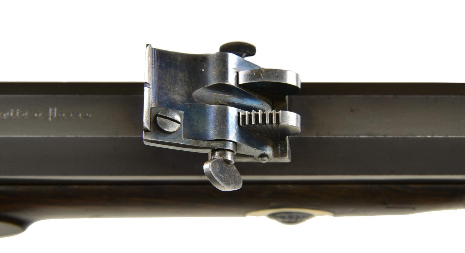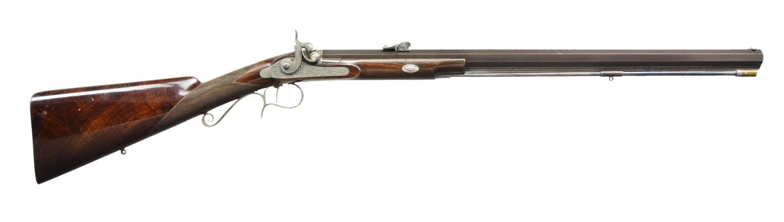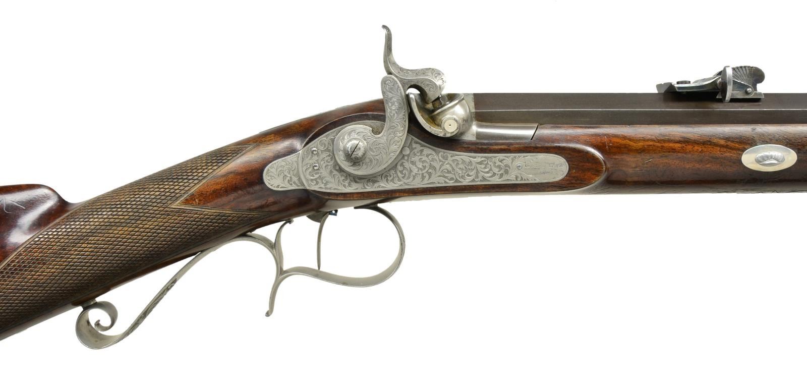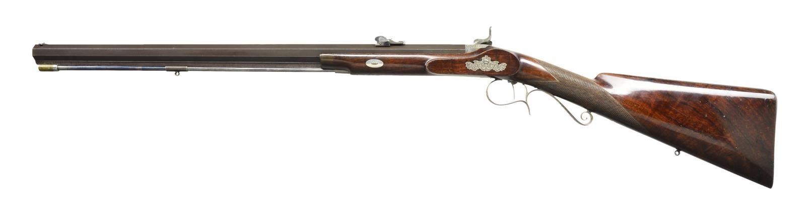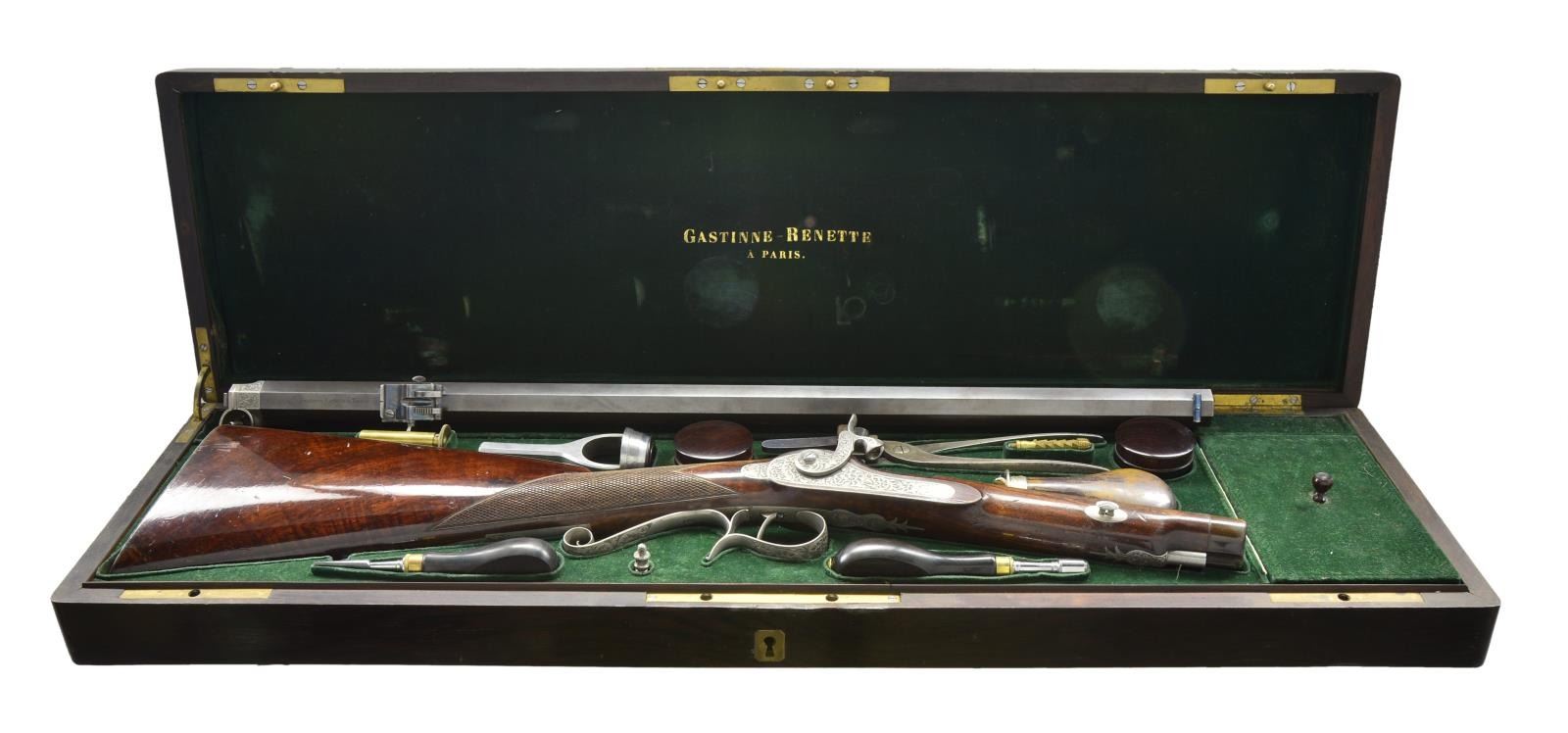 PERSUSSION RIFLE WITH CASE AND ACCESSORIES. Cal. 50. S# 1846. The firm of Gastine Renette is known for making some of the finest firearms in the world during the 19th & early 20th centuries. This rifle has 25" octagon barrel fitted with well made elevation adjustable rear sight with rack and pinion adjustment knob on right. A steel dot front bead is dovetailed through. Top flat behind rear sight is engraved "Gastinne Renette a Paris". Barrel is fitted with under rib holding steel ramrod. S# is stamped on bottom of barrel. Patent breech is nicely filed and has platinum blowout and two lines at rear, top and left flat are scroll engraved. Breech iron is engraved with near full coverage large shaded scroll which matches scroll found on island lockplate with rebated tail and tall round bodied hammer. Front of plate is engraved with maker's name and address. Straight grip stock of well figured dense European walnut is iron mounted with mounts given French gray finish. Stock measures 14" over steel buttplate with scroll engraved long top tang. Trigger plate with vestigial pineapple finial is fitted with set trigger. Trigger guard with finger spur has curl on tang forming grip. Side plate is intricately shaped, forend tip is horn, stock attaches to barrel with captive sidebolt through oval silver escutcheons. UNATTACHED ACCESSORIES: rifle is housed in its original rosewood case with inlet brass lines on top surrounding intricate flush brass inlay of scrolls surrounding central medallion. Case has cloth lined leather outer cover. There are shipping labels stuck to the top, one marked "The Marquis of Landsdowne". Case is lined in green velvet, maker's name and address is in gold leaf in lid. Bottom compartment is French fitted for barrel, stock & accessories that include, steel bullet mould casting a pointed projectile, copper bodied powder flask by Hawksley, steel patch cutter, adjustable brass powder measure, ebony handled turn screw and nipple wrench with pricker as well as two cocobolo patch containers. A covered compartment contains replaced parts, two rings with percussion cap dispensers (as found in Manton cases), an old paper with load information, some cast bullets and information regarding work done to restore this rifle. CONDITION: very fine with some meticulous restoration. Barrel retaining what appears to be its original brown. Other metal parts retain nearly all of their French gray finish. Stock shows some light repolishing of its original French polish with some scattered scratches. Bore is bright and shiny, lock and trigger are crisp. One silver escutcheon and sidebolt are replaced. Case is very fine with some work done around lock and its mechanism and retains most of its original finish with some shrinkage cracks. Outer cover show considerable wear, closing straps replaced. Interior cloth is very good to fine with rubs and compressions from rifle and accessories some of which are newly made (per information letter in case) others good. (01-22003/MGM). ANTIQUE. $7,000-10,000.