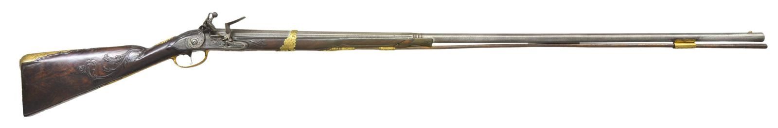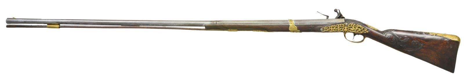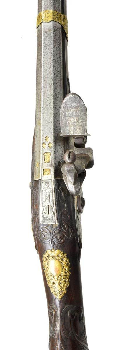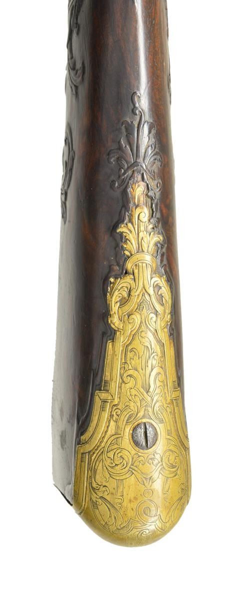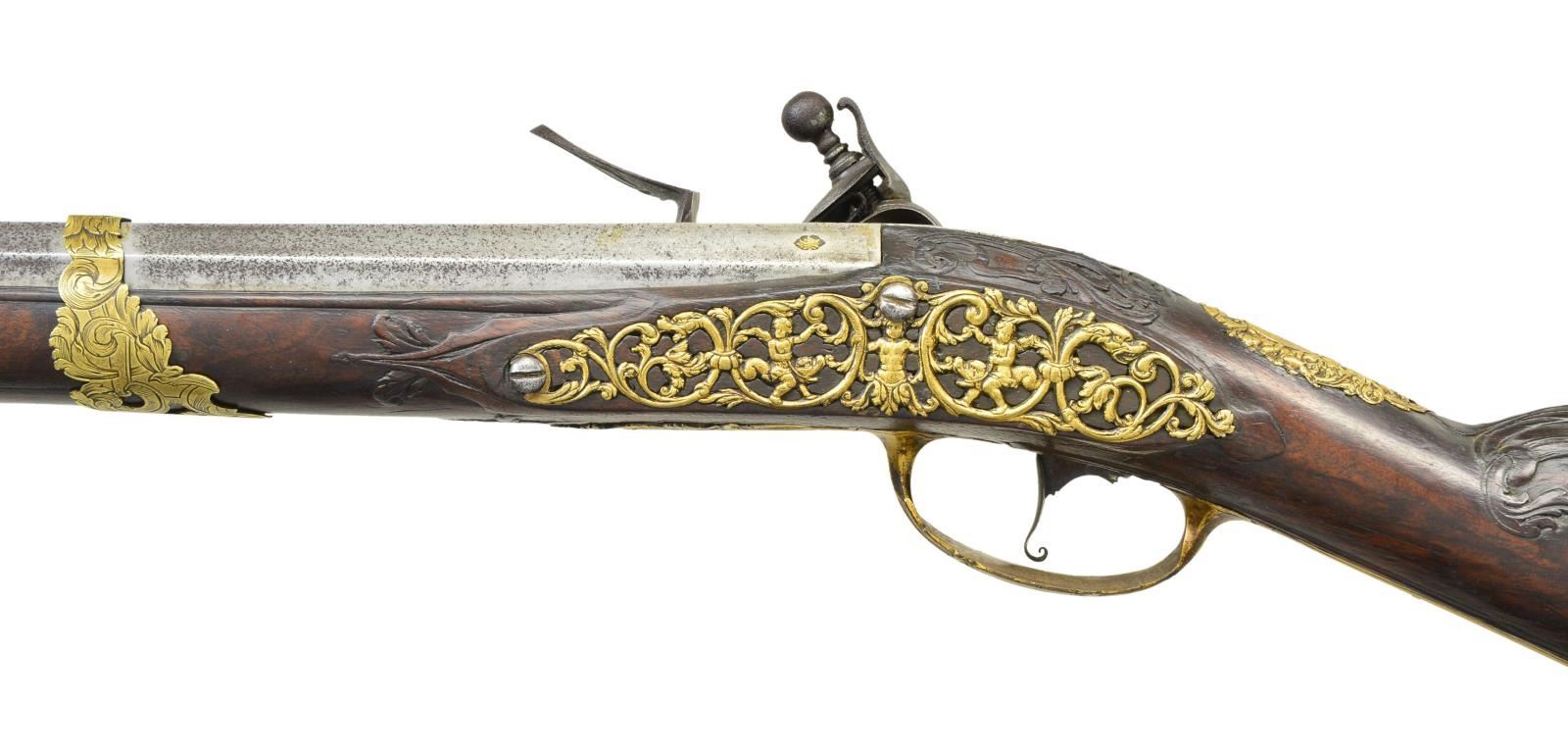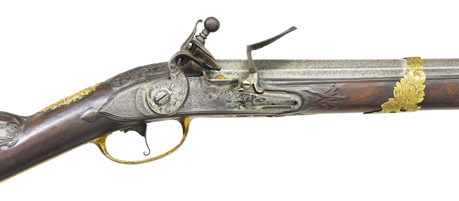 JOHANN WAASS OF VIENNA. Cal. 60. S# 60. Johann Waass began his apprenticeship in Vienna in 1681 and worked until 1723. He was well known and obviously very talented. This fine gun has 43 1/2" one third octagon, two thirds round swamped barrel which has many gold poincon at breech. These marks are typical of his work and consist of his name in crowned device, a running stag and five gold fleur de lis. Touch hole is gold lined. Lock, having moulded and chamfered flat plate with rebated and pointed tail, is fitted with inset faceted pan, unbridled deeply engraved friction frizzen, and feather spring which is file decorated and has foliate finial. Broad flat bodied serpentine cock has some filed in relief scroll. Lock and cock are engraved with near full coverage well cut scroll surrounding a hunting scene on plate with horse and rider in front of cock chasing after a hare and hound which are on rebated area behind cock. "IOHANN WAASS" is under pan and "In Wien" is behind cock. Internal inspection reveals nicely filed bridled tumbler and file decoration on main spring. Trigger has curled finial to blade. Fancy European walnut stock is mounted with gilded brass furniture which is relief cast and well engraved with scrolls. Large buttplate engraved "No. 60" at toe has large 5 1/2" top tang. Vacant crest plate at top of grip is decorated with putti and a crown. Very fancy multi pierced side plate is decorated with scrolls having sea monster heads as well as more putti. Stock is relief carved with acanthus scrolls around barrel tang and with tendrils on both sides of stock. Scroll and mouldings outline buttplate tang, lock and sideplate. Stock has relief carved horn tip and attaches to barrel with one pin and slipped on fancy brass band. Old replacement wood ramrod mounts through gold plated pipe on barrel with matching pipe on stock and thimble. CONDITION: good, showing considerable cleaning of barrel which is silver and brown showing considerable overall pitting. Lock is also cleaned and lightly pitted, engraving remains clear. Brass mounts retain a large amount of their gold finish. Stock retains old oil finish, carving is fine. Front 3" of forestock is cracked and separated. Bore is shiny with straight "hair" grooves. Mechanically good. (01-22999/MGM). ANTIQUE. $4,000-6,000.