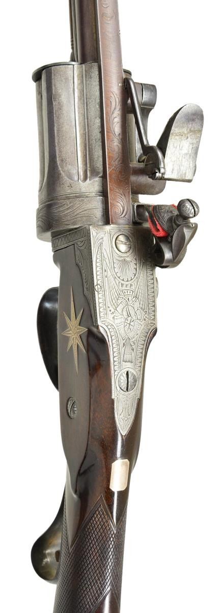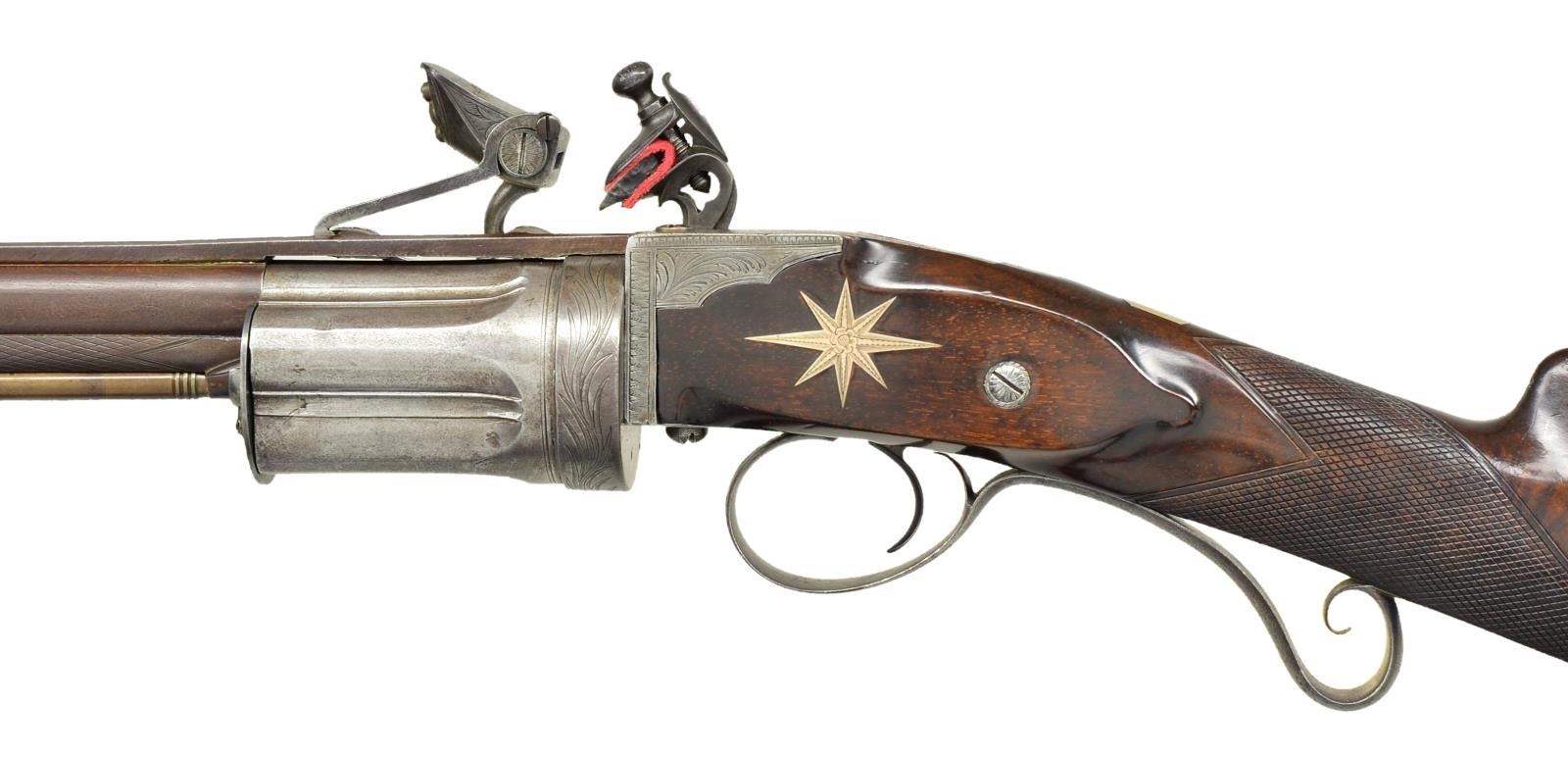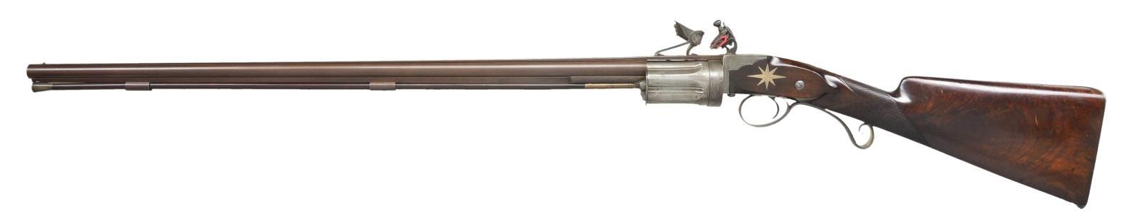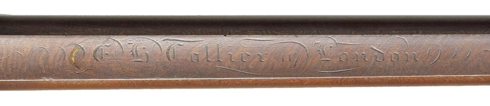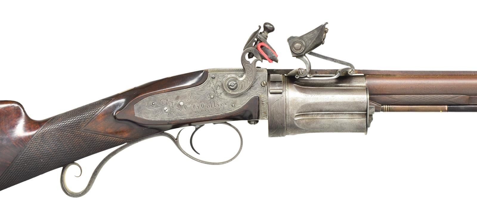 Cal. 54 smooth bore. S# 117. Elisha Collier of Boston, MA and his partner Artemas Wheeler devised this revolving flintlock mechanism around 1814; it was a true revolver, not a multi barrel type. Wheeler continued its manufacture in America with limited success. Collier took this invention to England where it was patented in 1818 and produced by some of the top gunmakers in London including S. Nock and T. Mortimer. From patent use numbers it is estimated that about 225 Collier pistols and long guns were made. Urban legend relates that Samuel Colt saw weapons of this type and they were the inspiration for his famous revolving pistols and rifles. This good example has 28" Damascus barrel with full length under rib holding two plain pipes for rosewood ramrod with brass tip and tail. "E. H. Collier 117 London" is engraved on concave solid rib. Five shot revolving fluted cylinder must be pulled to the rear and revolved by hand for each subsequent shot. Gas seal is very good with rear portion of barrel rebated to engage a matching recess in cylinder. Flint lock with reinforced cock has powder magazine in very thick frizzen. With gun at full cock cylinder can be rotated. Closing the frizzen causes a linking mechanism to rotate a drum which picks up powder from the reservoir and deposits it in the pan. When frizzen flies forward the drum rotates to close off magazine and refills drum for the next shot. Quality of manufacture is very high. Lock and mechanism are finely engraved with large scroll within feather borders. Lock with exterior mounted reinforced cock is engraved "E. H. Collier" "117 PATENT". Frizzen is also engraved "E. H. COLLIER 117 PATENT" on powder reservoir. Trigger guard with stand of arms engraving on bow has curled tail forming grip. Stock of nicely crotch figured European walnut features iron buttplate with engraved long top tang, flat top square checkering at grip, inlaid silver eight point star on left side and a silver rectangle with cut corners at top of grip. Tip of short loading rod protrudes from toe of butt. CONDITION: good as refinished. Barrel retaining near all of a rebrown over considerable light pitting. Action is cleaned to gray brown patina again showing considerable pinprick pitting overall especially on cylinder. All engraving is clear. Stock retains most of a shiny varnish refinish over numerous marks. Bore is pitted, mechanically good with all systems working. (01-21887/MGM). ANTIQUE. $20,000-30,000.