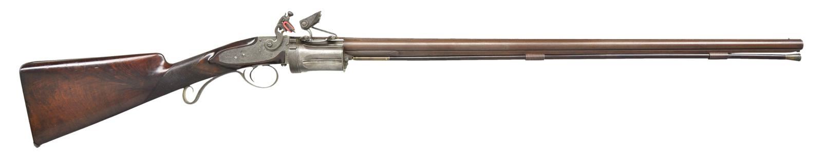 Lot 3368 A VERY RARE COLLIER FLINTLOCK REVOLVING SHOTGUN.