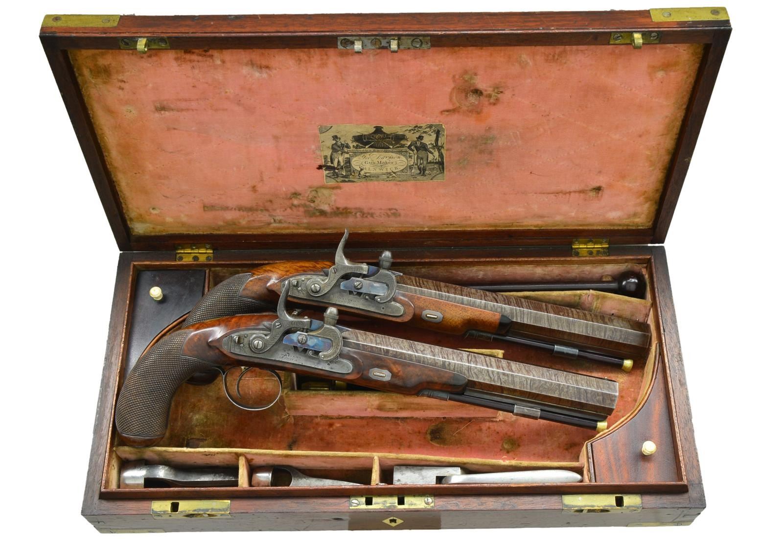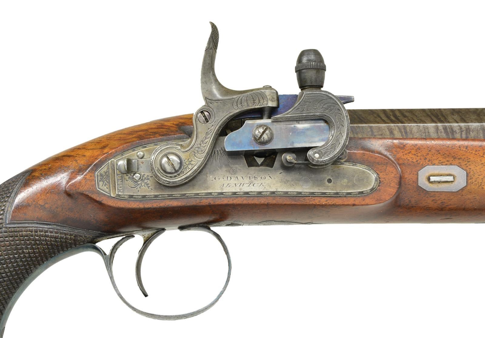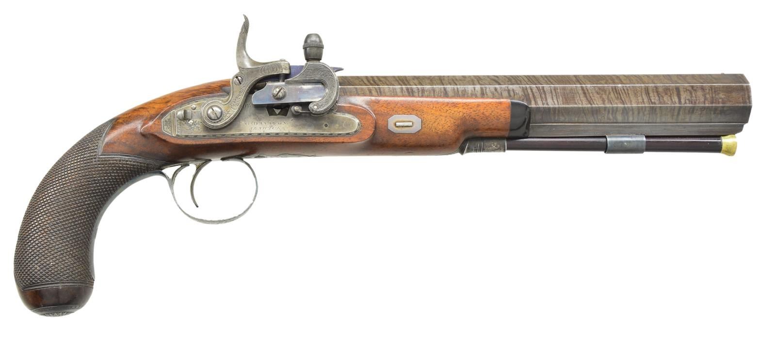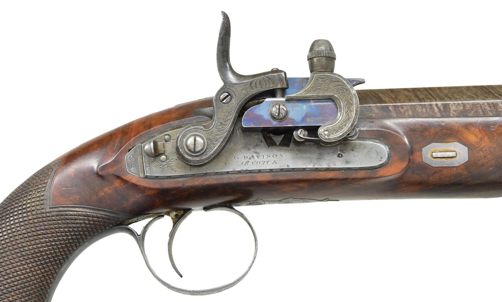 CONVERSIONS TO RARE FORSYTH SLIDING PRIMER PERCUSSION SYSTEM WITH CASE AND ACCESSORIES. Cal. 52 smooth bore (both). NSN (both). This pair of good quality heavy barreled pistols were originally flintlock and made around 1812. Shortly thereafter they were fitted with Forsyth patent sliding primer systems. This was an improvement on the earlier and well known scent bottle design. It used a priming powder magazine accessed by egg shaped covers on a sliding reservoir. When cocking the hammer an attached link pulls the reservoir to the rear allowing a small amount of priming powder to enter a depression at the end of a drum conversion installed in place of the touch hole. In firing, the reservoir is automatically pushed to the front exposing priming powder to the firing pin on hammer nose. These pistols have 10" heavy octagon skelp twist barrels with under ribs. Patent breeches with gold lines at rears have deeply inset gold poincon marked "G. DAVISON" " ALNWICK". Breech irons with armorial engraving are fitted with "V" notch rear sights. Chamfered locks with rebated, truncated tails are fitted with back sliding safetys. Lock plates are engraved with feather borders and with maker's name and address. Hammers and reservoirs of conversion parts are scroll engraved. Drums and associated slide bases are temper blued. Trigger plates have stylized pineapple finials. Trigger guards have drum and flag engraving on bows. Half stocks with horn tips and steel capped checkered bag grips are of dense figured root walnut. Stocks attach to barrels with captive side bolts through octagonal silver escutcheons. Purpleheart ramrods with small brass tips (one rod has brass tail) mount through single plain pipes and well filed thimbles. Rectangular gold crestplates with cut corners at tops of grips are engraved with perched falcons. UNATTACHED ACCESSORIES: guns are housed in their original mahogany case with inlet brass corners and small flush mounted "D" ring circular handle. Central medallion is engraved with a monogram "FS"?. Interior of case is lined in light reddish patterned cloth, Davison label is in lid, case contains steel round ball mold marked "Davison" which has pivoting sprue cutter, two patch cutters; the larger is marked "Davison", the smaller "34". Rosewood and brass loading rod, black leather covered two compartment powder and ball flask by Hawksley. Two covered compartments with bone handles are present; one containing cut wads and a key with bone tag inscribed "DAVISON ALNWICK". CONDITION: very fine. Barrels retaining over 80% of what appears to be their original brown twist finish. A fair amount of case hardening color remains on patent breeches. Locks retain some color remaining after conversion; most original blue remains on conversion parts as well as trigger guards and buttcaps. Stocks retain most of their possibly original oil finish with a fair number of scratches and bumps. Bores are bright and shiny, mechanically fine except one pistol will not hold at full cock (probably gummed). Case exterior has most of its oil refinish over some cracks. Interior cloth is good, considerably stained and rubbed. Label is fair to good with minor chips, bumps and rubs. Accessories are generally good. A desirable pair of pistols; this variation of Forsyth's patent is quite scarce. (01-21942/MGM). ANTIQUE. $10,000-20,000.
