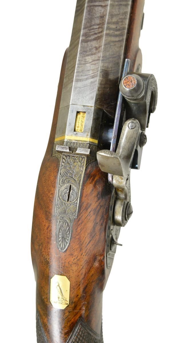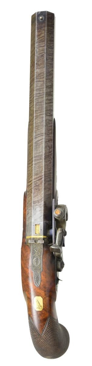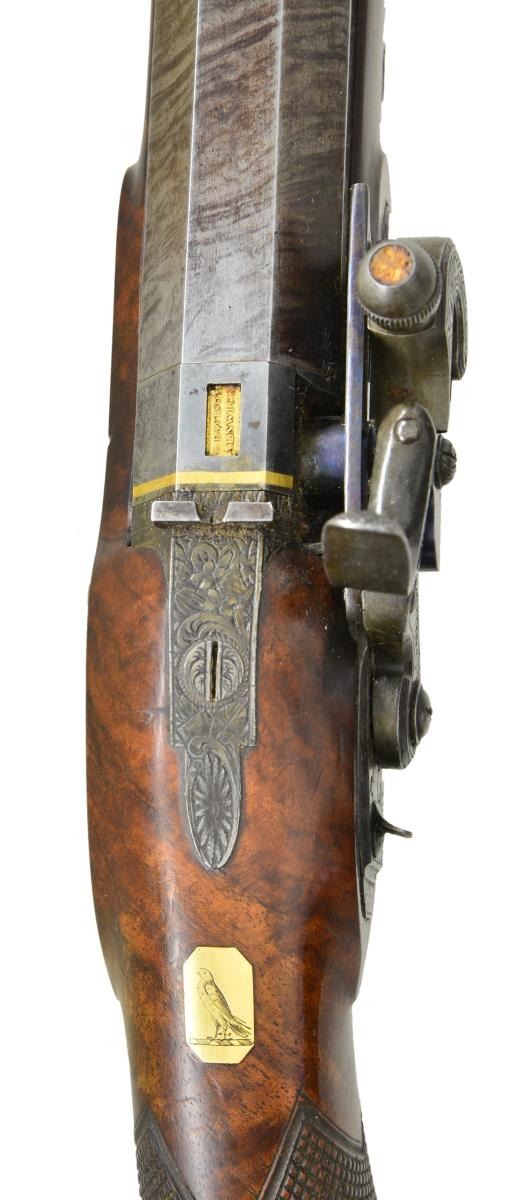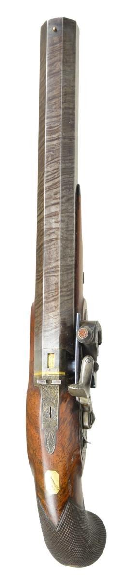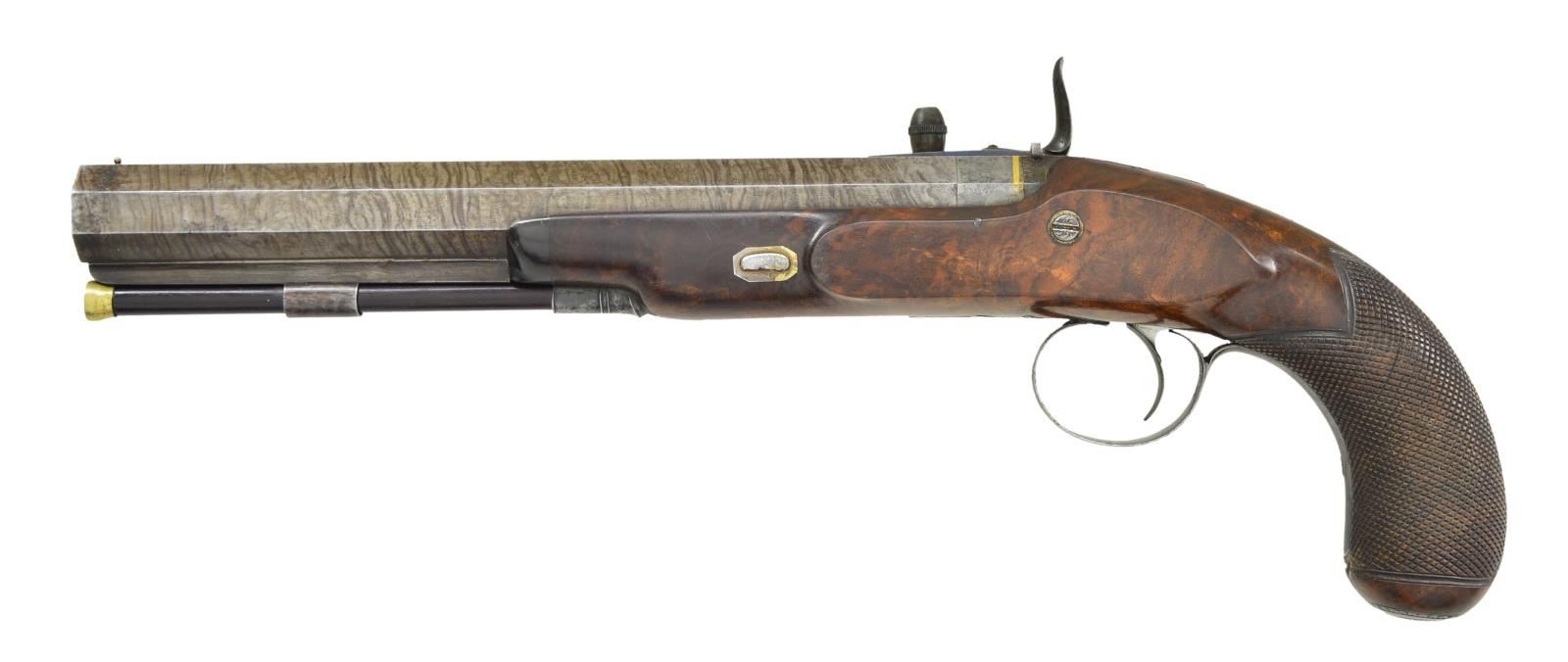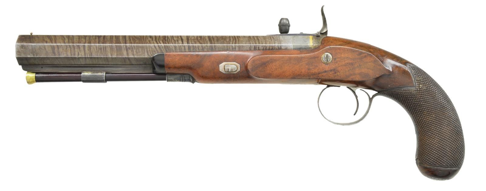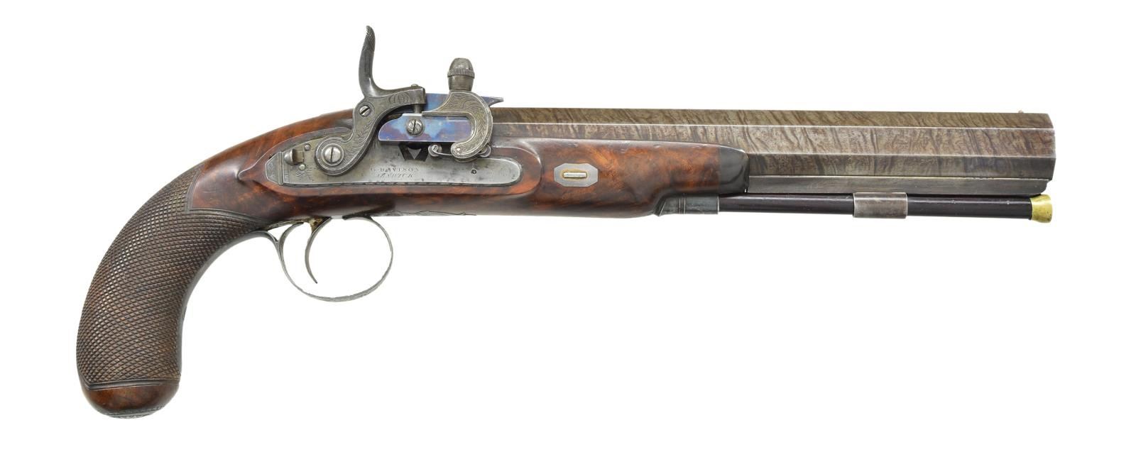 CONVERSIONS TO RARE FORSYTH SLIDING PRIMER PERCUSSION SYSTEM WITH CASE AND ACCESSORIES. Cal. 52 smooth bore (both). NSN (both). This pair of good quality heavy barreled pistols were originally flintlock and made around 1812. Shortly thereafter they were fitted with Forsyth patent sliding primer systems. This was an improvement on the earlier and well known scent bottle design. It used a priming powder magazine accessed by egg shaped covers on a sliding reservoir. When cocking the hammer an attached link pulls the reservoir to the rear allowing a small amount of priming powder to enter a depression at the end of a drum conversion installed in place of the touch hole. In firing, the reservoir is automatically pushed to the front exposing priming powder to the firing pin on hammer nose. These pistols have 10" heavy octagon skelp twist barrels with under ribs. Patent breeches with gold lines at rears have deeply inset gold poincon marked "G. DAVISON" " ALNWICK". Breech irons with armorial engraving are fitted with "V" notch rear sights. Chamfered locks with rebated, truncated tails are fitted with back sliding safetys. Lock plates are engraved with feather borders and with maker's name and address. Hammers and reservoirs of conversion parts are scroll engraved. Drums and associated slide bases are temper blued. Trigger plates have stylized pineapple finials. Trigger guards have drum and flag engraving on bows. Half stocks with horn tips and steel capped checkered bag grips are of dense figured root walnut. Stocks attach to barrels with captive side bolts through octagonal silver escutcheons. Purpleheart ramrods with small brass tips (one rod has brass tail) mount through single plain pipes and well filed thimbles. Rectangular gold crestplates with cut corners at tops of grips are engraved with perched falcons. UNATTACHED ACCESSORIES: guns are housed in their original mahogany case with inlet brass corners and small flush mounted "D" ring circular handle. Central medallion is engraved with a monogram "FS"?. Interior of case is lined in light reddish patterned cloth, Davison label is in lid, case contains steel round ball mold marked "Davison" which has pivoting sprue cutter, two patch cutters; the larger is marked "Davison", the smaller "34". Rosewood and brass loading rod, black leather covered two compartment powder and ball flask by Hawksley. Two covered compartments with bone handles are present; one containing cut wads and a key with bone tag inscribed "DAVISON ALNWICK". CONDITION: very fine. Barrels retaining over 80% of what appears to be their original brown twist finish. A fair amount of case hardening color remains on patent breeches. Locks retain some color remaining after conversion; most original blue remains on conversion parts as well as trigger guards and buttcaps. Stocks retain most of their possibly original oil finish with a fair number of scratches and bumps. Bores are bright and shiny, mechanically fine except one pistol will not hold at full cock (probably gummed). Case exterior has most of its oil refinish over some cracks. Interior cloth is good, considerably stained and rubbed. Label is fair to good with minor chips, bumps and rubs. Accessories are generally good. A desirable pair of pistols; this variation of Forsyth's patent is quite scarce. (01-21942/MGM). ANTIQUE. $10,000-20,000.
