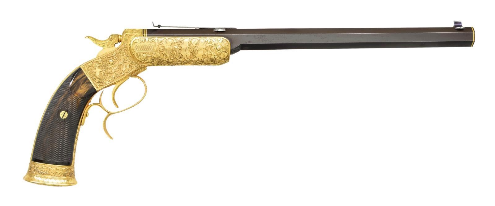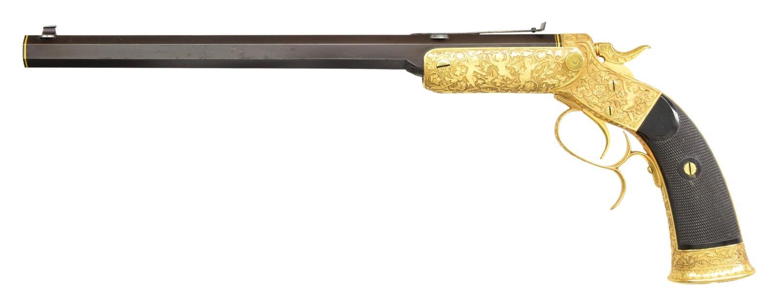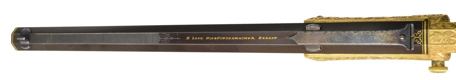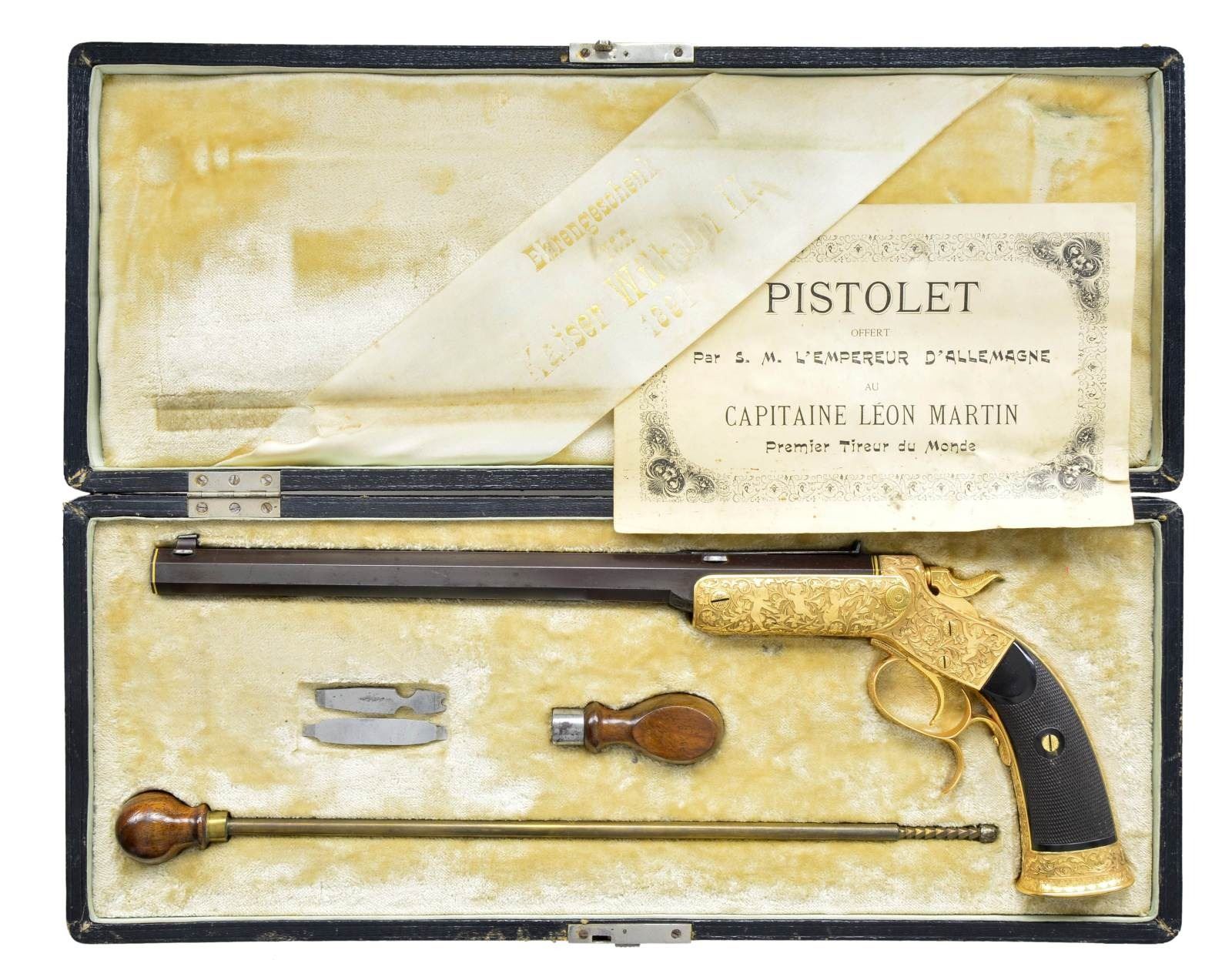 PISTOL PRESENTED BY KAISER WILHELM II TO CAPTAIN LEON MARTIN, THE PREMIER SHOOTER OF THE WORLD. Cal. 7. 65mm CF. NSN. Spectacular highly finished German copy of the Stevens Lord target pistol. Inscription on its case and presentation card indicate this fabulous pistol was a noble gift from Kaiser Wilhelm II, to shooting match champion Captain Leon Martin. Bbl. 11 5/8" octagon with bead front sight and u-notch rear sight having a fine browned finish. Top flat has gold inlaid marking "H. Leue Hofbuchsenmacher, Berlin". Forward portion of flat has straight-line hand cut matting ending in a scroll and geometric highlight. Both ends of Bbl. have gold inlaid bands, rear band is accented by gold scroll. Stevens Lord style tip up action has full gold plated finish. Full coverage Germanic deep relief engraving features 4 cherubs on each side of the receiver with a grotesque mask on the bottom and a winged angel behind the hammer. Figures are surrounded by foliate scroll with finely stippled backgrounds. Matching scroll continues to grip straps, trigger guard, hammer and buttcap. Bottom of buttcap has intertwined initials "CW". Trigger and hammer spur are finely checkered. Two-piece ebony grips have fine borderless hand checkering. UNATTACHED ACCESSORIES: presentation box measures 18" by 7 1/4". Outside lid of box and ribboned banner on inside of lid have gold German language marking "Ehrengeschenk/von/Kaiser Wilhelm II./1894". White cloth fitted interior holds wood handled brass cleaning rod and turn screw with interchangeable blades. CONDITION: very fine. Action retains nearly all gold plated finish. Bbl. retains 98% browned finish showing slight edge wear and scattered light marks. Bright bore retains sharp rifling. Grips have very good finish and checkering, right panel has small chips at action. Exterior of case shows wear with small tears in covering at corners. Case interior shows age-related discoloring and wear spots. A cased engraved pair of Smith & Wesson #2 revolvers formerly in the Harold's Club Collection was presented to Captain Martin by the Prince de Galles Roi de Angleterre. (01 – 21880/DS). ANTIQUE. $10,000 – 15,000.