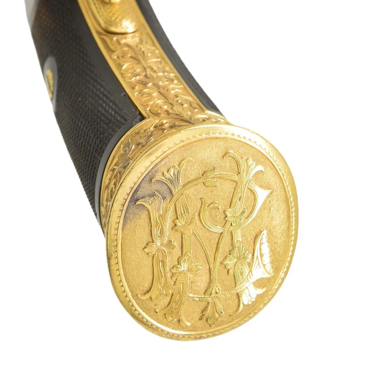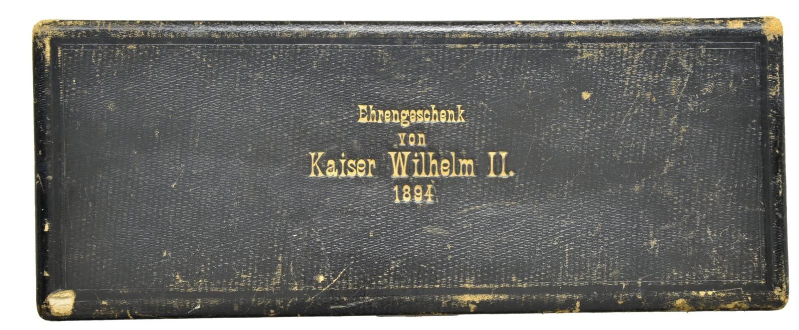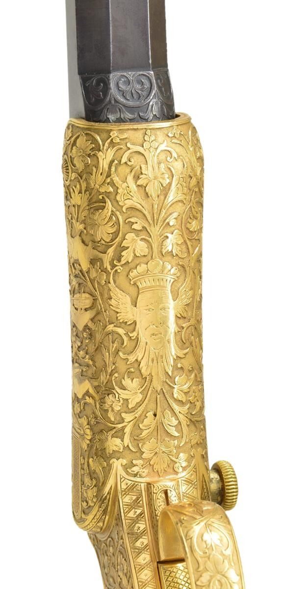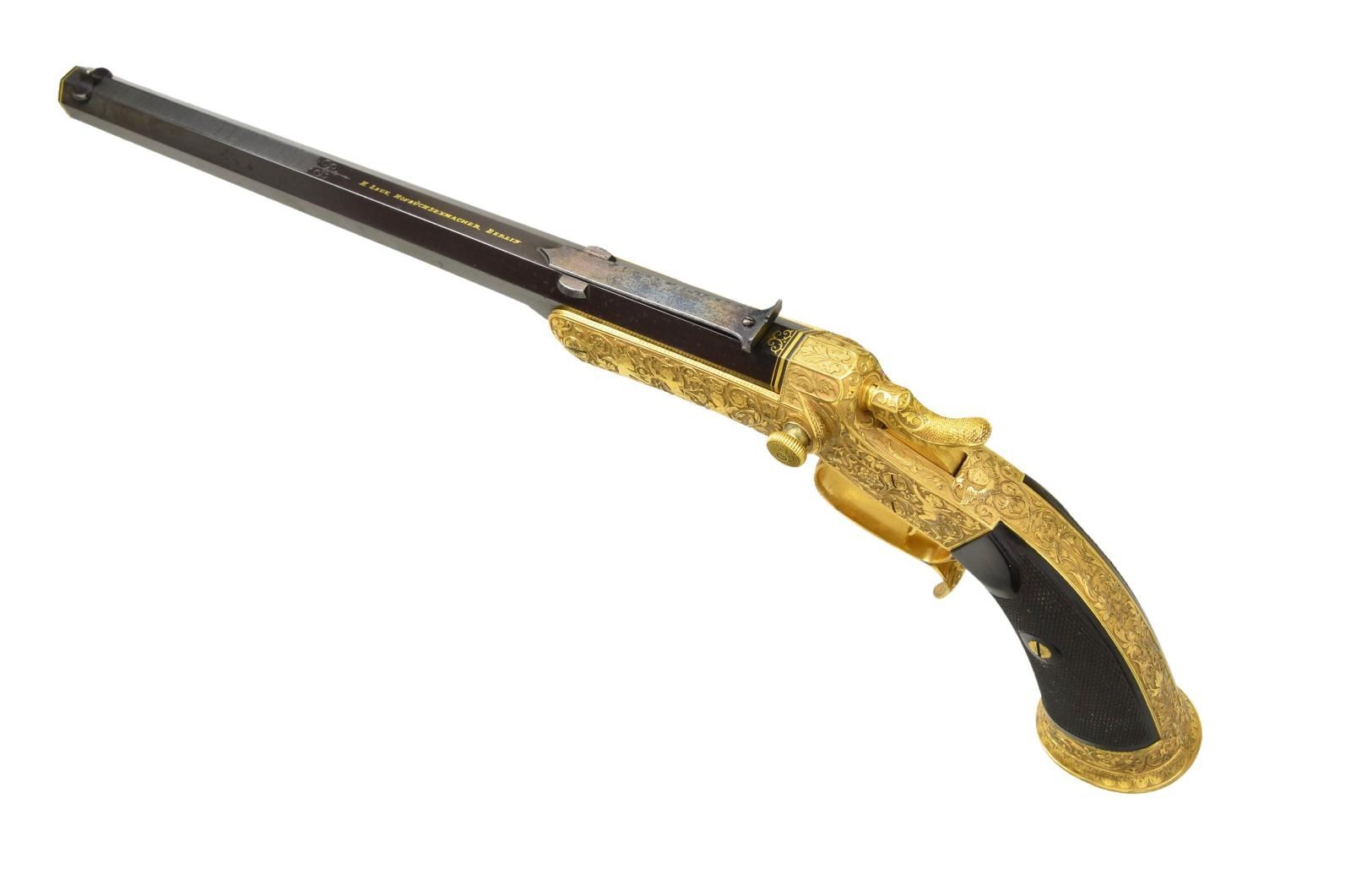 PISTOL PRESENTED BY KAISER WILHELM II TO CAPTAIN LEON MARTIN, THE PREMIER SHOOTER OF THE WORLD. Cal. 7. 65mm CF. NSN. Spectacular highly finished German copy of the Stevens Lord target pistol. Inscription on its case and presentation card indicate this fabulous pistol was a noble gift from Kaiser Wilhelm II, to shooting match champion Captain Leon Martin. Bbl. 11 5/8" octagon with bead front sight and u-notch rear sight having a fine browned finish. Top flat has gold inlaid marking "H. Leue Hofbuchsenmacher, Berlin". Forward portion of flat has straight-line hand cut matting ending in a scroll and geometric highlight. Both ends of Bbl. have gold inlaid bands, rear band is accented by gold scroll. Stevens Lord style tip up action has full gold plated finish. Full coverage Germanic deep relief engraving features 4 cherubs on each side of the receiver with a grotesque mask on the bottom and a winged angel behind the hammer. Figures are surrounded by foliate scroll with finely stippled backgrounds. Matching scroll continues to grip straps, trigger guard, hammer and buttcap. Bottom of buttcap has intertwined initials "CW". Trigger and hammer spur are finely checkered. Two-piece ebony grips have fine borderless hand checkering. UNATTACHED ACCESSORIES: presentation box measures 18" by 7 1/4". Outside lid of box and ribboned banner on inside of lid have gold German language marking "Ehrengeschenk/von/Kaiser Wilhelm II./1894". White cloth fitted interior holds wood handled brass cleaning rod and turn screw with interchangeable blades. CONDITION: very fine. Action retains nearly all gold plated finish. Bbl. retains 98% browned finish showing slight edge wear and scattered light marks. Bright bore retains sharp rifling. Grips have very good finish and checkering, right panel has small chips at action. Exterior of case shows wear with small tears in covering at corners. Case interior shows age-related discoloring and wear spots. A cased engraved pair of Smith & Wesson #2 revolvers formerly in the Harold's Club Collection was presented to Captain Martin by the Prince de Galles Roi de Angleterre. (01 – 21880/DS). ANTIQUE. $10,000 – 15,000.