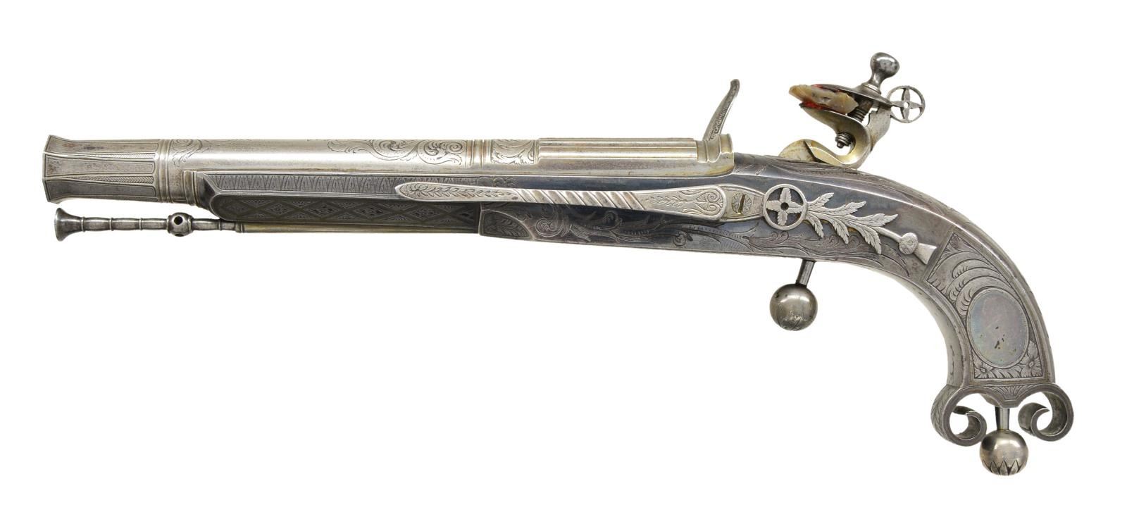 Cal. 52. S# NSN. Queen Victoria and Prince Albert visited Scotland shortly after their marriage and this sparked a renewed interest in all things Scottish. This exceptionally well made early style pistol is by William MacLauchlan who was working in Edinburgh between 1806-1847. In style it resembles the classic pistols made by Murdoch and others in the area around Doune in the early 18th century. It has 7 5/8" barrel with fluted rear section which transitions to round with wedding band and then to octagonal through another band toward flared muzzle. Touch hole is gold lined. Correctly styled lock with Miquelet sear is fitted with serpentine cock, waterproof pan, bridled roller frizzen with roller on feather spring which has bulbous finial. Cock is decorated with Doune style star at top. All metal frame has rams horn butt and is fitted with ball trigger and matching ball vent pick. A belt hook with well filed thistle finial is affixed to left side of frame. Pistol is extensively decorated with inlaid silver lines as border for oval silver panels on sides of grip. Silver inlay also extends to front part of frame under barrel and cruciform areas at top of grip and bottom of frame in front of trigger. Frame, barrel and lock are engraved with near full coverage interplay of scrolls, acanthus and flowers. Lockplate is engraved "MacLauchlan" "EDINBURGH" under a coiled sea monster. CONDITION: fine to very fine. Showing some wear but pistol does not appear to have been fired. Barrel, lock and belt hook were originally polished bright and are mostly silver to gray with some light scattered pitting. Frame retains about 30% original bright blue which is quite strong where protected. Silver is quite dark. Bore is bright and shiny. Mechanically fine. (01-21917/MGM). ANTIQUE. $10,000-15,000.