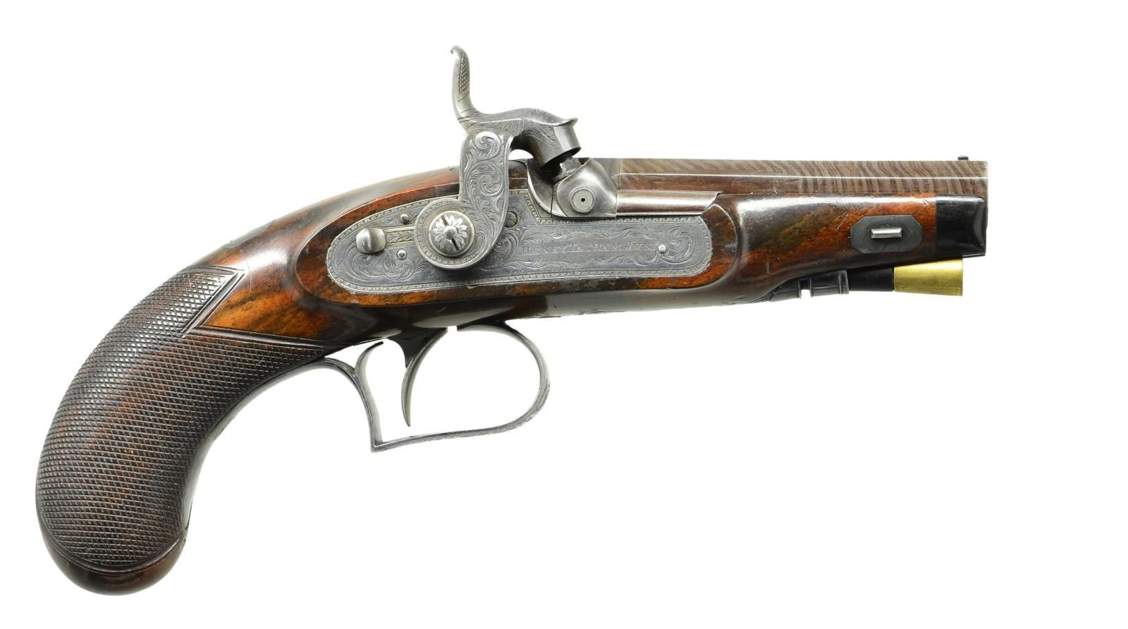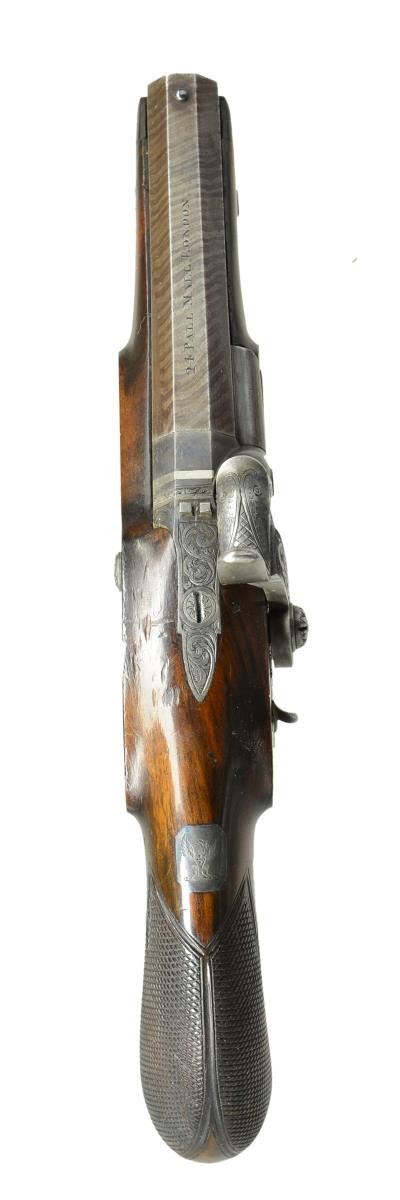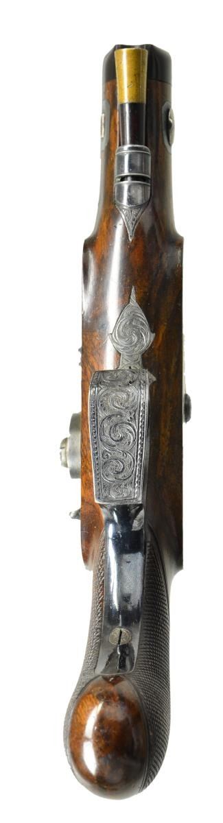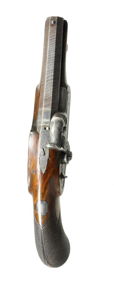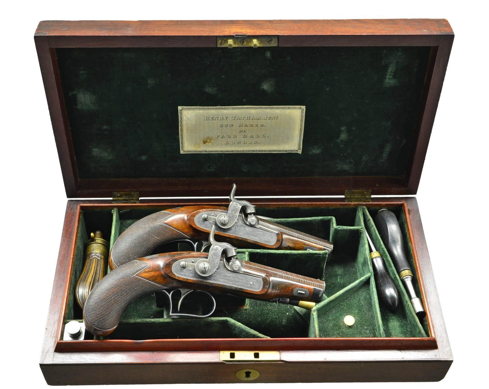 HENRY TATHAM JR. WITH ACCESSORIES. Cal. 38. NSN. Henry Tatham was a well known London gunmaker working until around 1835, best remembered for his contract with the British Board of Ordinance to supply presentation rifles for the chiefs of the five Native American Nations for their help during the war of 1812. The pistols presented here were made by his son, Henry Jr. between 1824-34 when he was at his 24 Pall Mall address. They have 3 1/2" twist octagon barrels w/ top flats engraved "24 Pall Mall London". Patent breeches are case hardened & inlaid with platinum bands & have vented platinum blow outs. Breech irons with integral u-notch rear sights are nicely scroll engraved. Front spring, small size, percussion locks w/ flat faced hammers having dolphin heads, are fitted with back sliding safetys, which engage at half cock. Locks & hammers are engraved w/ 80% coverage well cut open shaded scroll. Each lockplate is also engraved "Henry Tatham Junr". European root walnut stocks w/ bag grips extend to muzzles with horn caps. Iron mounts include square shouldered trigger guards w/ stylized pineapple finials & nicely filed thimbles holding short rosewood ramrods with brass tips & tails (worms under both tails). Blued trigger guards are scroll engraved "en suite" with locks. Grips are nicely checkered. There are rectangular silver crest plates at tops of grips depicting Griffin rampant, wings extended which have a cross on their chests. UNATTACHED ACCESSORIES: Guns are housed in their original mahogany case with circular brass medallion on top, and brass key escutcheon. Case is lined in green velvet & has Henry Tatham Jr. paper label with Pall Mall address in lid. Bottom compartment is nicely fitted for pistols & original type accessories including small fluted copper bodied power flask by Hawksley. A steel nutcracker type ball mold engraved "76", a small square steel oil bottle, ebony handled nipple wrench with pricker & an ebony handled small turn screw. Two covered compartments with bone knobs on covers are present, one contains a large number of cast balls. CONDITION: very fine, barrels retaining 80-90% original brown finish with excellent definition of pattern. Locks & breech irons retain about 80% of their original case hardening color. Trigger guards retain over 90% original bright blue. Stocks retain about 90% French polish finish, with considerable marking on sides. Bores are very fine, smooth & shiny. Mechanically fine. Case is also very fine, exterior retaining most of its original varnish. There is some minor loss of wood in front of locking mechanism. Interior cloth is fine, with some rubs & light soiling. Label is very fine with some compressions from one pistol & some light soiling. Partitions are good, a few somewhat loose. Accessories are generally fine, mould showing heat discoloration. (01-21912/MGM). ANTIQUE. $8,000-12,000.