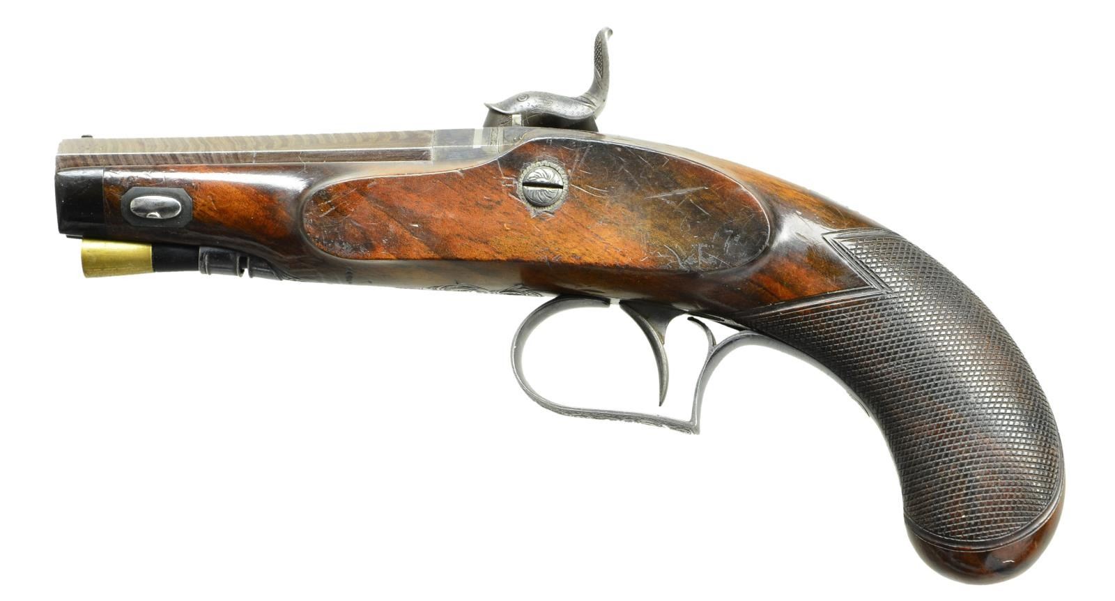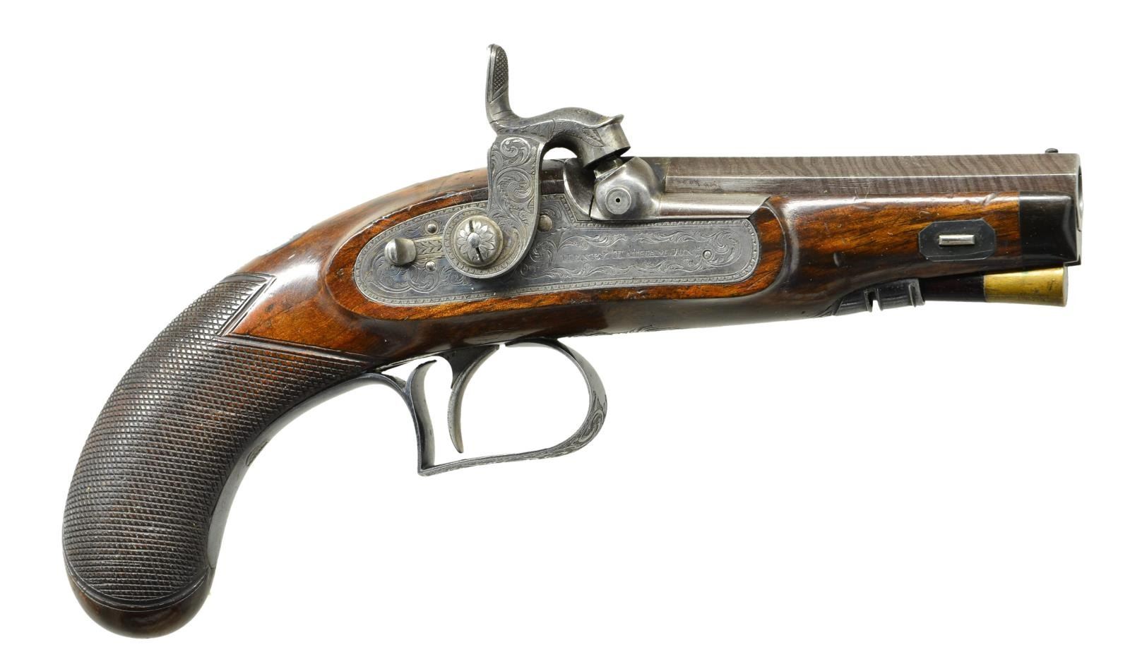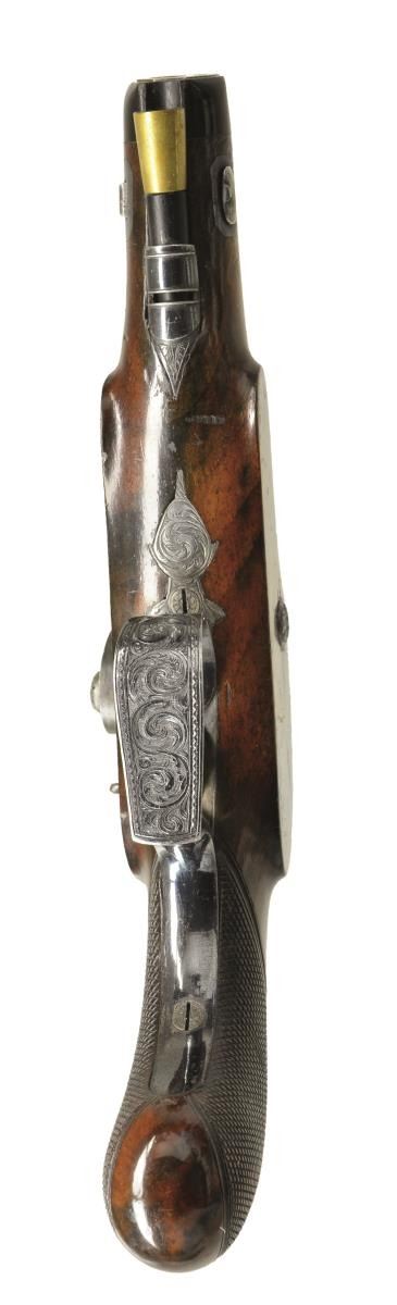 HENRY TATHAM JR. WITH ACCESSORIES. Cal. 38. NSN. Henry Tatham was a well known London gunmaker working until around 1835, best remembered for his contract with the British Board of Ordinance to supply presentation rifles for the chiefs of the five Native American Nations for their help during the war of 1812. The pistols presented here were made by his son, Henry Jr. between 1824-34 when he was at his 24 Pall Mall address. They have 3 1/2" twist octagon barrels w/ top flats engraved "24 Pall Mall London". Patent breeches are case hardened & inlaid with platinum bands & have vented platinum blow outs. Breech irons with integral u-notch rear sights are nicely scroll engraved. Front spring, small size, percussion locks w/ flat faced hammers having dolphin heads, are fitted with back sliding safetys, which engage at half cock. Locks & hammers are engraved w/ 80% coverage well cut open shaded scroll. Each lockplate is also engraved "Henry Tatham Junr". European root walnut stocks w/ bag grips extend to muzzles with horn caps. Iron mounts include square shouldered trigger guards w/ stylized pineapple finials & nicely filed thimbles holding short rosewood ramrods with brass tips & tails (worms under both tails). Blued trigger guards are scroll engraved "en suite" with locks. Grips are nicely checkered. There are rectangular silver crest plates at tops of grips depicting Griffin rampant, wings extended which have a cross on their chests. UNATTACHED ACCESSORIES: Guns are housed in their original mahogany case with circular brass medallion on top, and brass key escutcheon. Case is lined in green velvet & has Henry Tatham Jr. paper label with Pall Mall address in lid. Bottom compartment is nicely fitted for pistols & original type accessories including small fluted copper bodied power flask by Hawksley. A steel nutcracker type ball mold engraved "76", a small square steel oil bottle, ebony handled nipple wrench with pricker & an ebony handled small turn screw. Two covered compartments with bone knobs on covers are present, one contains a large number of cast balls. CONDITION: very fine, barrels retaining 80-90% original brown finish with excellent definition of pattern. Locks & breech irons retain about 80% of their original case hardening color. Trigger guards retain over 90% original bright blue. Stocks retain about 90% French polish finish, with considerable marking on sides. Bores are very fine, smooth & shiny. Mechanically fine. Case is also very fine, exterior retaining most of its original varnish. There is some minor loss of wood in front of locking mechanism. Interior cloth is fine, with some rubs & light soiling. Label is very fine with some compressions from one pistol & some light soiling. Partitions are good, a few somewhat loose. Accessories are generally fine, mould showing heat discoloration. (01-21912/MGM). ANTIQUE. $8,000-12,000.