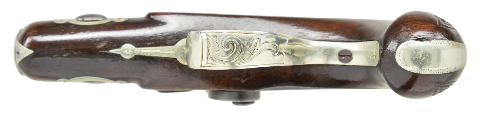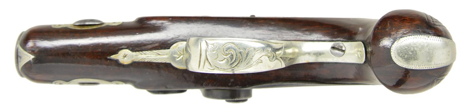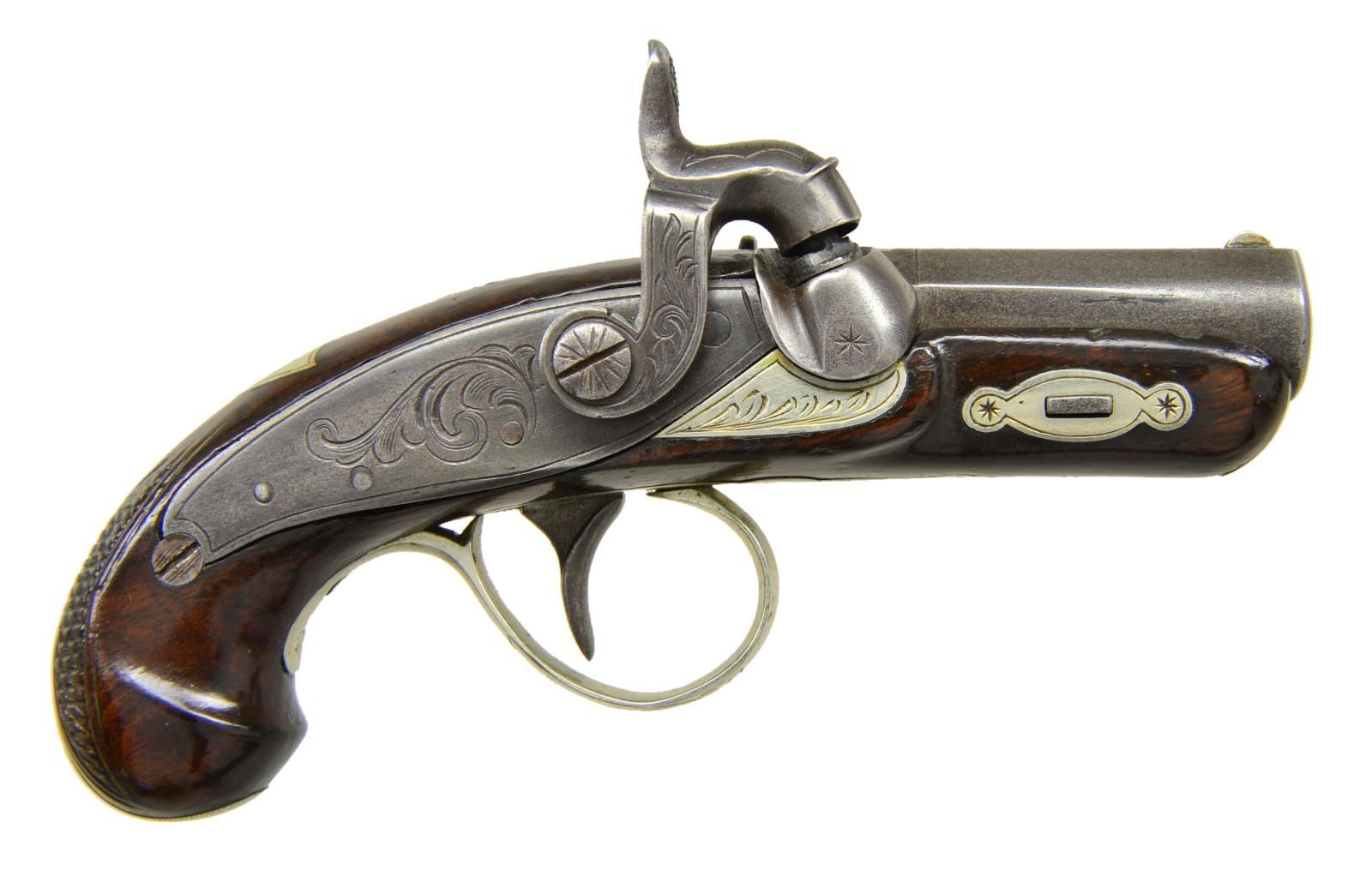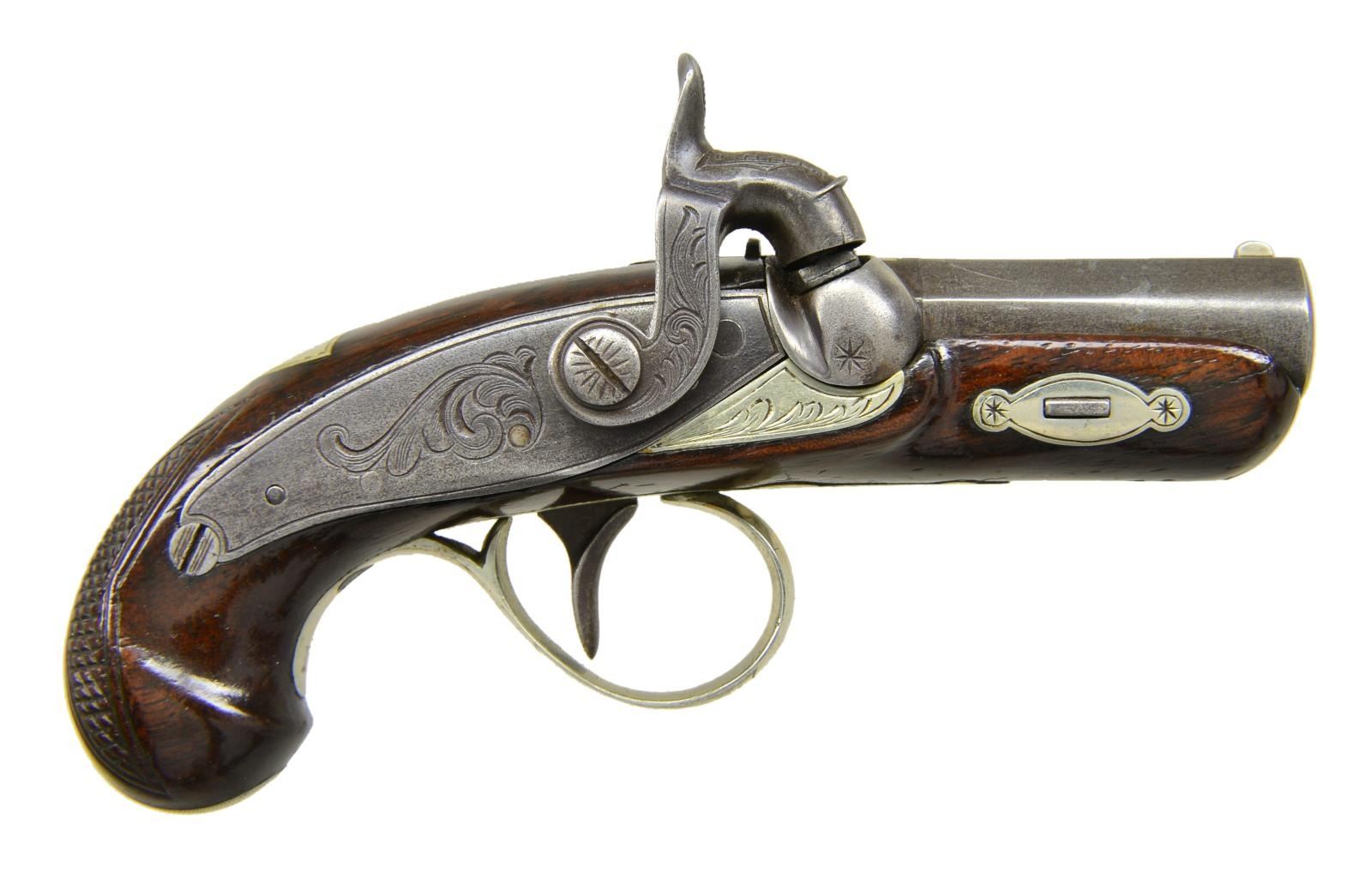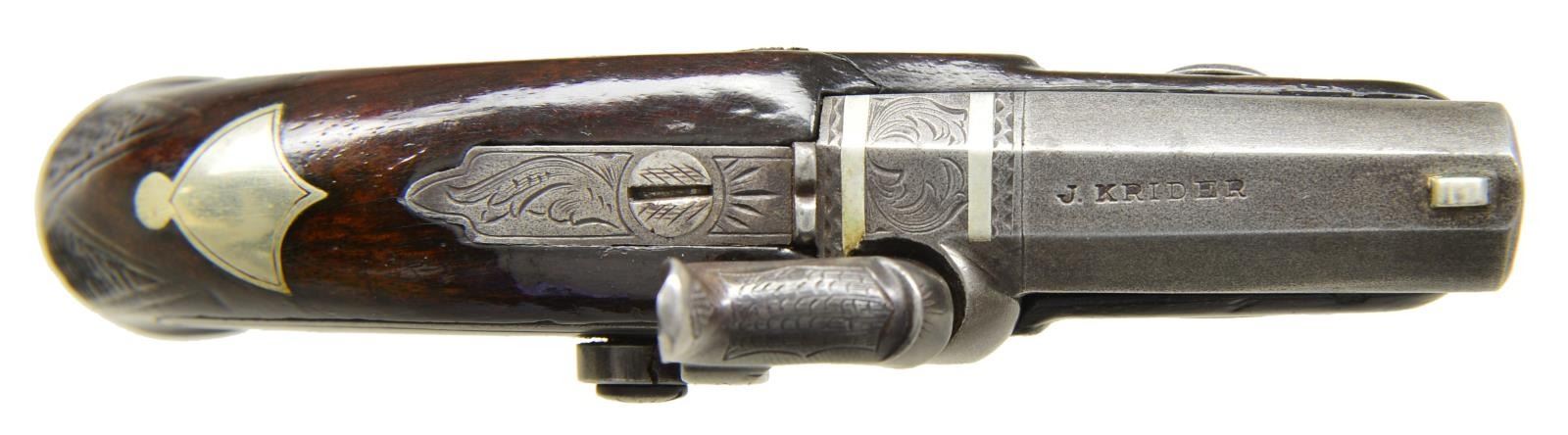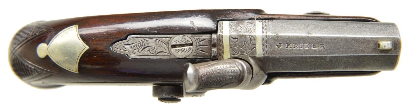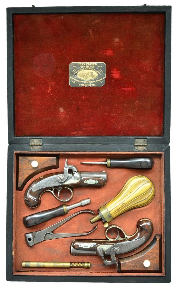 TYPE PERCUSSION POCKET PISTOLS WITH ACCESSORIES. Cal. 41. NSN. The famous firm of John Krider of Philadelphia, PA made pocket percussion pistols which were very similar to the popular guns by Henry Deringer. This pair have 2" rifled barrels. Breech sections are separate and are inlaid with 2 German silver bands. Tops of barrels are marked "J. KRIDER". Small size back spring percussion locks are fitted with flat faced hammers. Walnut stocks with small checkered bag grips are German silver mounted. Locks and mounts have some scroll engraving. Shield shaped crest plates at tops of grips are unmarked. UNATTACHED ACCESSORIES: pistols are housed in a black Morocco leather covered case with dual hook closure. Interior of lid is lined in scarlet velvet and has small John Krider paper label attached. Bottom compartment is lined in red suede and is French fitted for pistols & accessories. Accessories include unmarked 3 1/2" powder flask with fluted copper body, ebony handled nipple wrench, ebony handled turn screw, nutcracker type bullet mould marked "90", & a brass loading rod. Two covered compartments have mahogany covers with bone handles & hold lead balls & past owners notes, stating that these pistols were once owned by Turner Kirkland. CONDITION: very good to fine, iron and steel with old cleaning to gray brown. Stocks with varnish refinish. German silver cleaned and remains fairly bright. Case leather fine with some marks, possibly renewed. Interior cloth of top and label are good with some impressions. Bottom compartment is also fine, accessories are good. Condition matching pistols. (01-21850/MGM). ANTIQUE. $7,000-10,000.