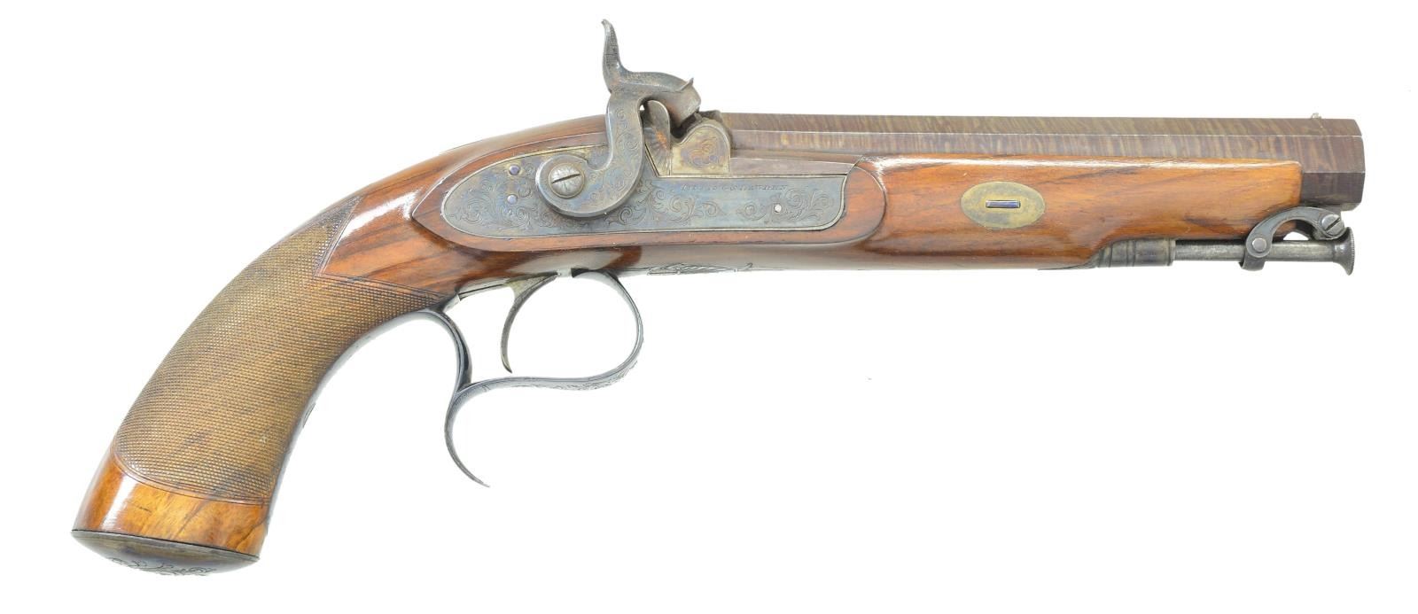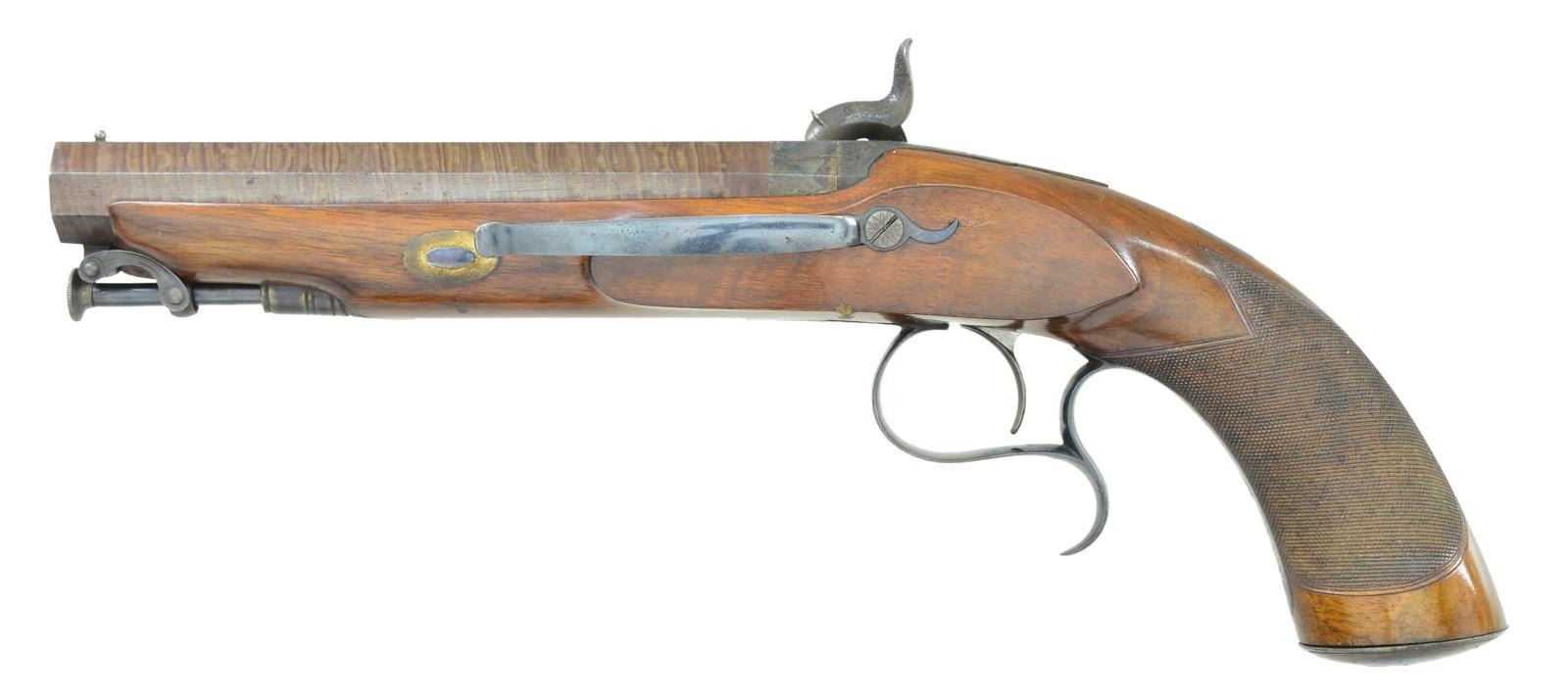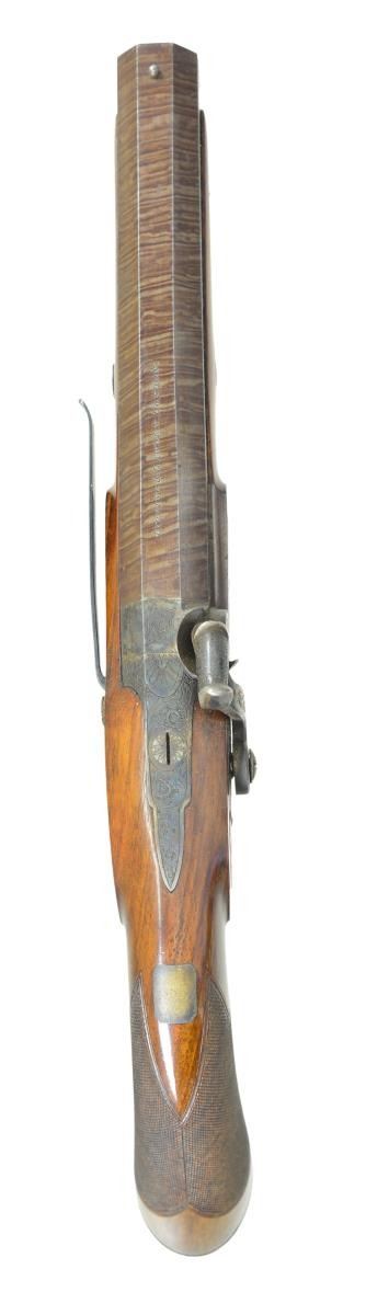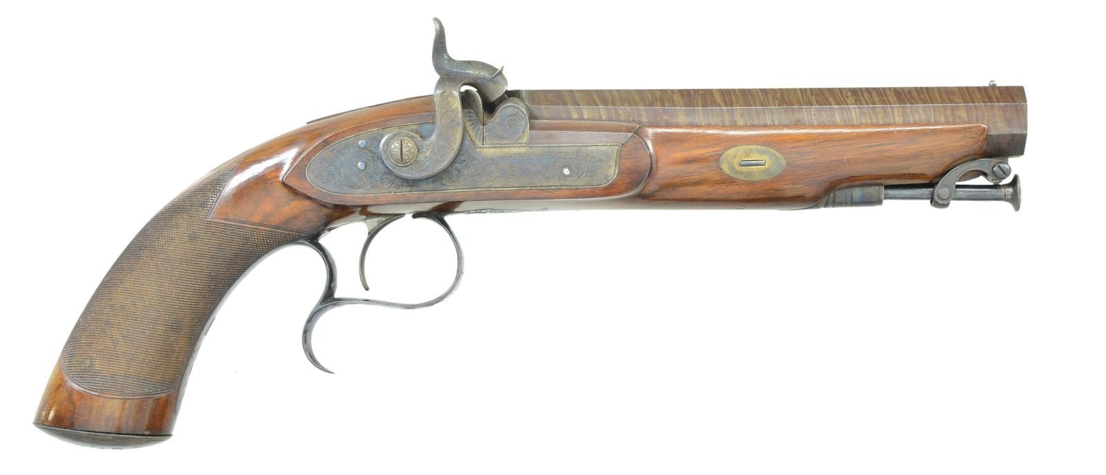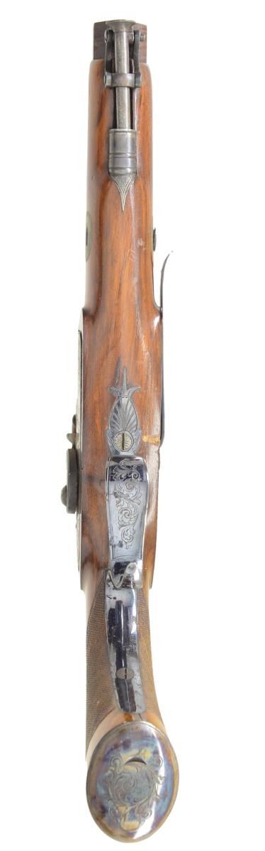 BELT PISTOLS. Cal. 65. NSN. Bbl. 6 7/8” of Twist steel w/ smoothbores & bead sights. Top flats are marked “Tipping & Lawden, London”. Patent beech, top tangs, locks & hammers have vine type foliate scroll hand engraving & case colored finish. Wedge fastened walnut stocks w/ fine hand checkered wrists. Trap door butt caps are case colored & engraved. Blue finished engraved finger curl trigger guards have pineapple finials. Left side belt hooks. Case colored faceted pipes w/ button tipped swivel ramrods. German silver oval wedge escutcheons. UNATTACHED ACCESSORIES: vintage English trade case w/ folding handle in lid. Green felt fitted interior. Case contains powder flask, bullet mold, ebony ramrod, ebony handle turnscrews, cleaning accessories, cap tins, spare nipple & round balls. CONDITION: both very fine. Bbls. retain over 90% fine brown finish showing vivid twist pattern w/ scattered spots of surface corrosion. Belt hooks also show small spots of surface corrosion. German silver escutcheon wedges have acquired a dark tarnish. Stocks have very good original finish showing scattered small marks. Actions are sound. Both bores show some light pitting. (01-23116/DS). ANTIQUE. $5,000-8,000.