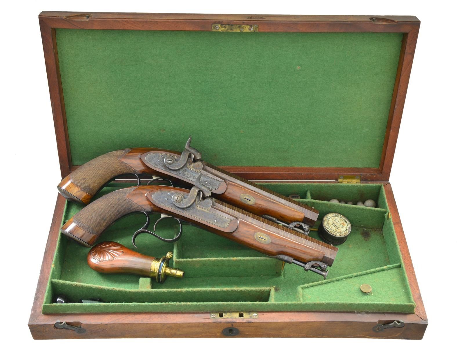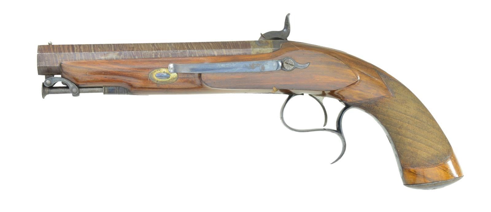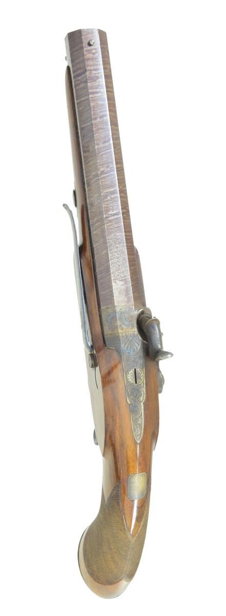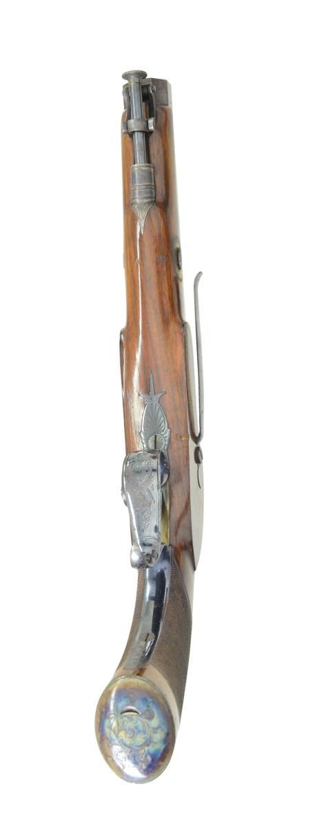 BELT PISTOLS. Cal. 65. NSN. Bbl. 6 7/8” of Twist steel w/ smoothbores & bead sights. Top flats are marked “Tipping & Lawden, London”. Patent beech, top tangs, locks & hammers have vine type foliate scroll hand engraving & case colored finish. Wedge fastened walnut stocks w/ fine hand checkered wrists. Trap door butt caps are case colored & engraved. Blue finished engraved finger curl trigger guards have pineapple finials. Left side belt hooks. Case colored faceted pipes w/ button tipped swivel ramrods. German silver oval wedge escutcheons. UNATTACHED ACCESSORIES: vintage English trade case w/ folding handle in lid. Green felt fitted interior. Case contains powder flask, bullet mold, ebony ramrod, ebony handle turnscrews, cleaning accessories, cap tins, spare nipple & round balls. CONDITION: both very fine. Bbls. retain over 90% fine brown finish showing vivid twist pattern w/ scattered spots of surface corrosion. Belt hooks also show small spots of surface corrosion. German silver escutcheon wedges have acquired a dark tarnish. Stocks have very good original finish showing scattered small marks. Actions are sound. Both bores show some light pitting. (01-23116/DS). ANTIQUE. $5,000-8,000.