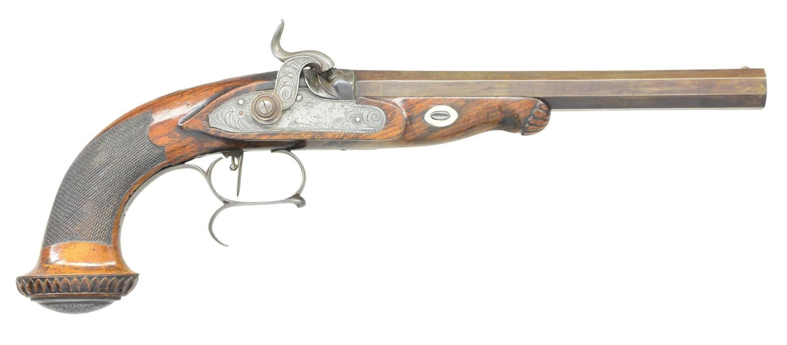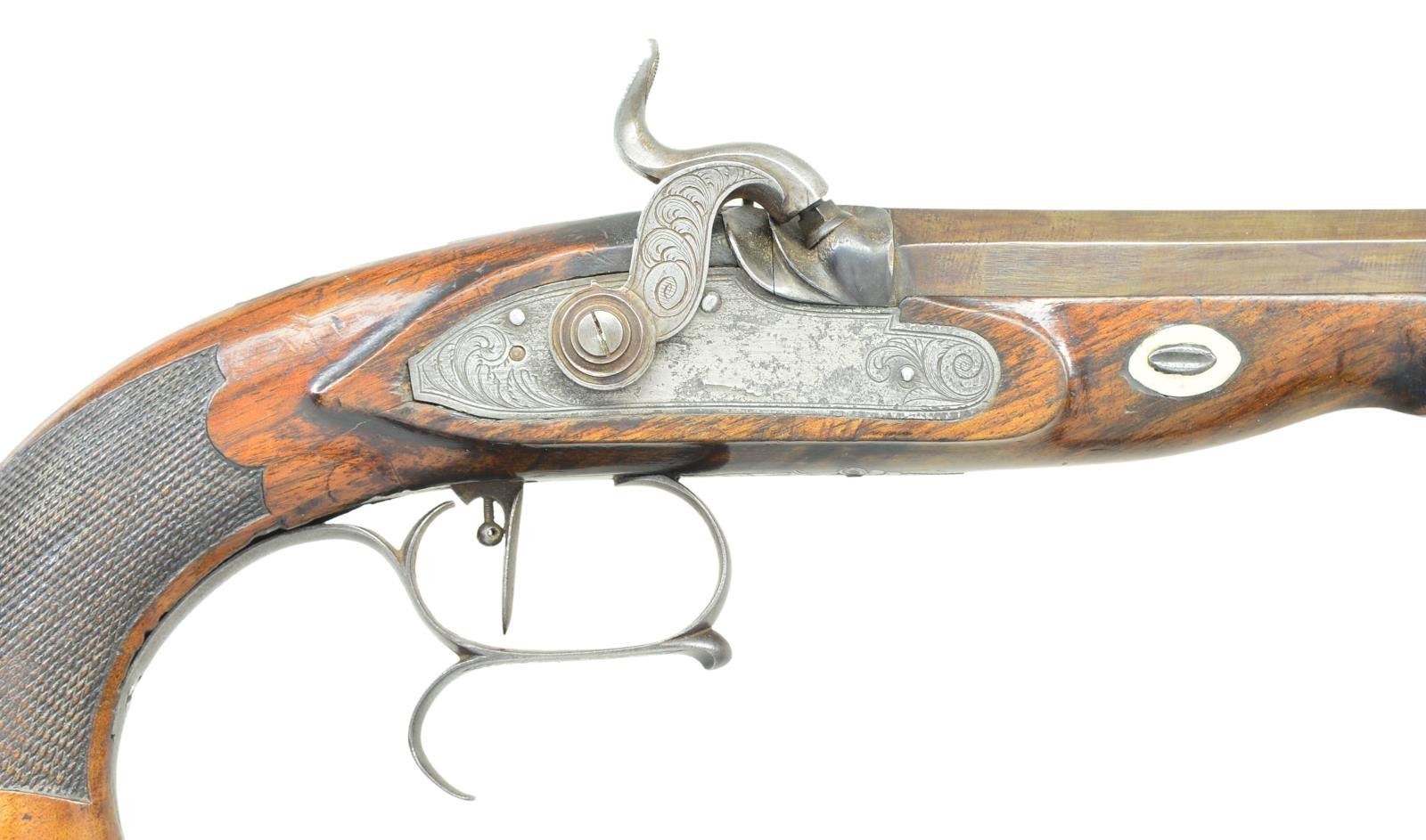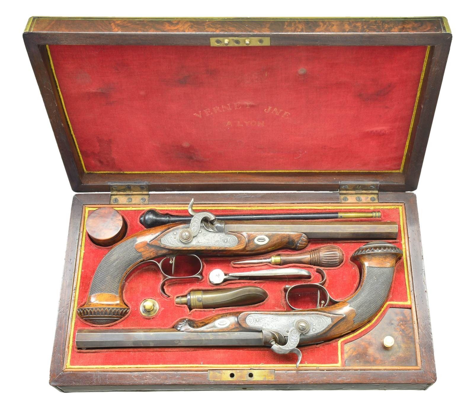 WITH ACCESSORIES. Cal. 50 (pr). S# 10898 (on bottoms of barrels). These good quality pistols are not maker marked. They have 9 1/2" octagon barrels with well filed patent breeches. Bottoms are stamped with S# and Belgian proofs are on left flats and the number "1" is on right flat of one pistol. Front spring locks with flat plates with square tails are fitted with flat faced hammers with deep turnings at pivots. Triggers are set. European walnut stocks with chip carved flared grips and steel caps are iron mounted. Trigger plates have foliate finials, trigger guards have finger spurs, sideplates are of bat wing shape. Metal parts are engraved with scroll. Stocks have checkered grips and do not have provision for ramrods. Schnabled forend tips have floral carvings. UNATTACHED ACCESSORIES: pistols are housed in what appears to be their original burl walnut veneered case with brass trim and central brass rectangle engraved "GEB". Interior is lined in scarlet cloth and has retailers name "VERNEY JNE" "A LYON". Bottom compartment with gold cord outline is French fitted for pistols and accessories which include, brass and ebony loading rod, copper bodied powder flask, rosewood handled turnscrew, nutcracker type ball mould and turned olive wood cap container. A covered compartment with bone knob holds some balls and a key which does operate lock. CONDITION: good as partially refinished. Barrels retaining most of an old brown, twist pattern somewhat visible. All other metal parts are cleaned to silver gray. Stocks retain most of what appears to be most of their original finish. Bores are good, multi-grooved rifling strong. Lock of one pistol is good; trigger sets. On the other the trigger does not set, it will cock but is difficult to fire. Case has newer French polish on exterior with some loss of brass trim. Interior cloth is good, soiled and with compressions. Accessories are good. (01-23019/MGM). ANTIQUE. $3,000-5,000.
