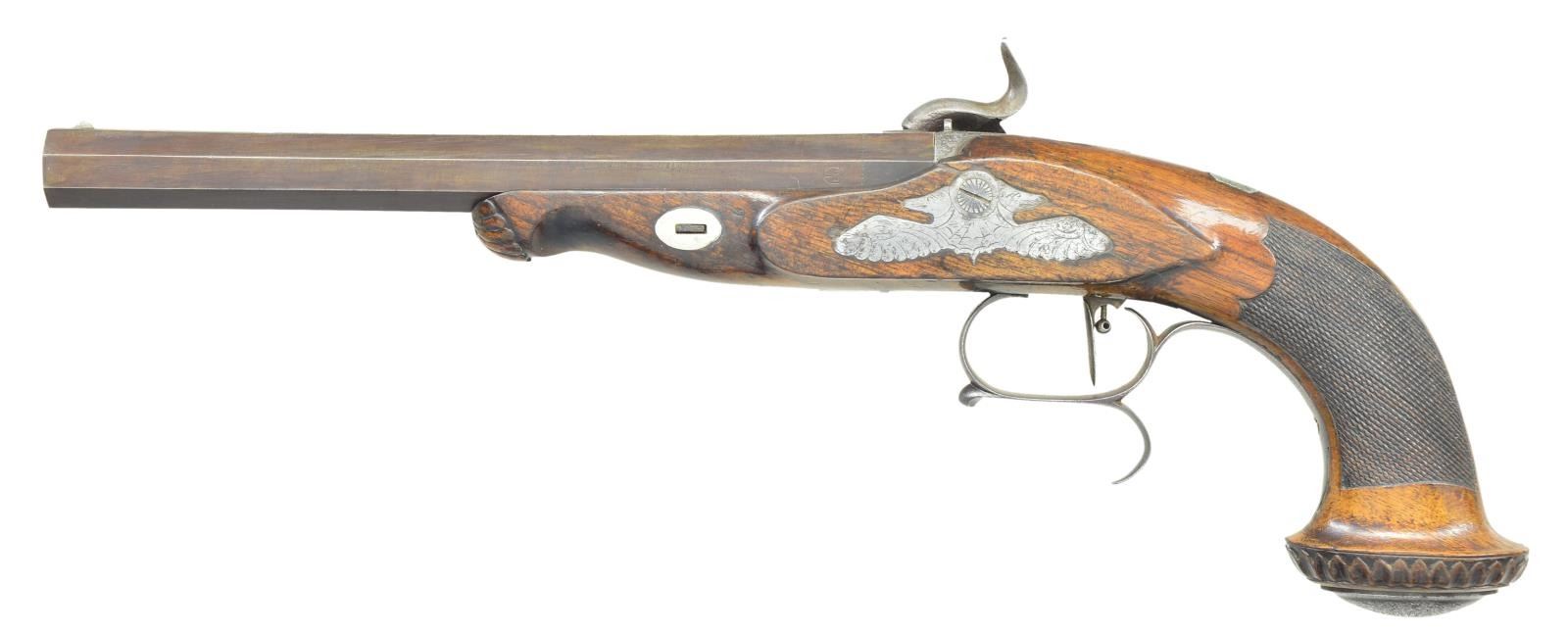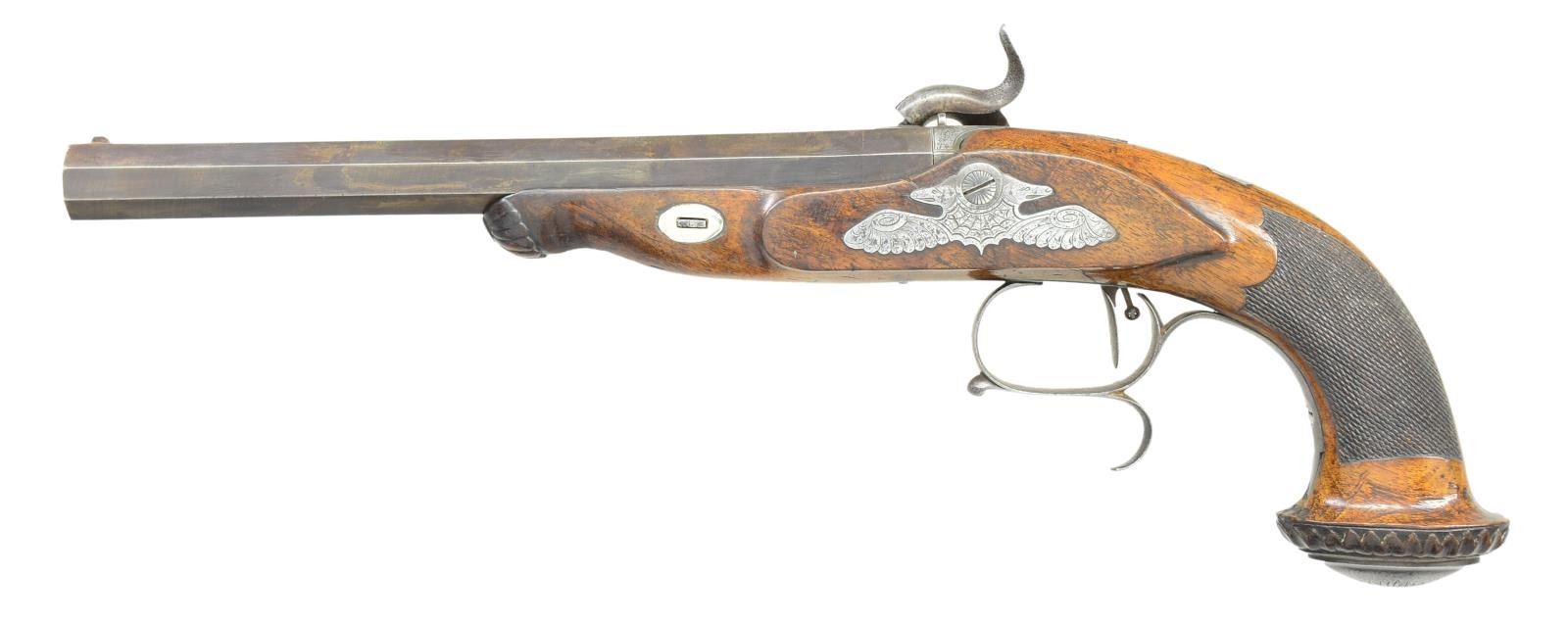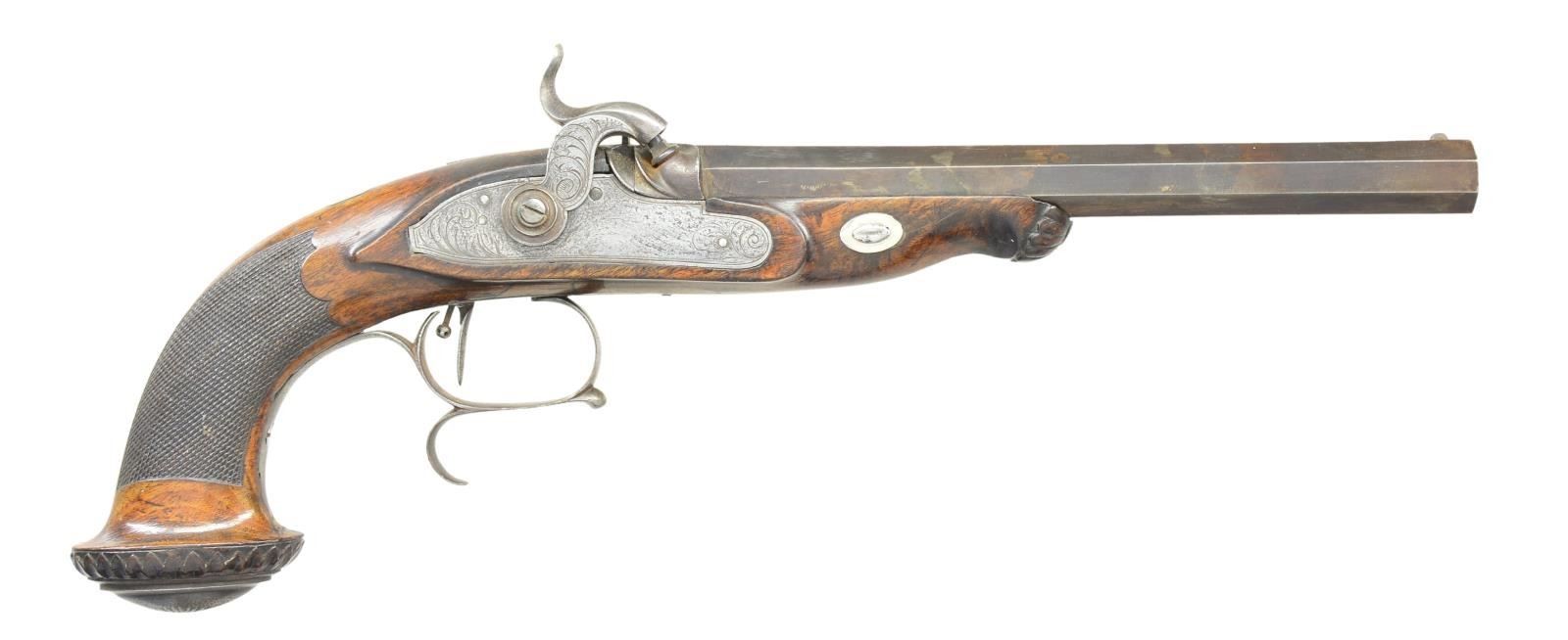 WITH ACCESSORIES. Cal. 50 (pr). S# 10898 (on bottoms of barrels). These good quality pistols are not maker marked. They have 9 1/2" octagon barrels with well filed patent breeches. Bottoms are stamped with S# and Belgian proofs are on left flats and the number "1" is on right flat of one pistol. Front spring locks with flat plates with square tails are fitted with flat faced hammers with deep turnings at pivots. Triggers are set. European walnut stocks with chip carved flared grips and steel caps are iron mounted. Trigger plates have foliate finials, trigger guards have finger spurs, sideplates are of bat wing shape. Metal parts are engraved with scroll. Stocks have checkered grips and do not have provision for ramrods. Schnabled forend tips have floral carvings. UNATTACHED ACCESSORIES: pistols are housed in what appears to be their original burl walnut veneered case with brass trim and central brass rectangle engraved "GEB". Interior is lined in scarlet cloth and has retailers name "VERNEY JNE" "A LYON". Bottom compartment with gold cord outline is French fitted for pistols and accessories which include, brass and ebony loading rod, copper bodied powder flask, rosewood handled turnscrew, nutcracker type ball mould and turned olive wood cap container. A covered compartment with bone knob holds some balls and a key which does operate lock. CONDITION: good as partially refinished. Barrels retaining most of an old brown, twist pattern somewhat visible. All other metal parts are cleaned to silver gray. Stocks retain most of what appears to be most of their original finish. Bores are good, multi-grooved rifling strong. Lock of one pistol is good; trigger sets. On the other the trigger does not set, it will cock but is difficult to fire. Case has newer French polish on exterior with some loss of brass trim. Interior cloth is good, soiled and with compressions. Accessories are good. (01-23019/MGM). ANTIQUE. $3,000-5,000.